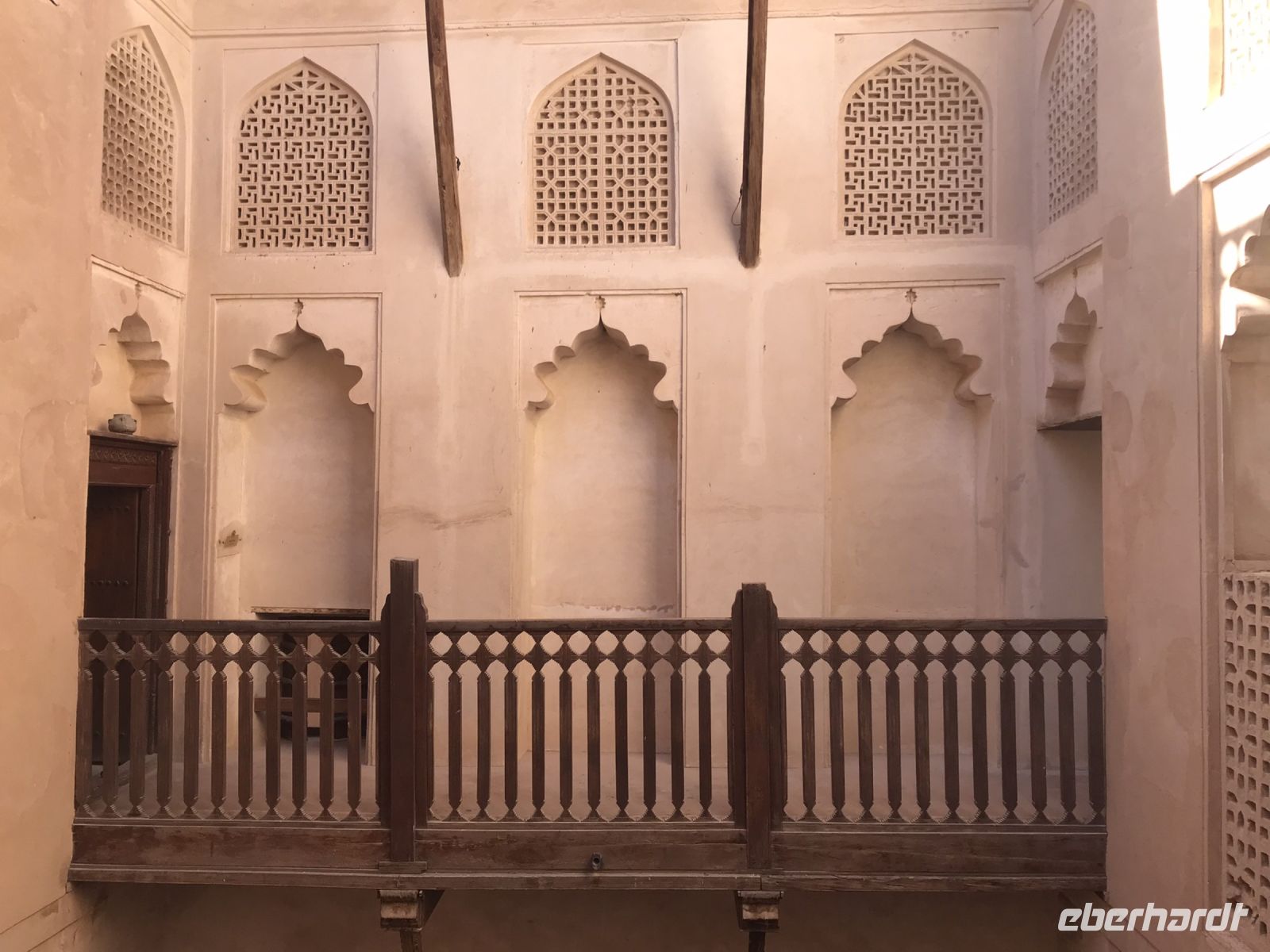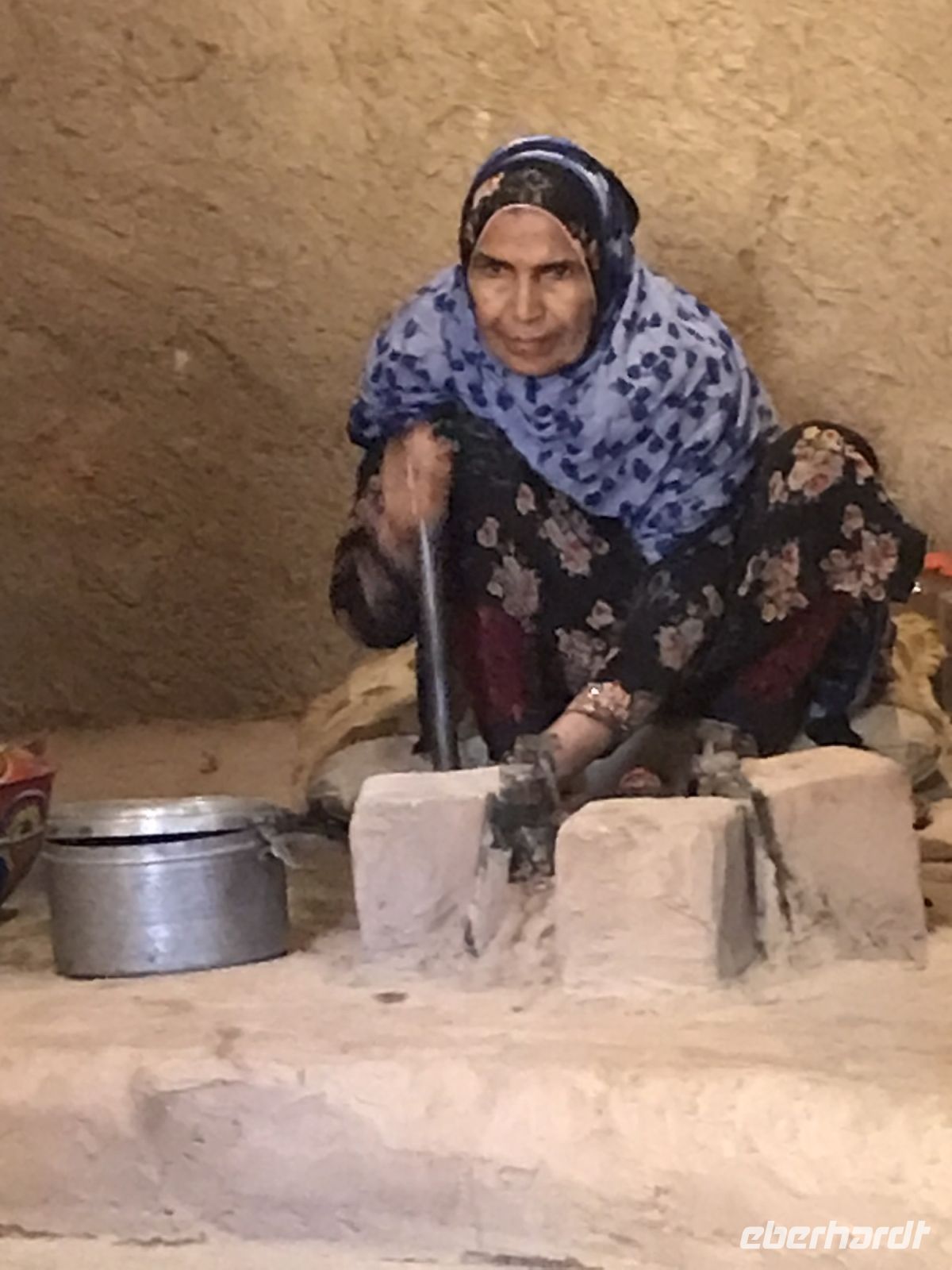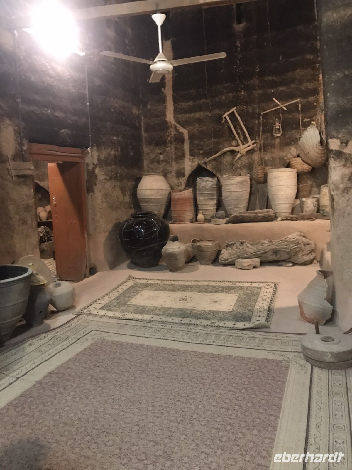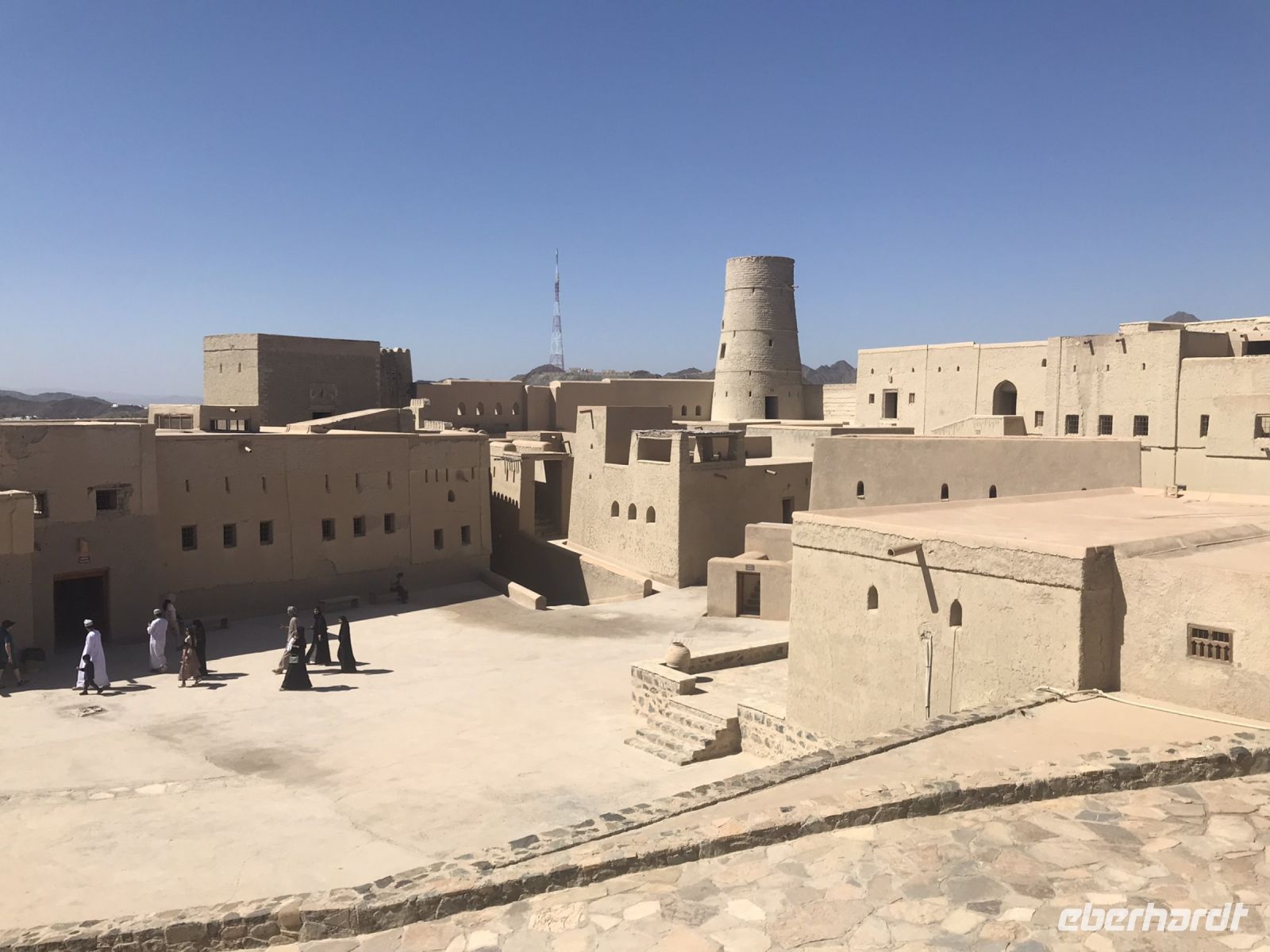 Inzwischen sind wir schon gut aklimatisiert. Wir kosten am üppig bestückten Buffet unseres Hotels die arabischen Spezialitäten und wir sitzen in den Pausen gern mit unseren Jeepfahrern in der Runde auf dem Boden, naschen Datteln und versuchen uns mit dem einen oder anderen arabischen Wort. Salam aleikum geht noch gut über die Lippen, aber das "wie geht es dir" auf Arabisch ist nicht so leicht zu merken. Aanaa bikhayr. Es ist eine schwere Sprache. Wir erkennen inzwischen auch, dass die Forts und Befestigungsanlagen zwar durchaus ähnlichen Zwecken gedient haben, aber ganz unterschiedlich in Architektur und Ausstattung sind. Jede einzelne Anlage eine Sehnswürdigkeit für sich. Schloss Jabreen mit den anschaulich ausgestatteten Räumlichkeiten und Bahla, ganz im Zeichen des Lehms, der in der gleißenden Sonne die Augen blendet. In einem kleinen Museum lernen wir, mit welch einfachen Mitteln und viel Handarbeit und Geschick die Frauen noch bis vor kurzem gebacken, Weizen gemahlen, Besen hergestellt oder Kaffee geröstet haben. Die Vorführung mutet an, wie aus einem anderen Jahrhundert, doch die handwerklichen Traditionen sind keinesfalls vergessen, sie werden geplegt und geachtet.
