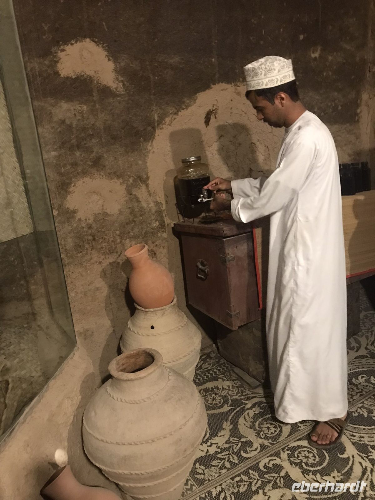 Nach so viel Augenweide werden unsere Sinne über den Geruch angesprochen. Wir besichtigen die Parfumfabik Amouage, die für sich in Anspruch nimmt, das teuerste und beste Parfum der Welt herzustellen. Es wurde entwickelt, damit die Sultane jeweils königliche Kostbarkeiten als Gastgeschenk für andere Herrscher zur Hand hatten. Alles ist handgemacht, kostbar, phantasievoll und hüllt uns in edle Düfte. Auch Kaffee und eine Schale mit Datteln stehen bereit. In den kommenden Tagen werden wir lernen, dass das nahezu überall der Fall ist als Ausdruck der sprichwörtlichen Gastfreundschaft und Offenheit der Omanis.