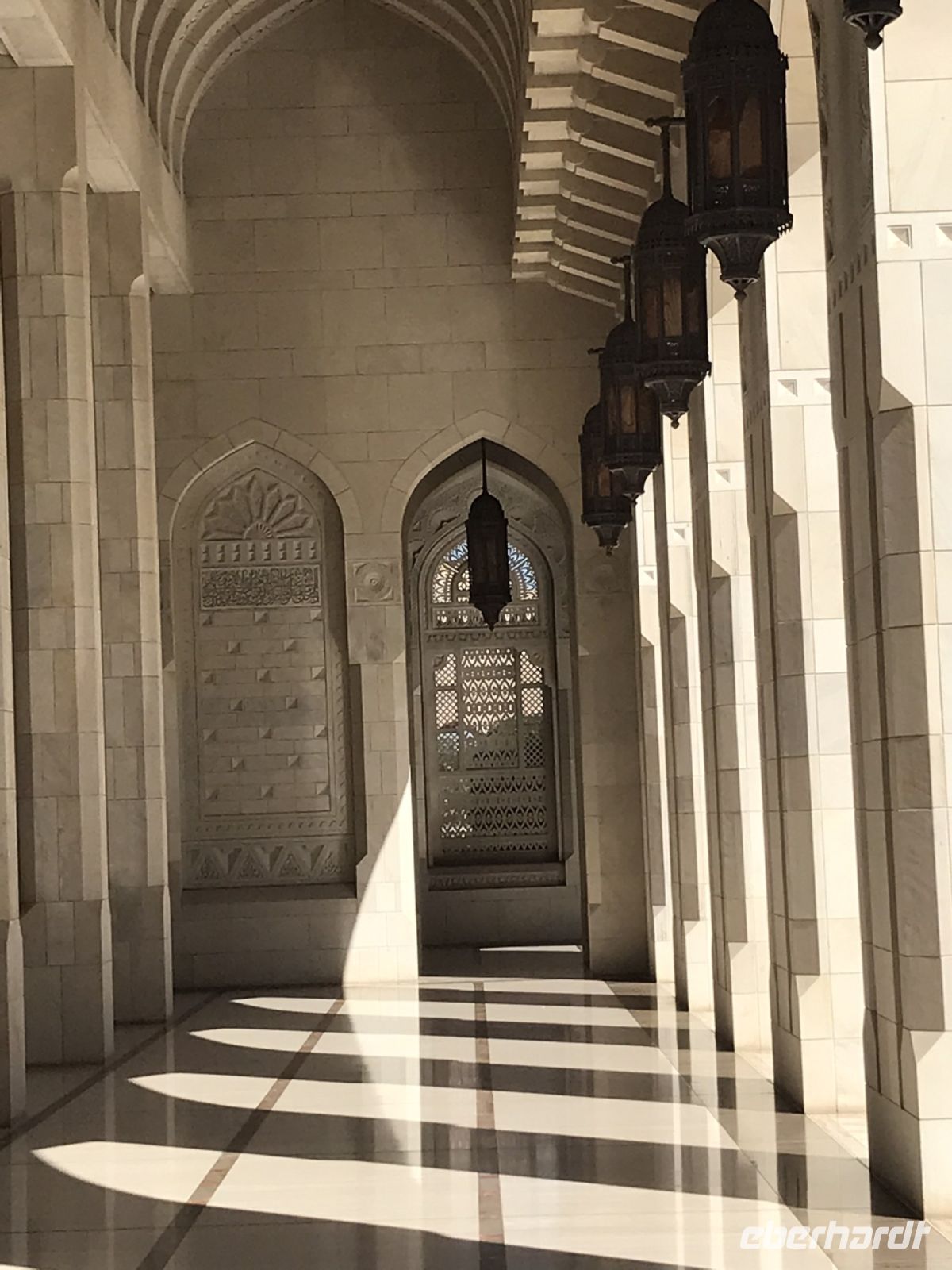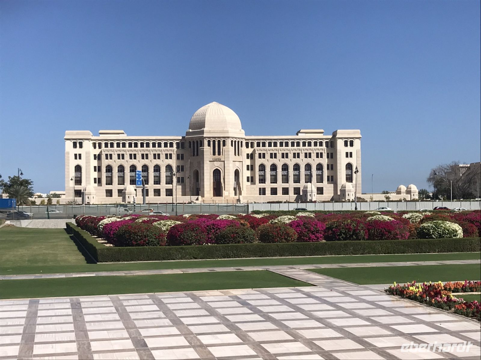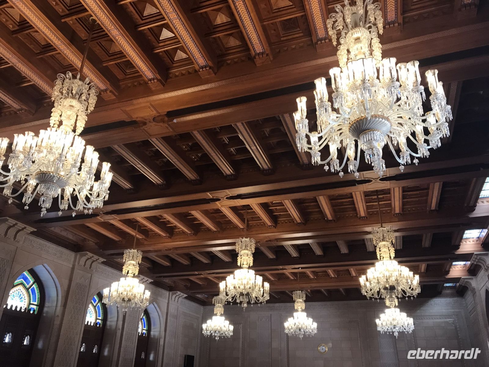 Wir starten die Besichtigung von Muscat, der Hauptstadt, des Landes mit einem Besuch im Royal Opera House und sind alle erst einmal sprachlos. Schon von außen ist das Gebäude eindrucksvoll und repräsentativ. Innen verschlägt es einem wirklich die Sprache. Pracht und Ästhetik in Höchstform. Das Haus erstreckt sich über 80 00 Quadratmeter, bietet im Auditorium Platz für 1100 Besucher und ist mit hochmoderner Technik ausgestattet, die uns förmlich vor Neid erblassen ließ. An jedem Sitzplatz ein kleiner Monitor für das Mitlesen in der gewählten Sprache. Da könnte sich die Semperoper einmal ein Scheibchen abschneiden. Im Bühnenraum ermöglichen zwei mehr als 30 Meter hohe Portaltürme alle nur denkbaren Raffinessen bei der Bühnengestaltung. Das dunkle Holz, die roten Teppiche und der helle Marmor machen Lust, hier einmal bei einer der Aufführungen jeweils an den Wochenenden durch das elegante Foyer zu schlendern.