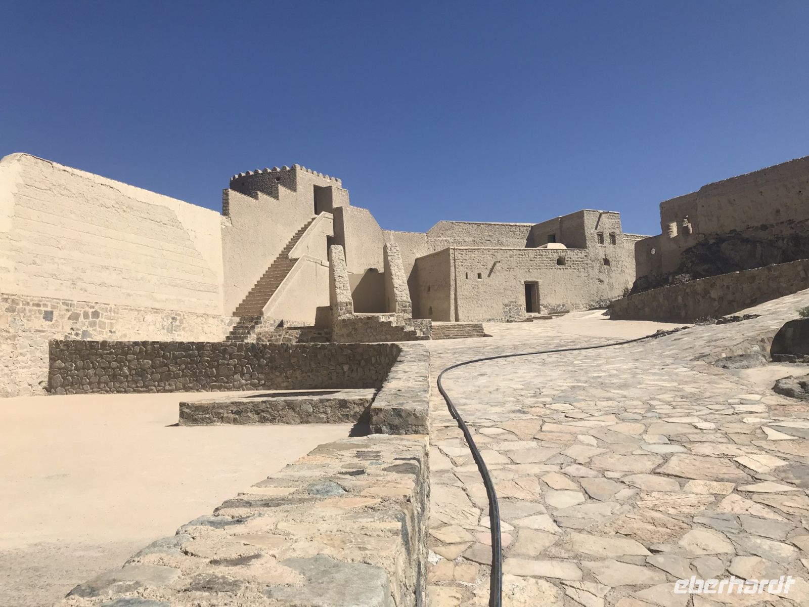 Dann steuern wir das Fort Nakhal an, es ist zwar noch immer nicht für die Innenbesichtigung nach einer umfasssenden Renovierung frei gegeben. Doch auch von außen wirkt das Fort eindrucksvoll, es scheint, als wüden die Festungsmauern direkt aus dem Felsen herauswachsen. In der Nähe sehen wir große Dattelgärten und erfahren von unserem kundigen Reiseführer, dass das Wort Nakhal auch Dattelpalme bedeute.