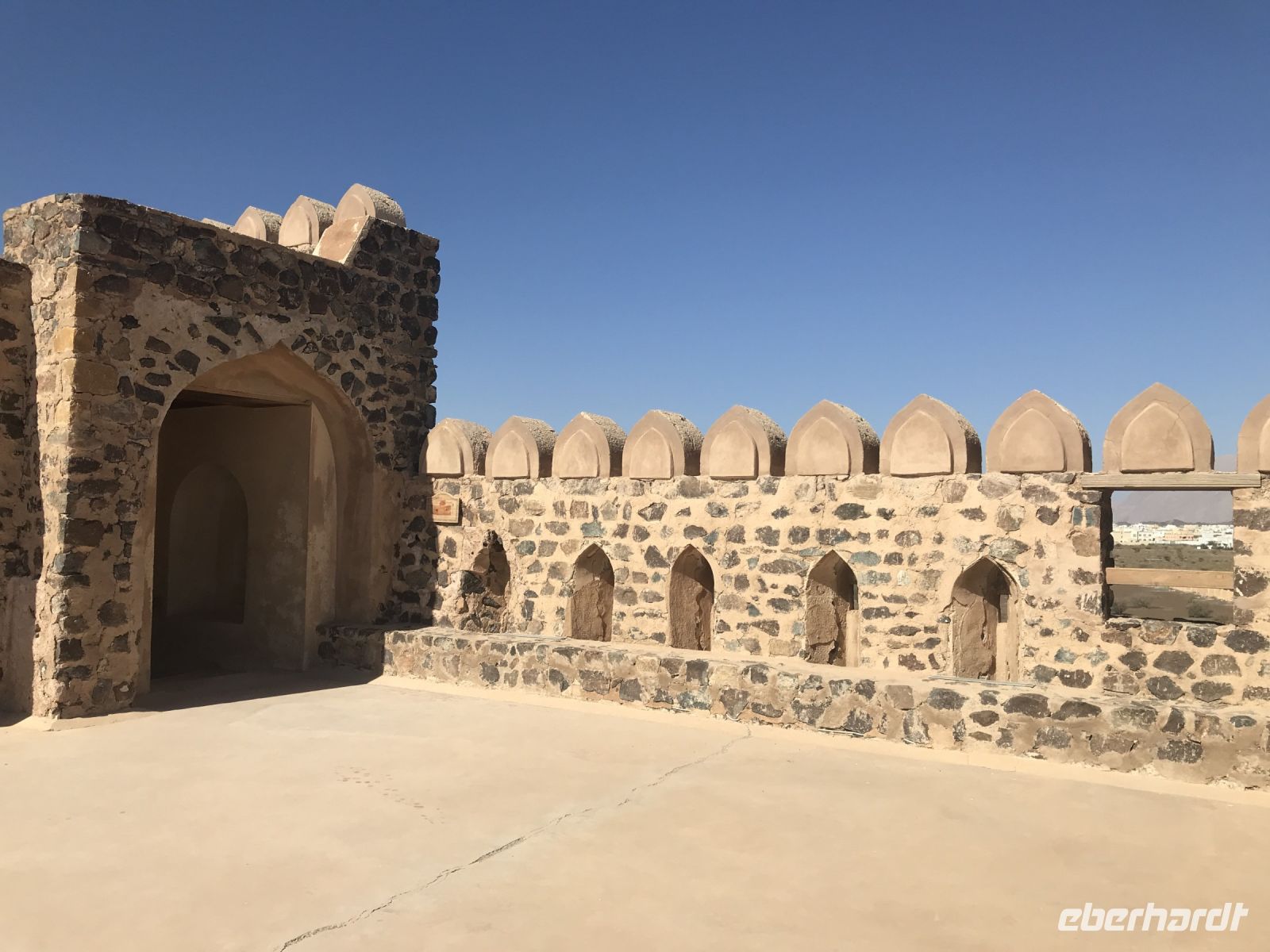 Über vergleichsweise wenig befahrene Straßen, die von weit auseinanderliegenden Dörfern oder Anwesen gesäumt sind, geht es Richtung Nizwa, dem religiösen Zentrum der Ibadhiya. Eine eindrucksvolle Festung mit einem riesigen Kanonenturm dominiert Nizwa. Scheintüren und Verteidgungsschächte gehören zur Ausstattung des Forts. Einzelne Exponate erzählen etwas von dem Leben früher im Oman. Die Räume sind mit Teppichen ausgelegt, man sitzt gewöhnlich auf harten Kissen auf dem Boden und die schönen Kaffeekannen dürfen auch nicht fehlen. Zu Füßen des Forts erstreckt sich ein großer Suq, Hier gibt es Töpferwaren in allen Größen und Formen, dazu viel Silber, unter anderem die traditionellen Krummdolche, die noch heute die Männer bei Festen oder Hochzeiten anlegen. Außerdem stehen hier Gewürze in allen Farben in langen Reihen, dazu Datteln aller Sorten. Wir staunen, kosten gern, doch an Souvenirs für zu Hause denken wir noch nicht, schließlich sind wir doch gerade erst angekommen. Später bedauern wir das.