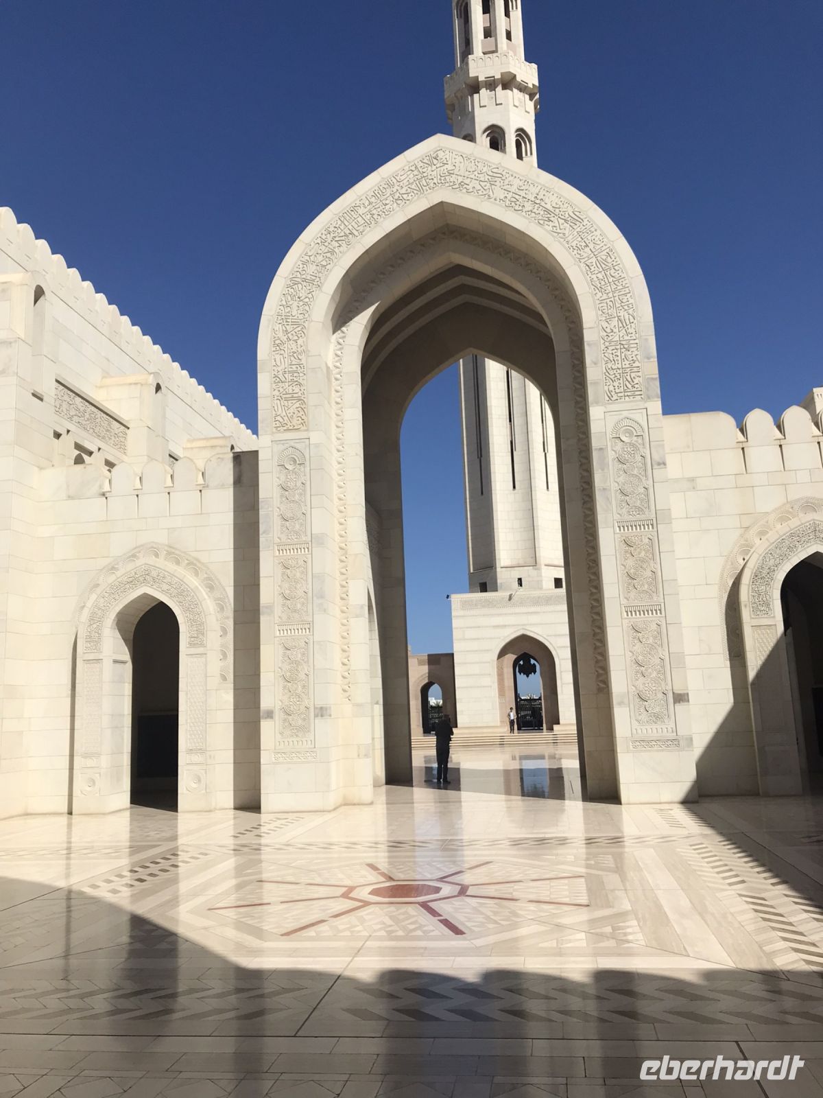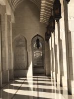 Der frühe Ruf des Muezzins macht uns im Morgengrauen mit seinem Singsang deutlich, dass wir in einem anderen Kulturkreis mit anderen Sitten und Gebräuchen, nicht nur in Hinblick auf die Religion angekommen sind. Jetzt wollen wir das Morgenland mit allen Sinnen erkunden und kennenlernen. Vier Jeeps stehen für unsere ersten Erkundungsfahrten vor dem Hotel für uns bereit und nachdem alle Koffer verstaut sind, geht es durch die Stadt Muscat zunächst zur Sultan Quabus Moschee. Hier gibt es Kleidervorschriften vor allem für die Frauen, entsprechend der Landssitte kommen wir mit bedeckten Armen und Beinen und dem Kopftuch, um das Haar zu verbergen. Die Schuhe ziehen alle aus, auch die Männer, ehe wir dieses prachtvolle Gebäude betreten. Die Anlage ist riesig, Wasserbecken und Blumenrabatten säumen die Moschee, der Marmor blitzt in der Sonne und vier Minarette ragen in den blauen Himmel. Lüster mit Savrowsky-Kristallen, ein riesiger handgewebter Teppich und farbige Glasfenster schmücken die weitläufige Gebetshalle. Alles ist kostbar, großartig und gleichwohl wirkt alles harmonisch, nicht übertrieben. Unser Reiseführer Ajit erläutert uns die unterschiedlichen gestalterischen islamischen Traditionen, die hier harmonisch gebündelt sind und die als Sinnbild für die Toleranz gelten, die die Ibadiyah innerhalb der muslimischen Gemeinschaften ausdrücken.