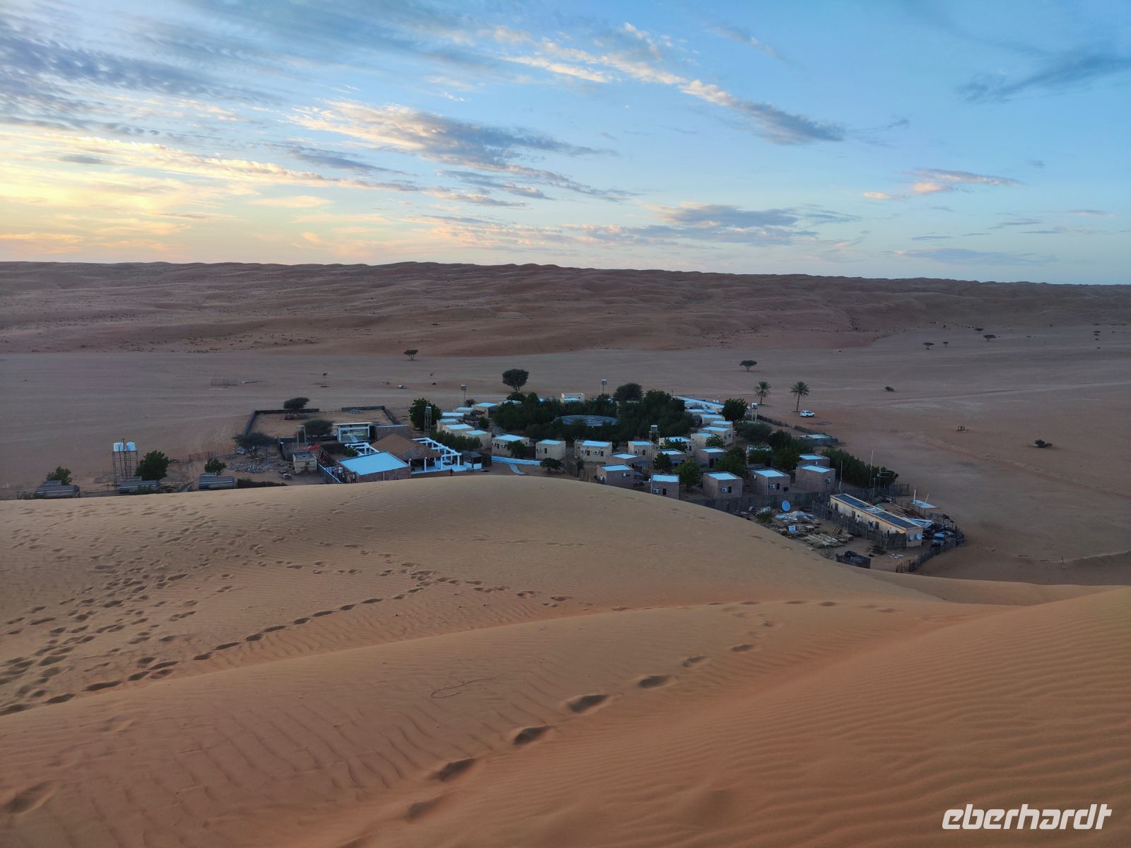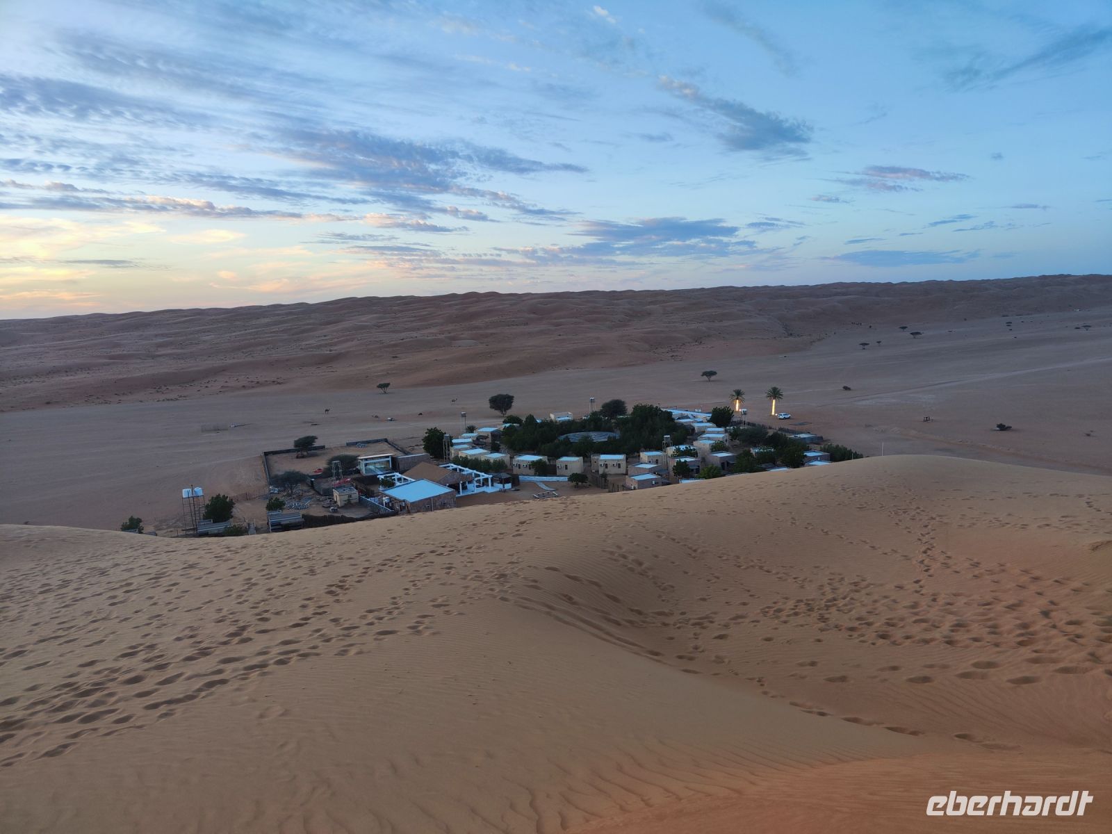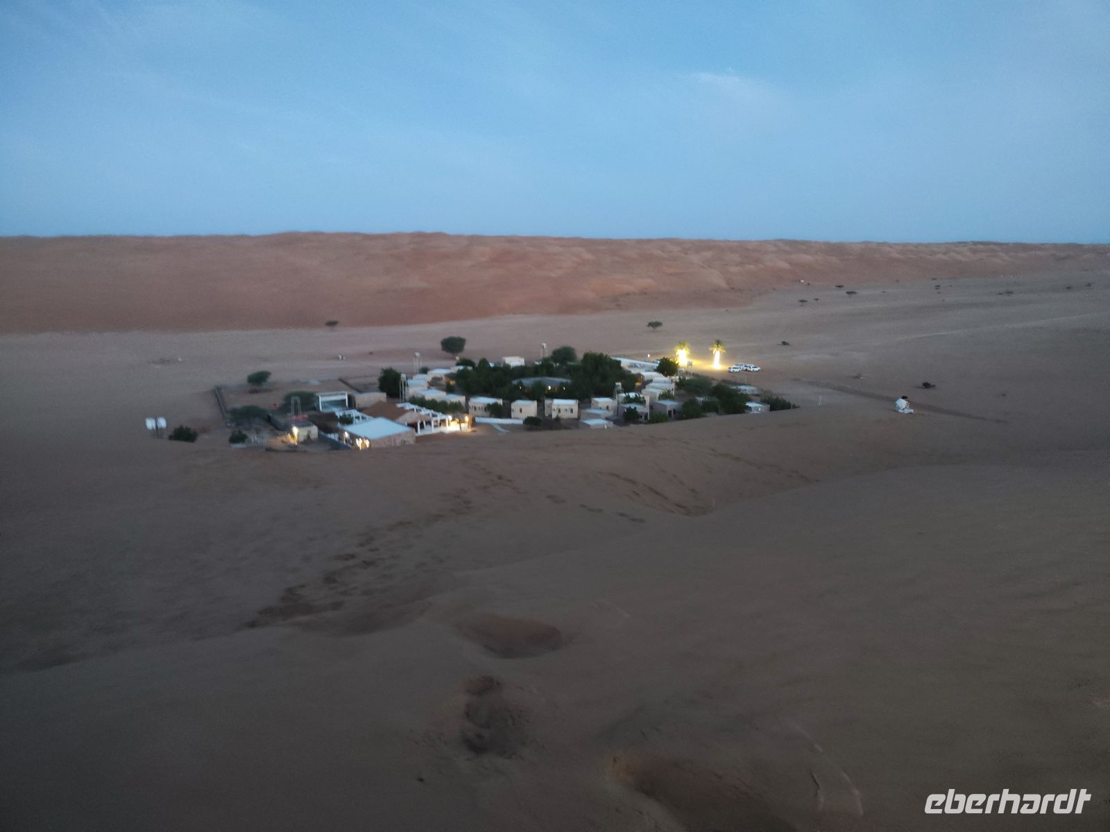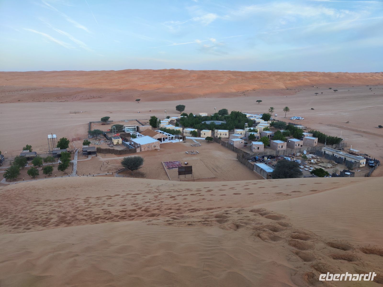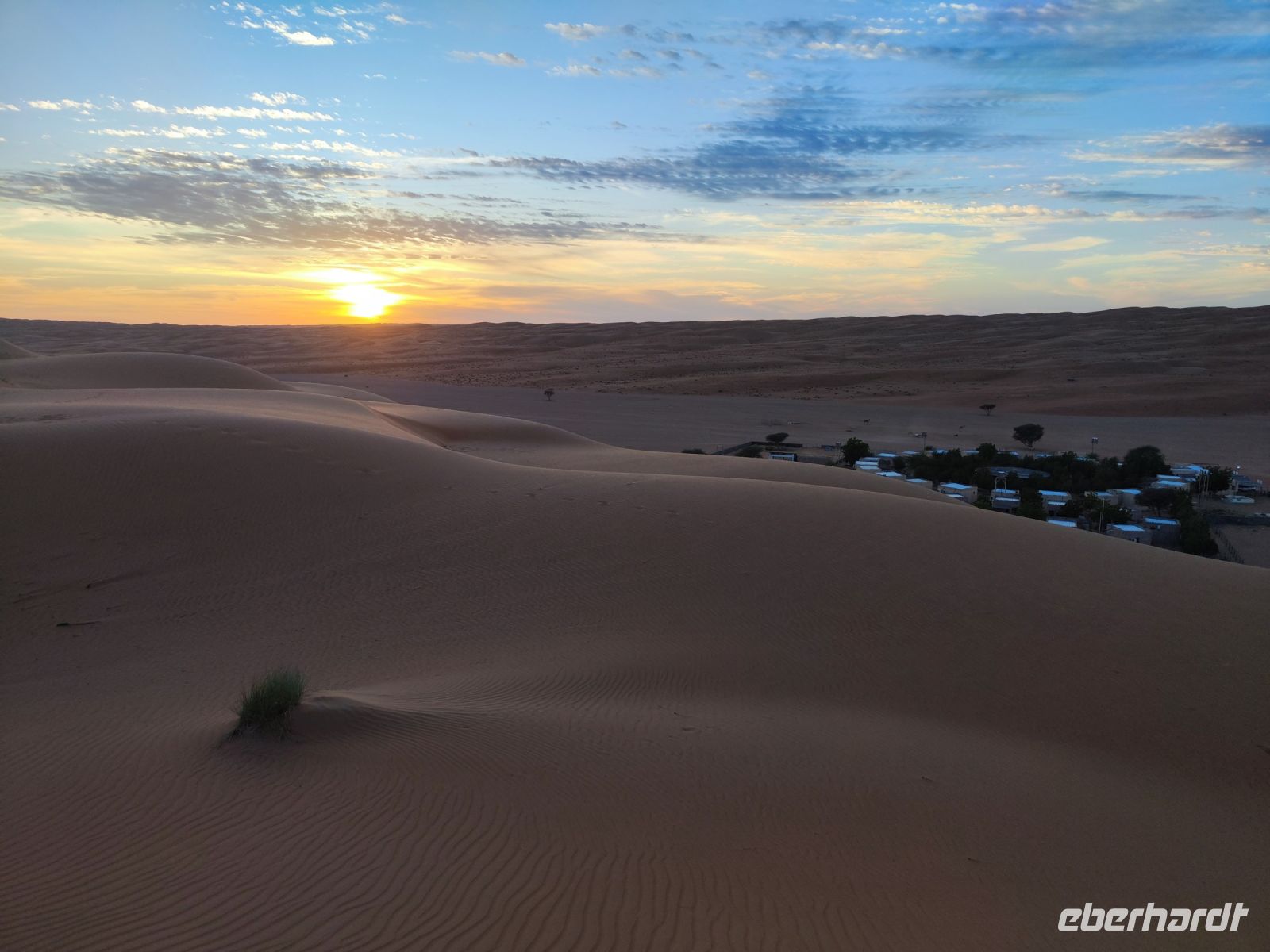 Nachdem wir Nizwa nach dem Frühstück verlassen hatten und in unseren Jeeps unterwegs waren, tauchten wir in die beeindruckende Bergwelt des Jebel Akhdar ein. Die Aussicht am „Grünen Berg“ war atemberaubend, und wir machten eine kurze Pause am Hotel Sahab, wo uns der Aussichtspunkt Diana Point begeisterte. Es war interessant zu wissen, dass bereits Prinzessin Diana und Prinz Charles (heuzutage König Charles) an diesem Ort standen. Jebel Akhdar ist für seine spektakuläre natürliche Schönheit bekannt, einschließlich üppiger grüner Täler, Terrassenfelder und beeindruckender Schluchten. Die Region ist ein Kontrast zu den trockenen Wüstenlandschaften des Omans. Unser Weg führte uns nur wenige Meter weiter, und wir erhielten einen Blick auf das Haus des Imans und saftig grüne Terassenfelder. Nach unserem schönen Stopp, hielt unser Reiseleiter Ajid eine Überraschung bereit und spendierte uns einen köstlichen Chai Latte. Nachdem wir die Bergwelt erkundet hatten, führte uns unsere Reiseroute nach Birkat Al Mauz. Im „verlassenen“ Dorf unternahmen wir einen entspannten Spaziergang entlang des Falaj-Systems und lernten mehr über die traditionelle Wasserversorgung des Omans. Anschließend wurden wir nun endgültige in die Wüste geschickt. Doch kurz bevor wir den Wüstensand erreichten, mussten wir den Reifendruck unserer Jeeps reduzieren, um uns besser an das sandige Gelände anzupassen. Nun brachen wir aber endgültig auf und fuhren durch die majestätische Wahiba Sands Wüste bis in unser Wüstencamp. Hier machten wir uns kurz frisch, bevor wir uns den Sonnenuntergang in der Wüste widmen konnten. Mit den Jeeps fuhren wir zu einen schönen Fotopoint und genossen den unvergesslichen Sonnenuntergang in der Wüste. Zurück im Wüstencamp erwartete uns ein traditionelles omanisches Abendessen mit Hühnchen oder Kamelfleisch. Wir lauschten der Omanischen Musik und genossen die stimmungsvolle Atmosphäre unter dem klaren Wüstenhimmel. Am Lagerfeuer ließen wir den Tag ausklingen und freuten uns bereits auf den Sonnenaufgang in der Wüste.