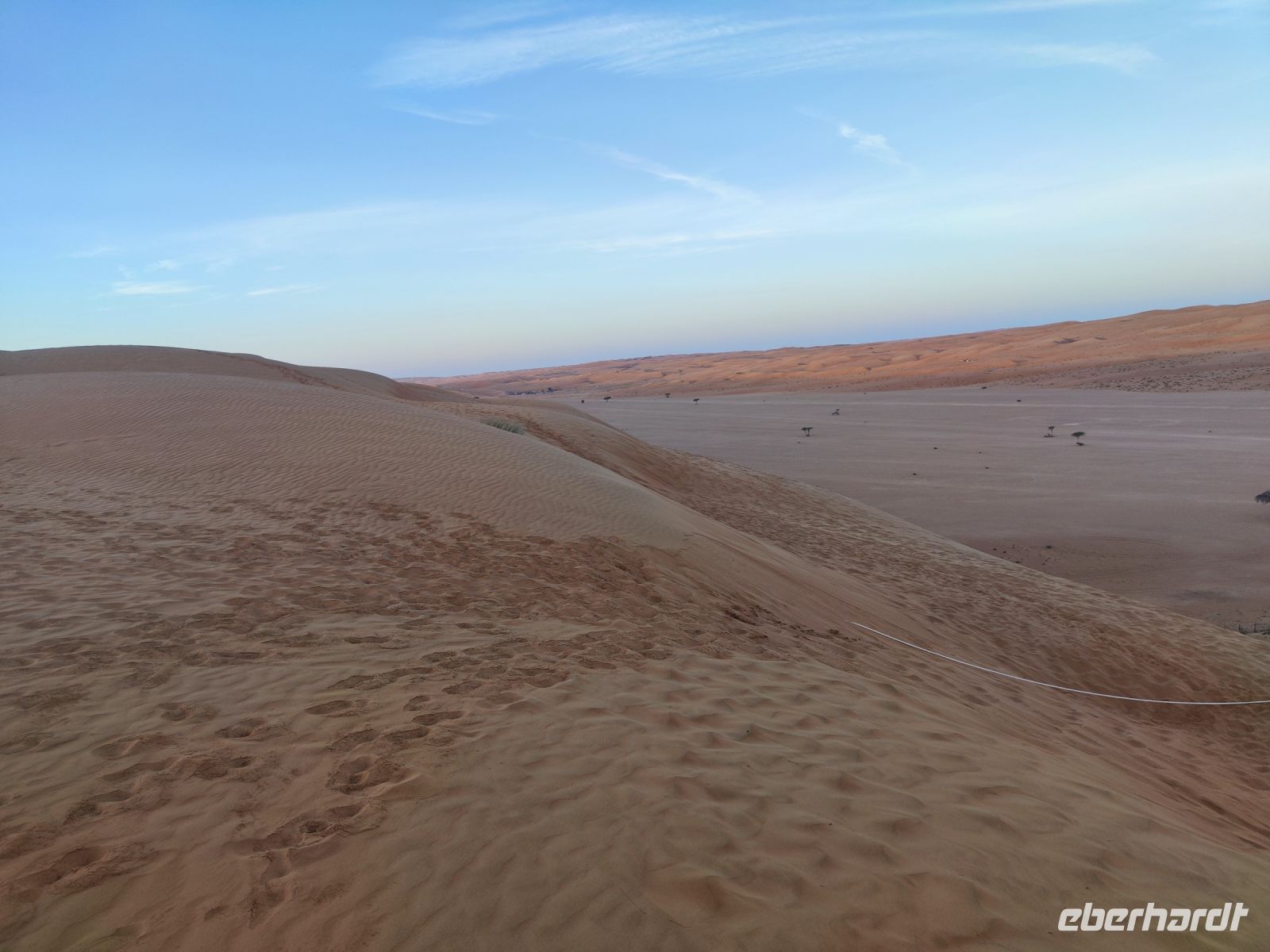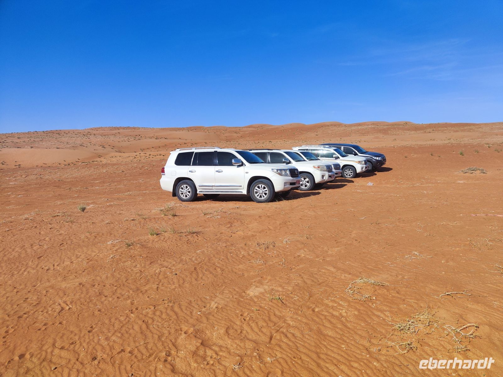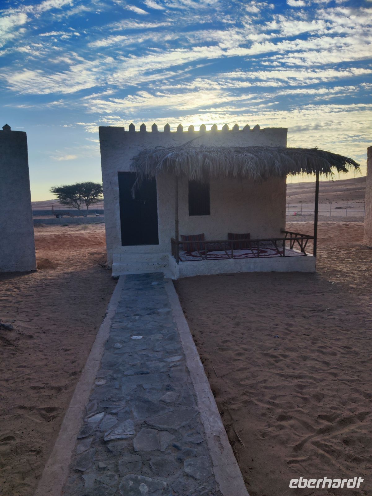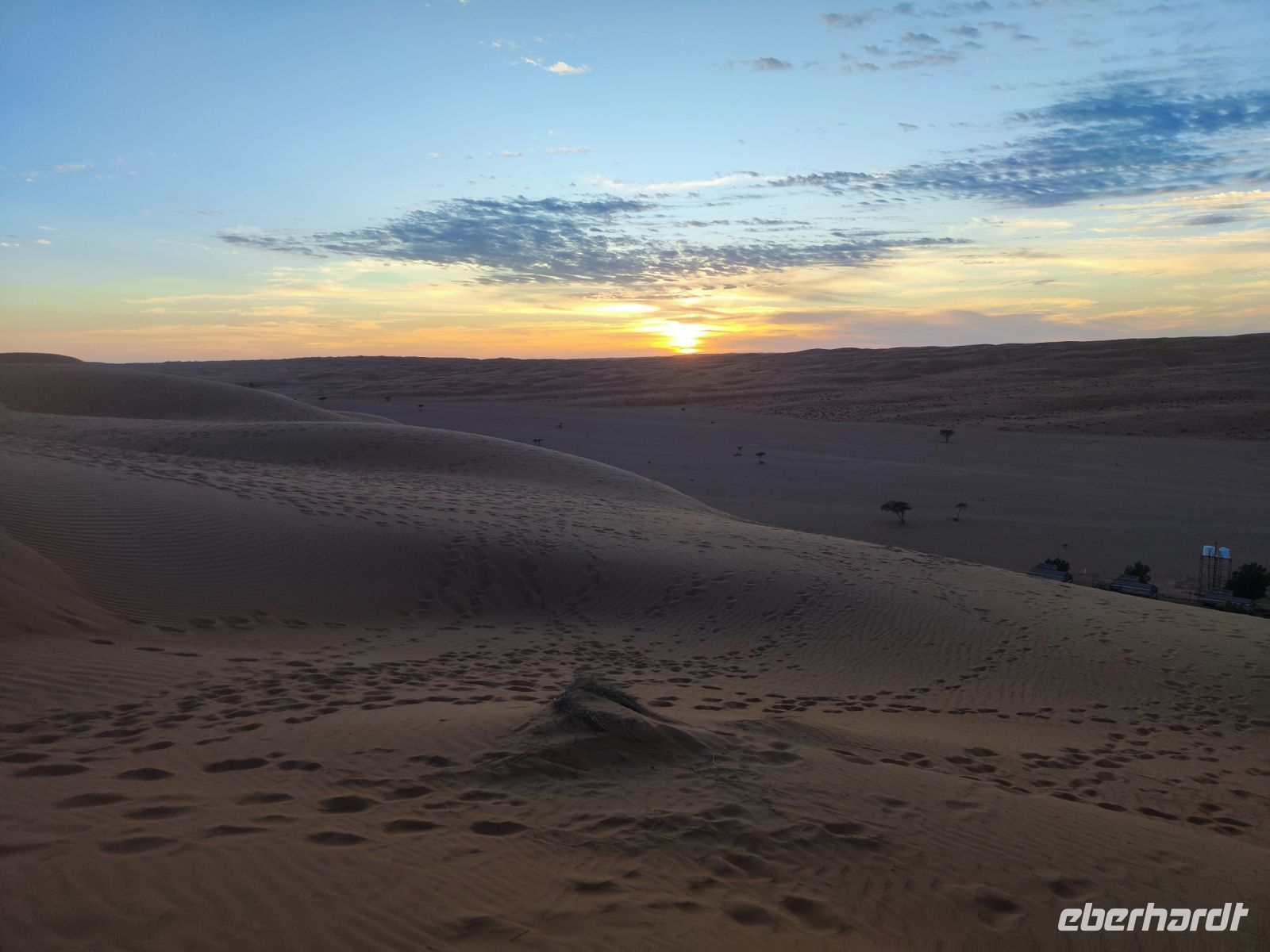 Nachdem wir Nizwa nach dem Frühstück verlassen hatten und in unseren Jeeps unterwegs waren, tauchten wir in die beeindruckende Bergwelt des Jebel Akhdar ein. Die Aussicht am „Grünen Berg“ war atemberaubend, und wir machten eine kurze Pause am Hotel Sahab, wo uns der Aussichtspunkt Diana Point begeisterte. Es war interessant zu wissen, dass bereits Prinzessin Diana und Prinz Charles (heuzutage König Charles) an diesem Ort standen. Jebel Akhdar ist für seine spektakuläre natürliche Schönheit bekannt, einschließlich üppiger grüner Täler, Terrassenfelder und beeindruckender Schluchten. Die Region ist ein Kontrast zu den trockenen Wüstenlandschaften des Omans. Unser Weg führte uns nur wenige Meter weiter, und wir erhielten einen Blick auf das Haus des Imans und saftig grüne Terassenfelder. Nach unserem schönen Stopp, hielt unser Reiseleiter Ajid eine Überraschung bereit und spendierte uns einen köstlichen Chai Latte. Nachdem wir die Bergwelt erkundet hatten, führte uns unsere Reiseroute nach Birkat Al Mauz. Im „verlassenen“ Dorf unternahmen wir einen entspannten Spaziergang entlang des Falaj-Systems und lernten mehr über die traditionelle Wasserversorgung des Omans. Anschließend wurden wir nun endgültige in die Wüste geschickt. Doch kurz bevor wir den Wüstensand erreichten, mussten wir den Reifendruck unserer Jeeps reduzieren, um uns besser an das sandige Gelände anzupassen. Nun brachen wir aber endgültig auf und fuhren durch die majestätische Wahiba Sands Wüste bis in unser Wüstencamp. Hier machten wir uns kurz frisch, bevor wir uns den Sonnenuntergang in der Wüste widmen konnten. Mit den Jeeps fuhren wir zu einen schönen Fotopoint und genossen den unvergesslichen Sonnenuntergang in der Wüste. Zurück im Wüstencamp erwartete uns ein traditionelles omanisches Abendessen mit Hühnchen oder Kamelfleisch. Wir lauschten der Omanischen Musik und genossen die stimmungsvolle Atmosphäre unter dem klaren Wüstenhimmel. Am Lagerfeuer ließen wir den Tag ausklingen und freuten uns bereits auf den Sonnenaufgang in der Wüste.