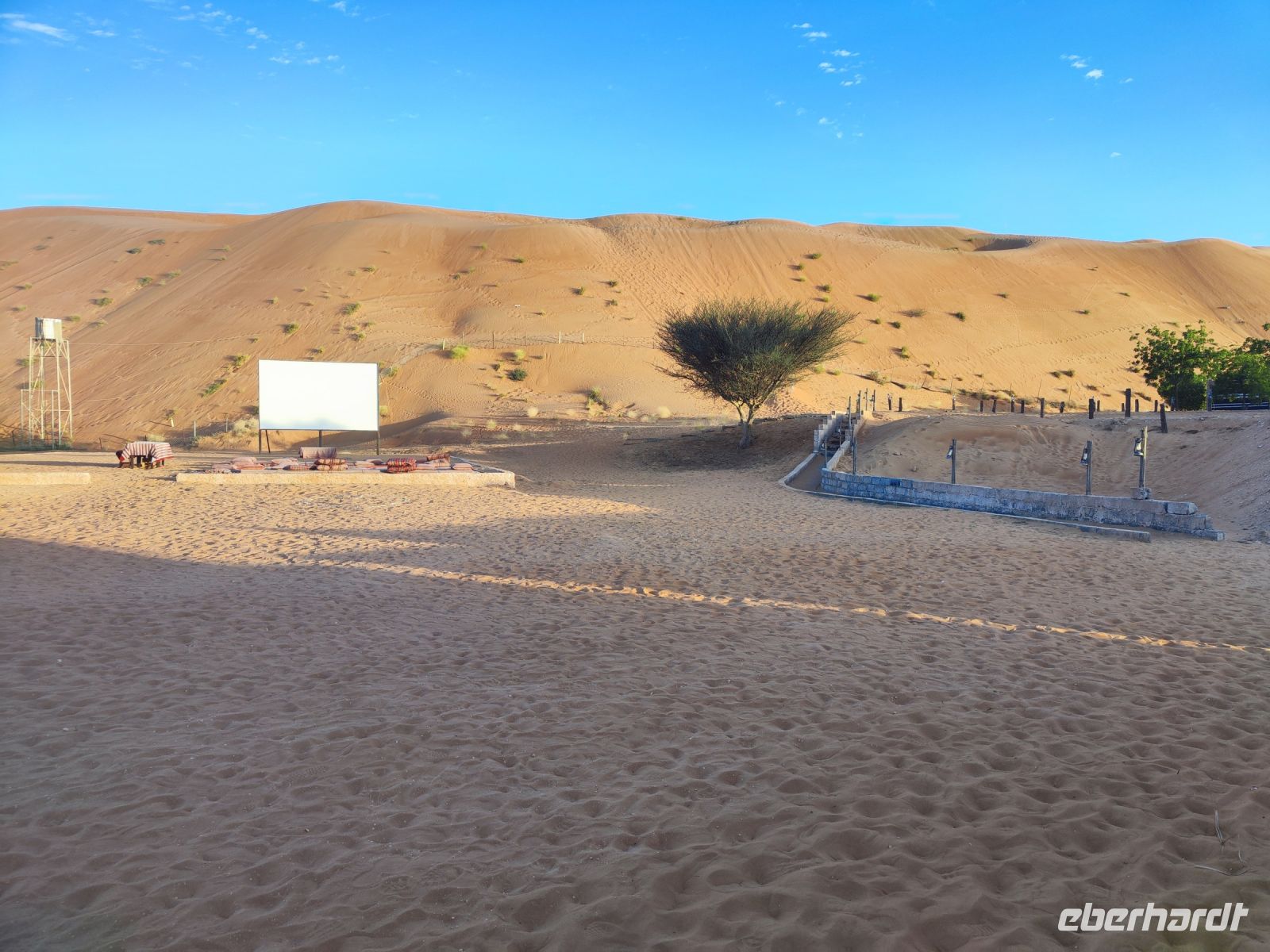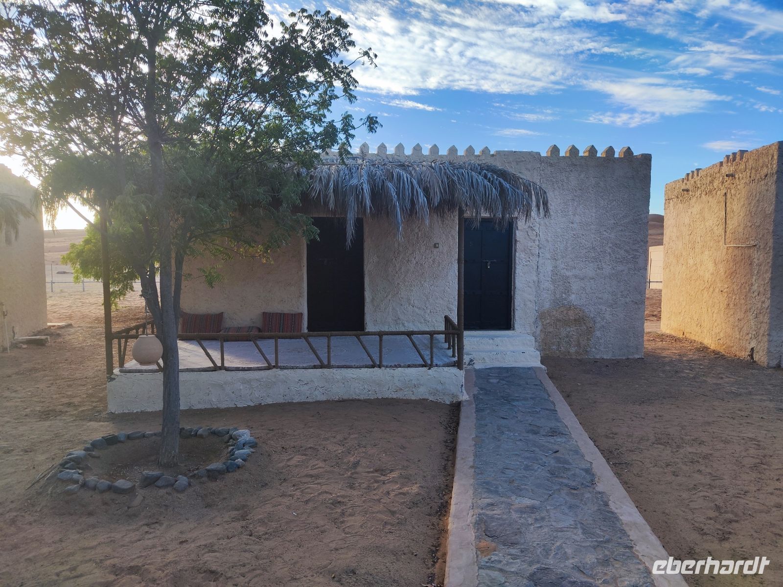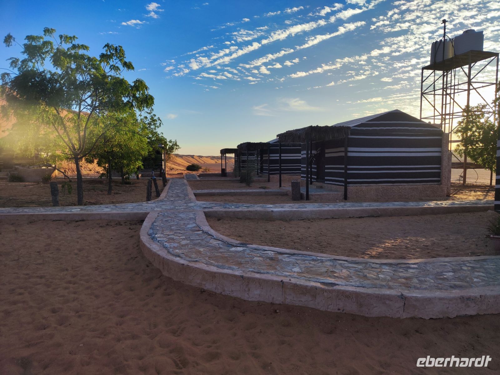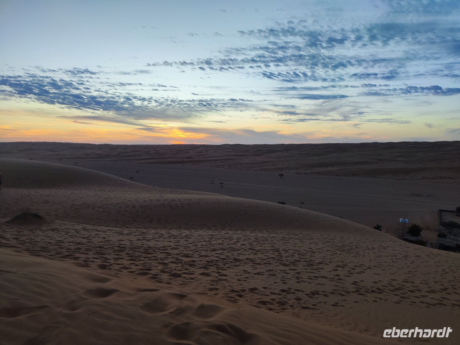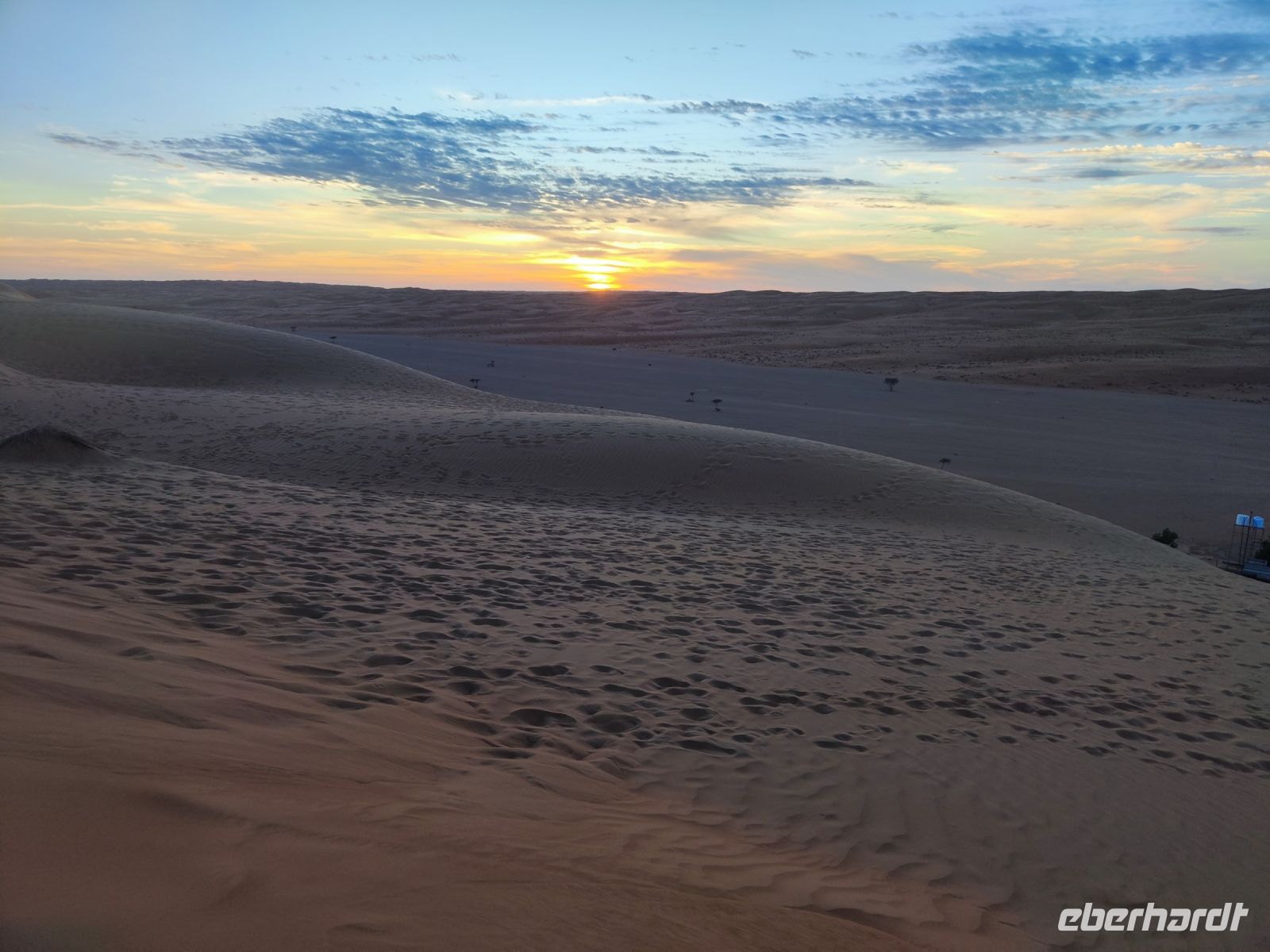 Nachdem wir Nizwa nach dem Frühstück verlassen hatten und in unseren Jeeps unterwegs waren, tauchten wir in die beeindruckende Bergwelt des Jebel Akhdar ein. Die Aussicht am „Grünen Berg“ war atemberaubend, und wir machten eine kurze Pause am Hotel Sahab, wo uns der Aussichtspunkt Diana Point begeisterte. Es war interessant zu wissen, dass bereits Prinzessin Diana und Prinz Charles (heuzutage König Charles) an diesem Ort standen. Jebel Akhdar ist für seine spektakuläre natürliche Schönheit bekannt, einschließlich üppiger grüner Täler, Terrassenfelder und beeindruckender Schluchten. Die Region ist ein Kontrast zu den trockenen Wüstenlandschaften des Omans. Unser Weg führte uns nur wenige Meter weiter, und wir erhielten einen Blick auf das Haus des Imans und saftig grüne Terassenfelder. Nach unserem schönen Stopp, hielt unser Reiseleiter Ajid eine Überraschung bereit und spendierte uns einen köstlichen Chai Latte. Nachdem wir die Bergwelt erkundet hatten, führte uns unsere Reiseroute nach Birkat Al Mauz. Im „verlassenen“ Dorf unternahmen wir einen entspannten Spaziergang entlang des Falaj-Systems und lernten mehr über die traditionelle Wasserversorgung des Omans. Anschließend wurden wir nun endgültige in die Wüste geschickt. Doch kurz bevor wir den Wüstensand erreichten, mussten wir den Reifendruck unserer Jeeps reduzieren, um uns besser an das sandige Gelände anzupassen. Nun brachen wir aber endgültig auf und fuhren durch die majestätische Wahiba Sands Wüste bis in unser Wüstencamp. Hier machten wir uns kurz frisch, bevor wir uns den Sonnenuntergang in der Wüste widmen konnten. Mit den Jeeps fuhren wir zu einen schönen Fotopoint und genossen den unvergesslichen Sonnenuntergang in der Wüste. Zurück im Wüstencamp erwartete uns ein traditionelles omanisches Abendessen mit Hühnchen oder Kamelfleisch. Wir lauschten der Omanischen Musik und genossen die stimmungsvolle Atmosphäre unter dem klaren Wüstenhimmel. Am Lagerfeuer ließen wir den Tag ausklingen und freuten uns bereits auf den Sonnenaufgang in der Wüste.