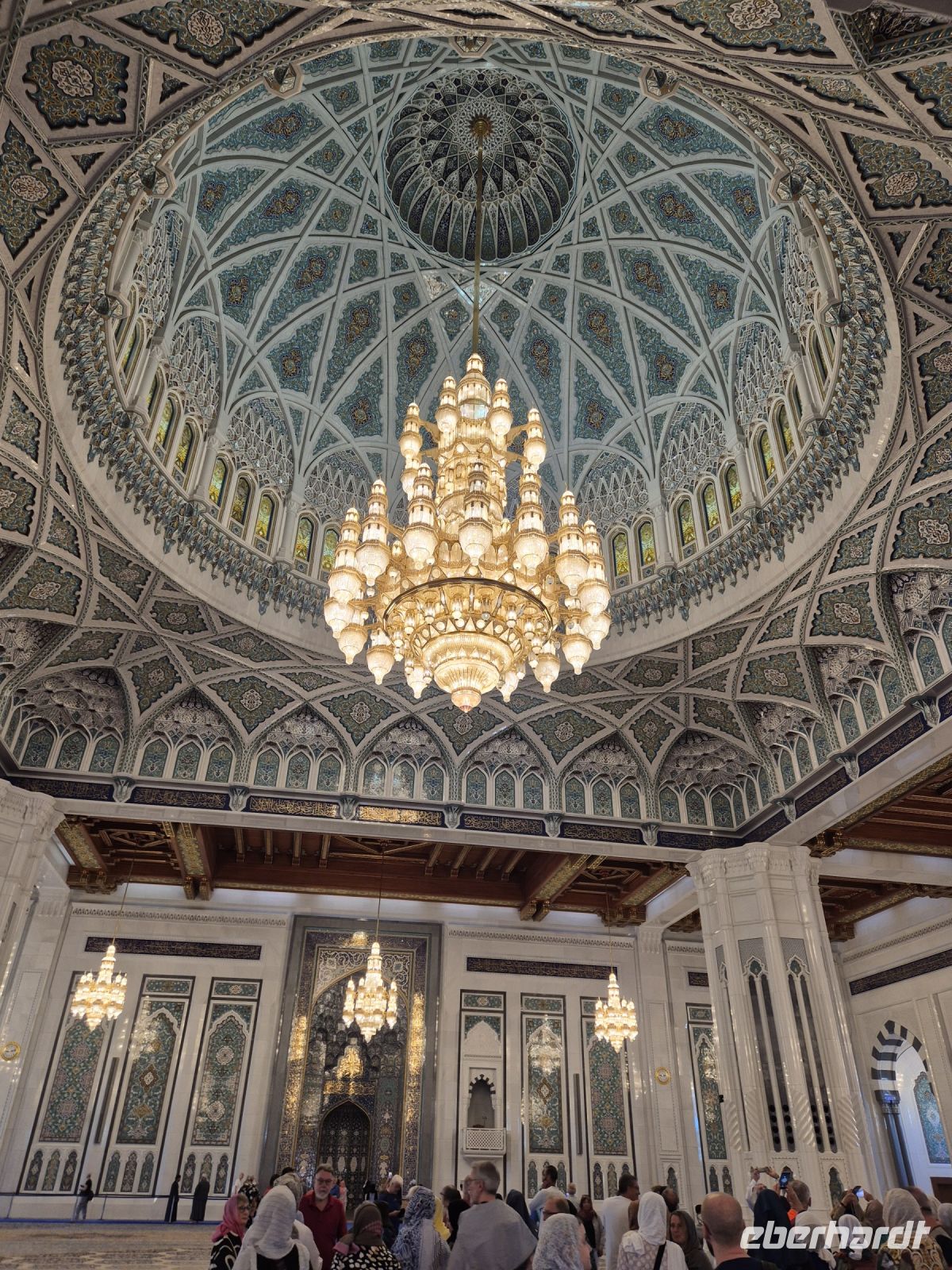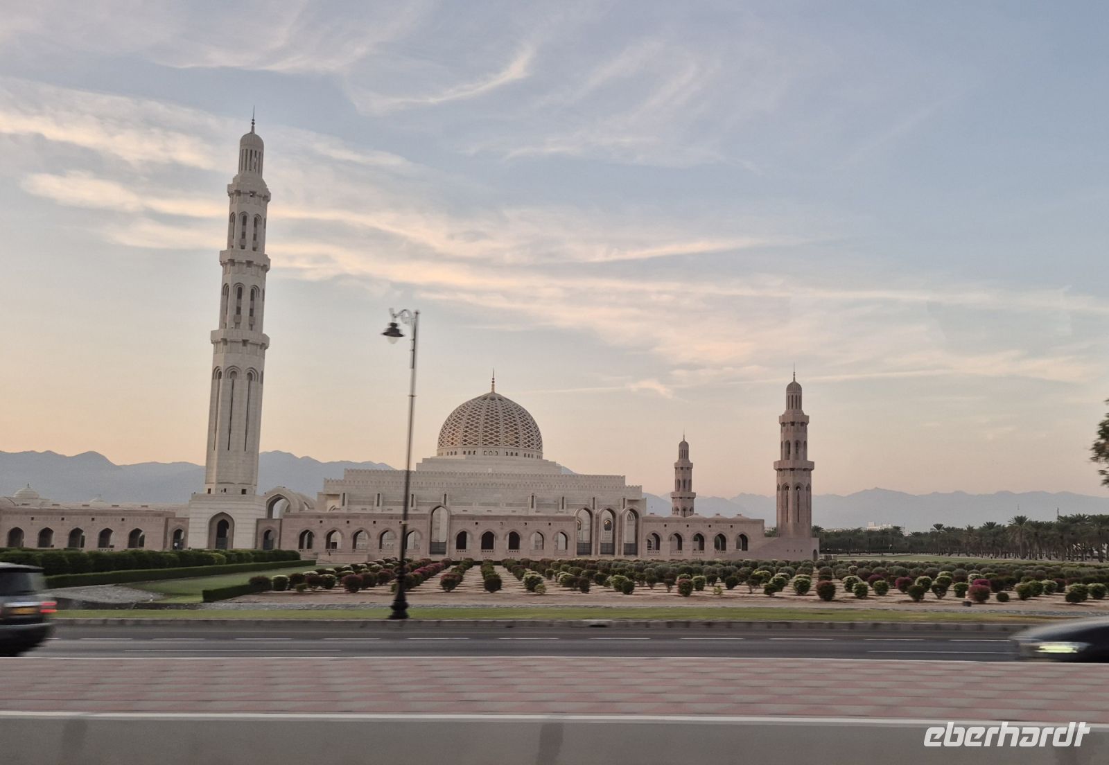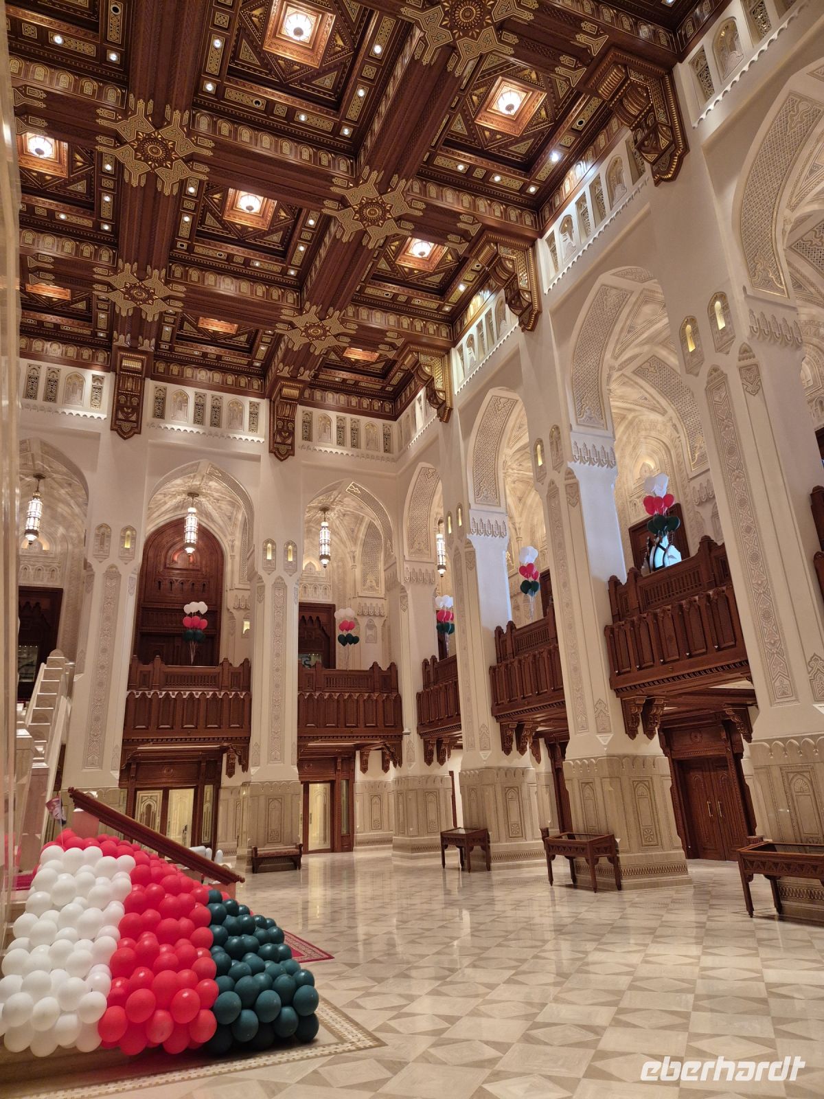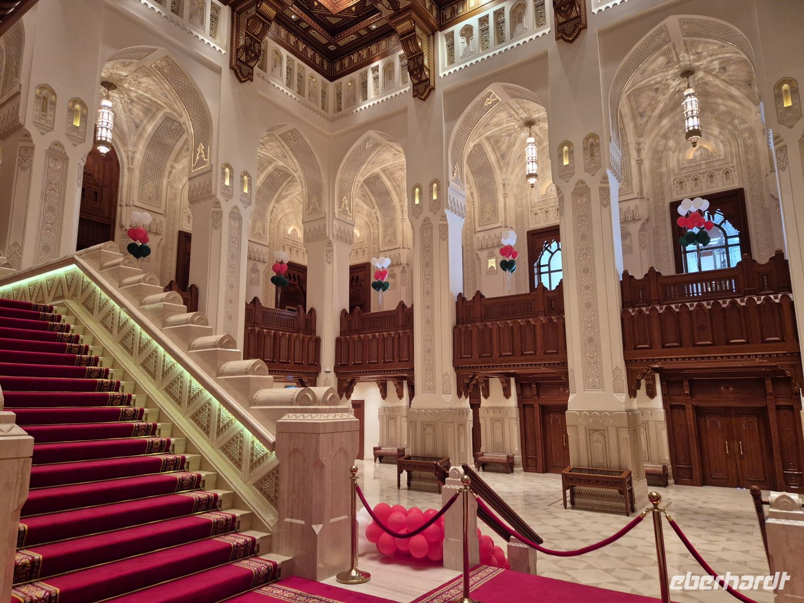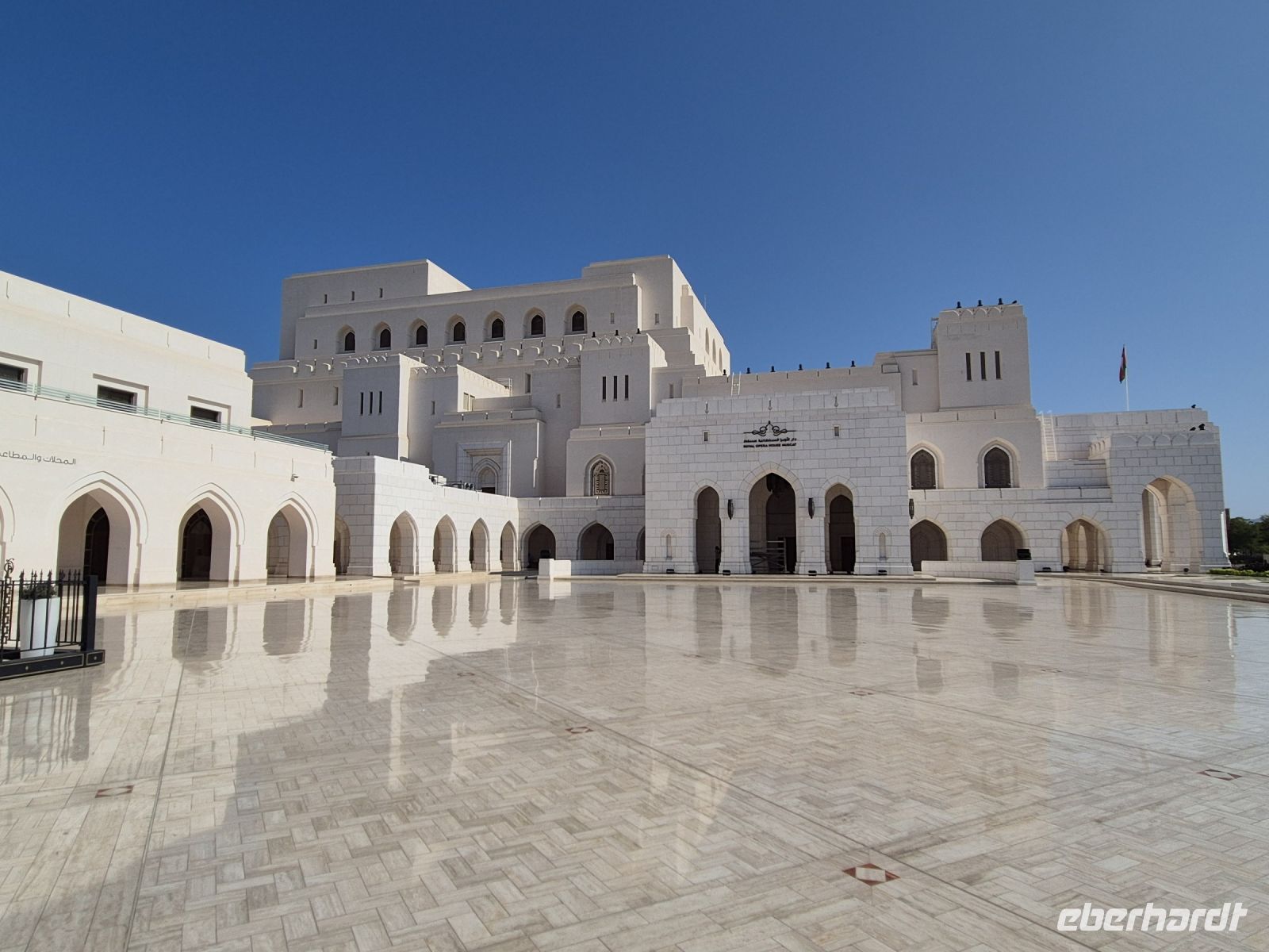 Um 10.00 Uhr beginnen wir bei Temperaturen nahe 30 Grad unsere Stadtrundfahrt. Zunächst fährt Said, unser Busfahrer durch den Stadtteil Qurum, wo sich schöne Villen und viele Botschaftsgebäude befinden. Anschließend kommen wir zum imposanten Opernhaus. Das ROHM, das steht für Royal Opera House Muscat, haben wir nicht offiziell im Programm, aber wenn wie heute die Möglichkeit für eine Besichtigung besteht, dann ist dies eine schöne Überraschung für meine Gäste. Das Opernhaus zählt zu den größten weltweit und war das erste Opernhaus im Mittleren Osten. Hier wurden wertvolle Materialien wie Marmor und Teakholz verarbeitet. Es war ein Prestigeobjekt des 2020 verstorbenen Sultan Qaboos. Er liebte klassische Musik. Während der Besichtigung haben wir auch die Gelegenheit, den großen Zuschauersaal zu besichtigen. Sehr stolz ist man hier auf die Bühnentechnik, welche verschiedene Varianten von Aufführungen ermöglicht und übrigens aus Sachsen stammt.