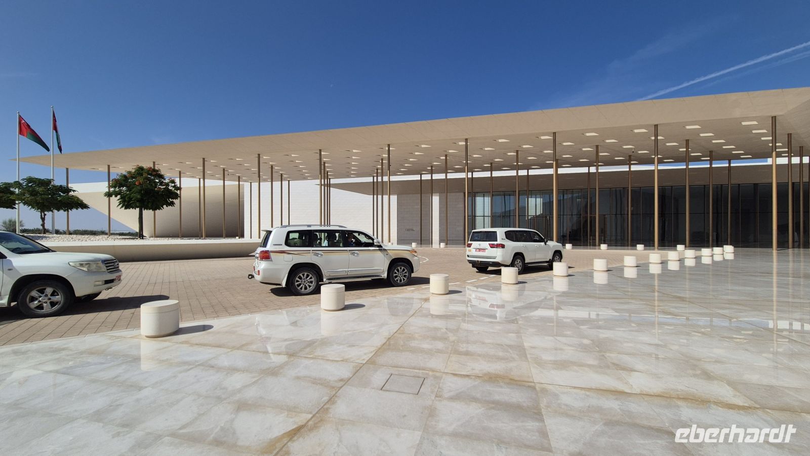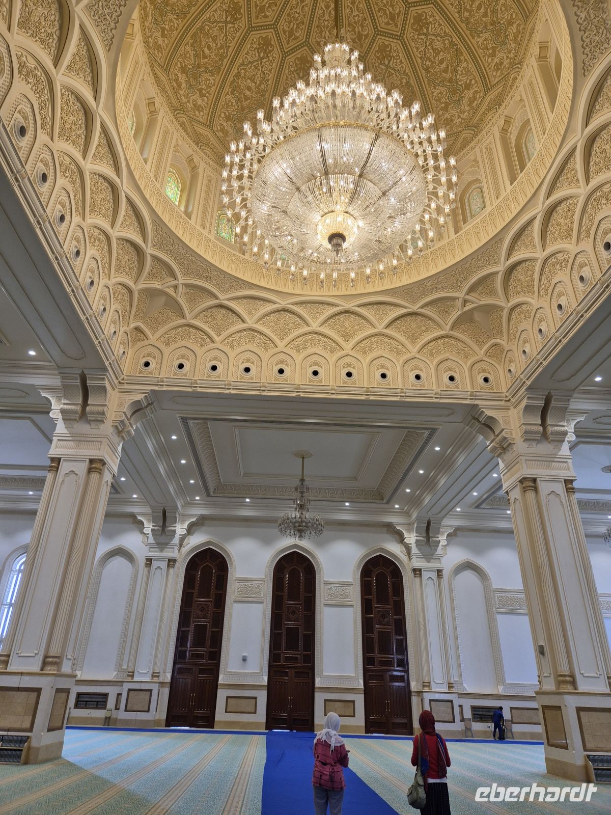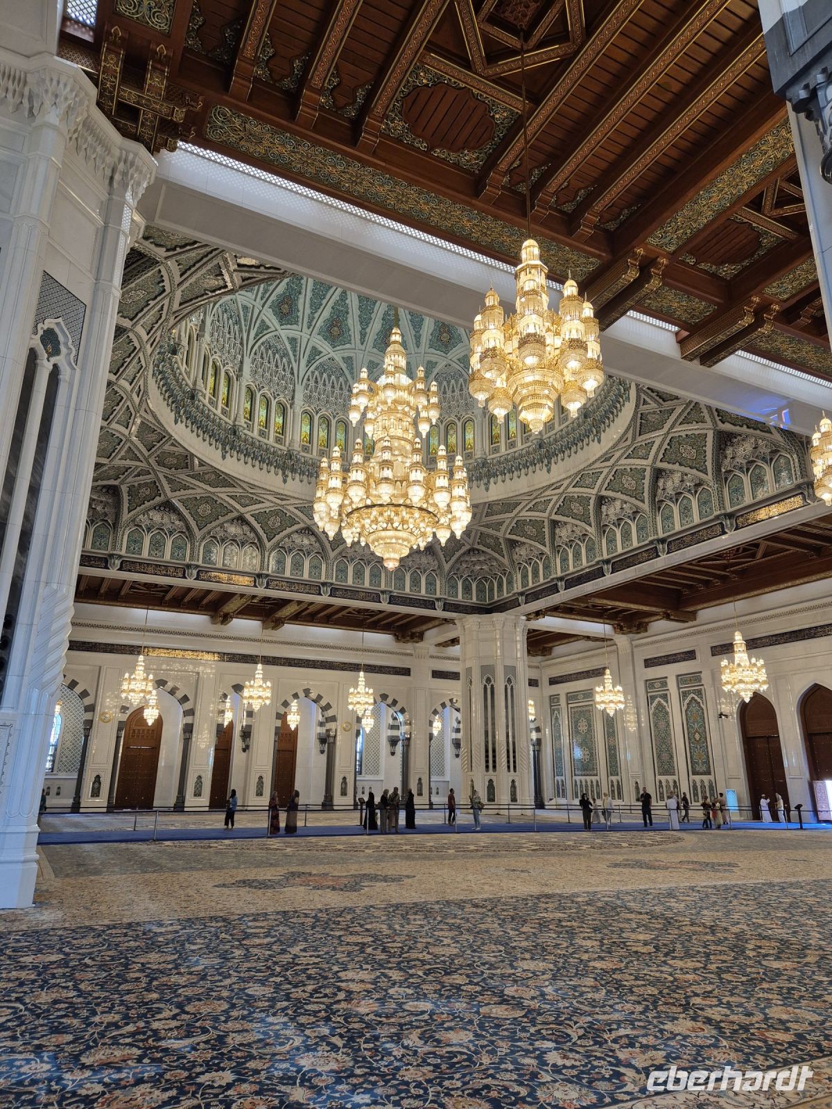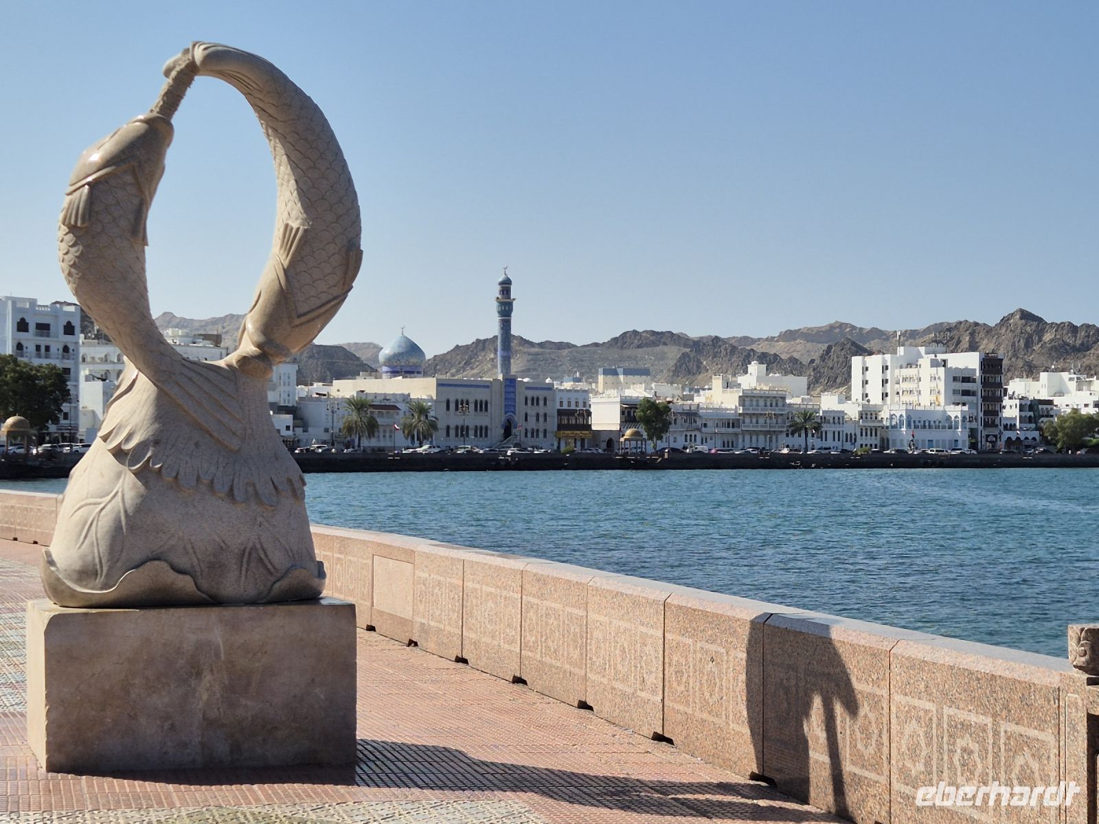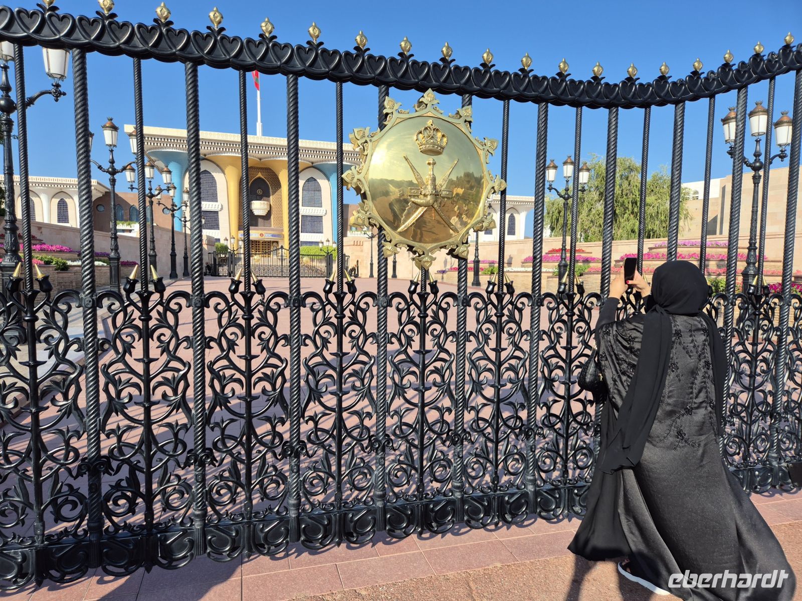 Um 10.00 Uhr beginnen wir bei Temperaturen nahe 30 Grad unsere Stadtrundfahrt. Zunächst fährt Said, unser Busfahrer durch den Stadtteil Qurum, wo sich schöne Villen und viele Botschaftsgebäude befinden. Anschließend kommen wir zum imposanten Opernhaus. Das ROHM, das steht für Royal Opera House Muscat, haben wir nicht offiziell im Programm, aber wenn wie heute die Möglichkeit für eine Besichtigung besteht, dann ist dies eine schöne Überraschung für meine Gäste. Das Opernhaus zählt zu den größten weltweit und war das erste Opernhaus im Mittleren Osten. Hier wurden wertvolle Materialien wie Marmor und Teakholz verarbeitet. Es war ein Prestigeobjekt des 2020 verstorbenen Sultan Qaboos. Er liebte klassische Musik. Während der Besichtigung haben wir auch die Gelegenheit, den großen Zuschauersaal zu besichtigen. Sehr stolz ist man hier auf die Bühnentechnik, welche verschiedene Varianten von Aufführungen ermöglicht und übrigens aus Sachsen stammt.