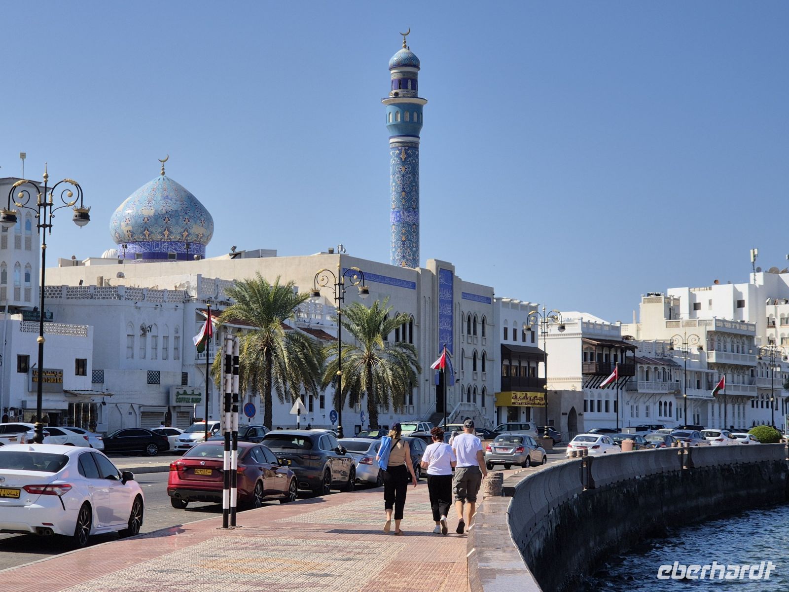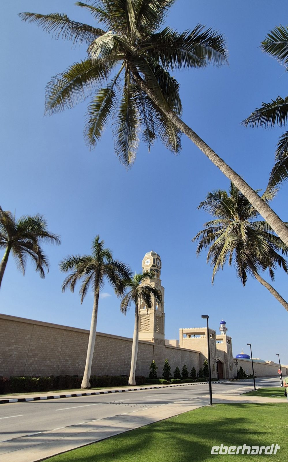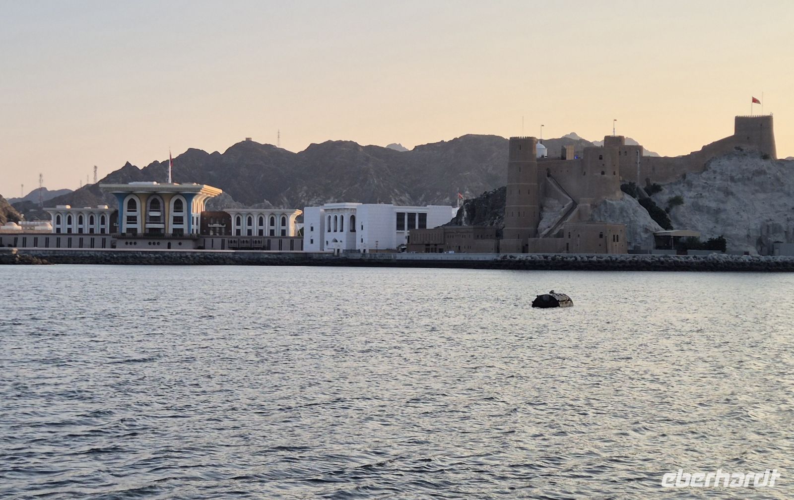 Unser nächstes Ziel ist „Old Muscat“, das alte Muscat, welches sich eine Bucht weiter befindet. Mit dem Bus fahren wir über die alte Riyam Road, um einen Blick auf die Altstadt zu haben. Nach dem Besuch des Museums Bait Al Zubair spazieren wir zum Sultanspalast. In den 1970er Jahren ließ der frühere Sultan Qaboos den Alam-Palast bauen. „Alam“ steht für arab. „Zeichen“ – ein Zeichen für den Aufbruch des Sultanats in die Moderne. Bei diesem Rundgang sehen wir außerdem die frühere portugiesische Festung Mirani, den ehemaligen portugiesischen Gouverneurspalast Bait Garaiza und die kleine blaue Moschee Masjid Al Khor sowie die Seeterrasse des Palastes.