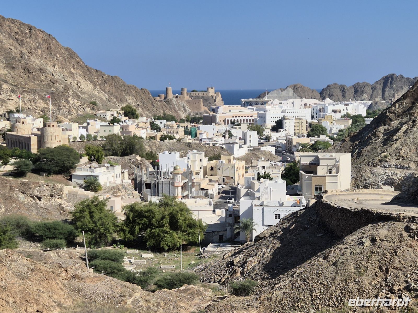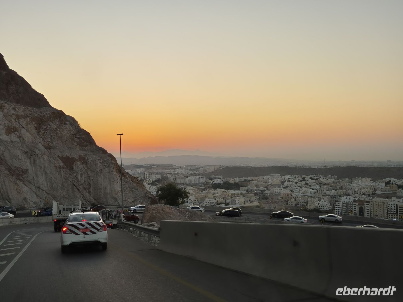 Zur Sonnenuntergangszeit erreichen wir Muscat. Über eine Serpentinenstraße fahren wir hinunter in die omanische Hauptstadt. Wir waren nun sechs Tage mit unseren Fahrern im Oman unterwegs. Wir verabschieden uns von unseren vier omanischen Fahrern. Herzlichen Dank für eine gute und sichere Fahrt!