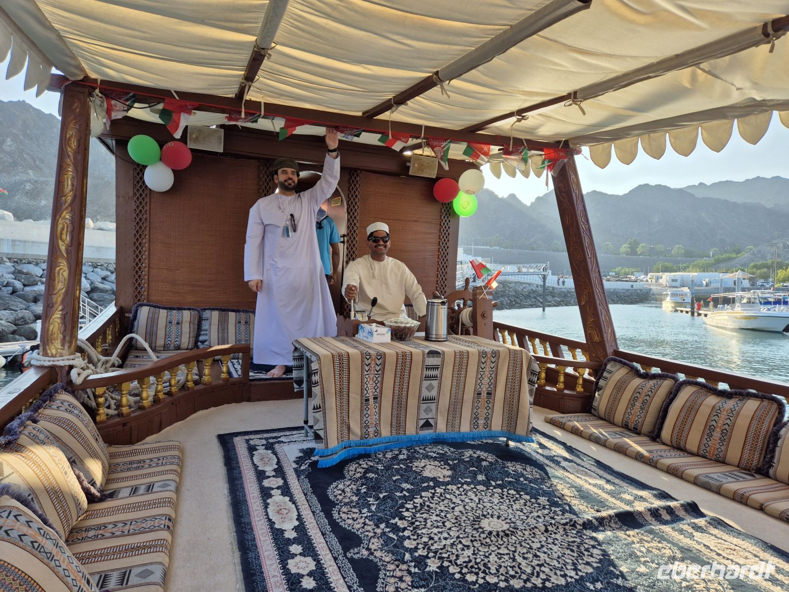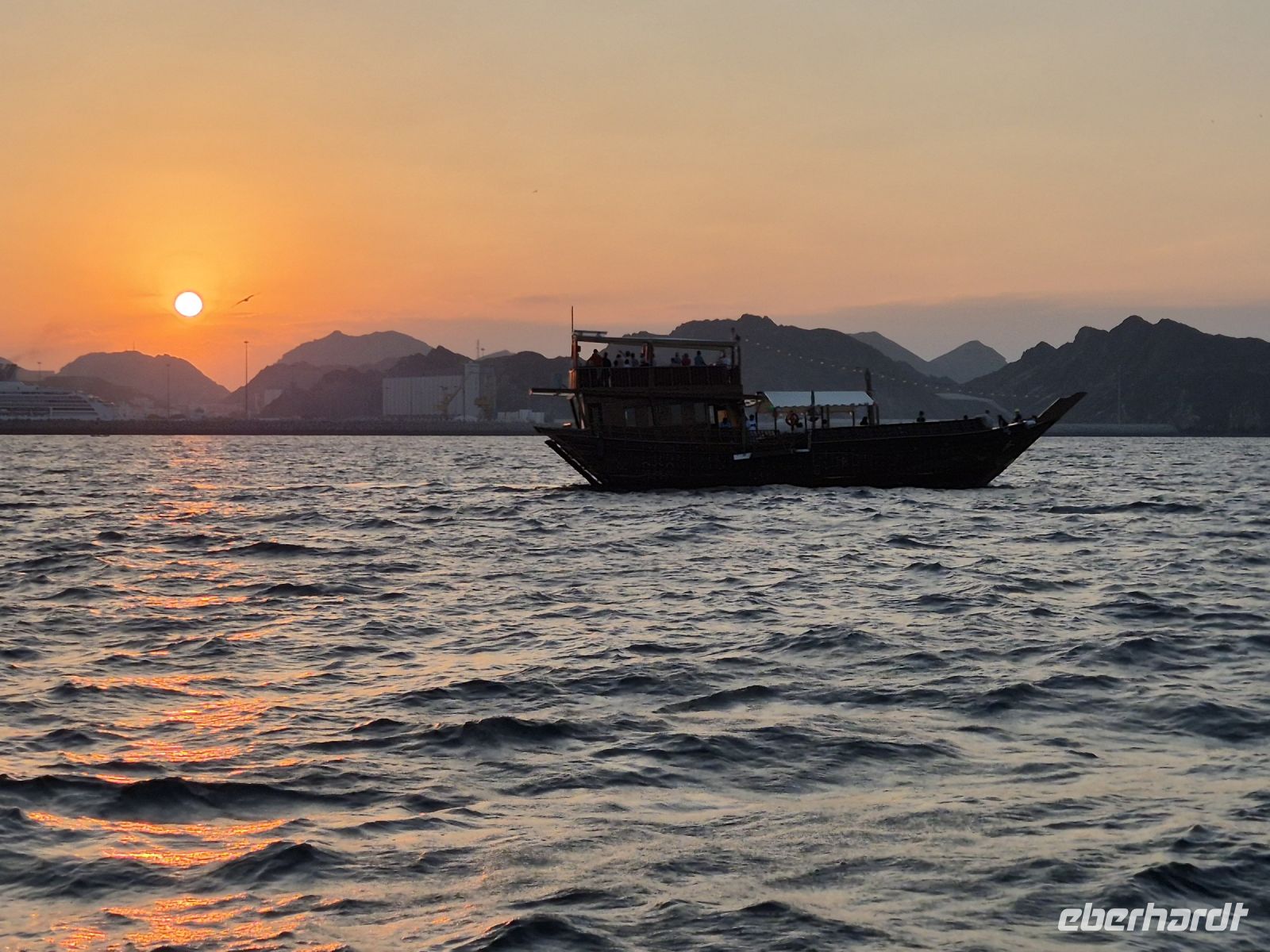 Am Yachthafen steht nachmittags für uns eine Dhau exklusiv für unsere Gruppe bereit. Nach diesem langen Tag können wir uns bei der zweistündigen Bootsfahrt entlang der Küste von Muscat ausruhen, die Aussicht und den Sonnenuntergang genießen. Während der Dhaufahrt sehen wir u. a. das Al Bustan Luxushotel, die Altstadt von Muscat mit dem Alam-Palast und den beiden Forts Mirani und Jalali sowie die Bucht von Muttrah.