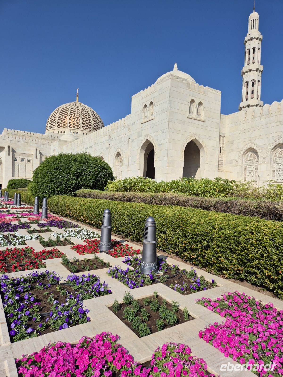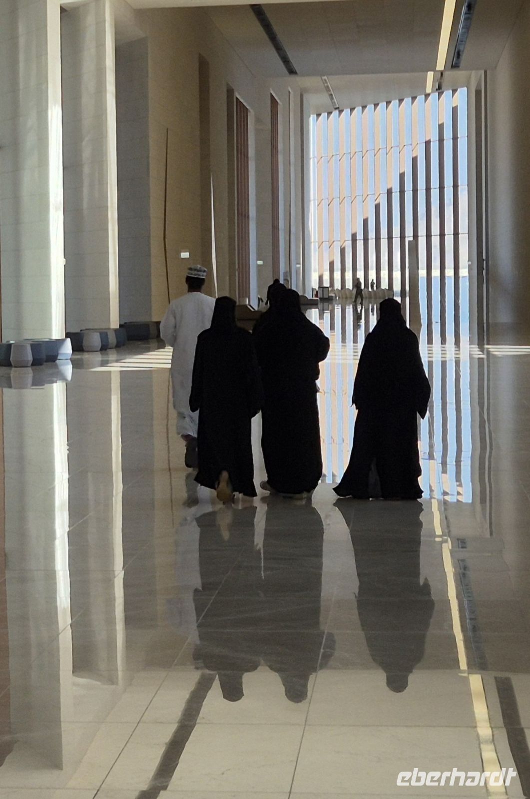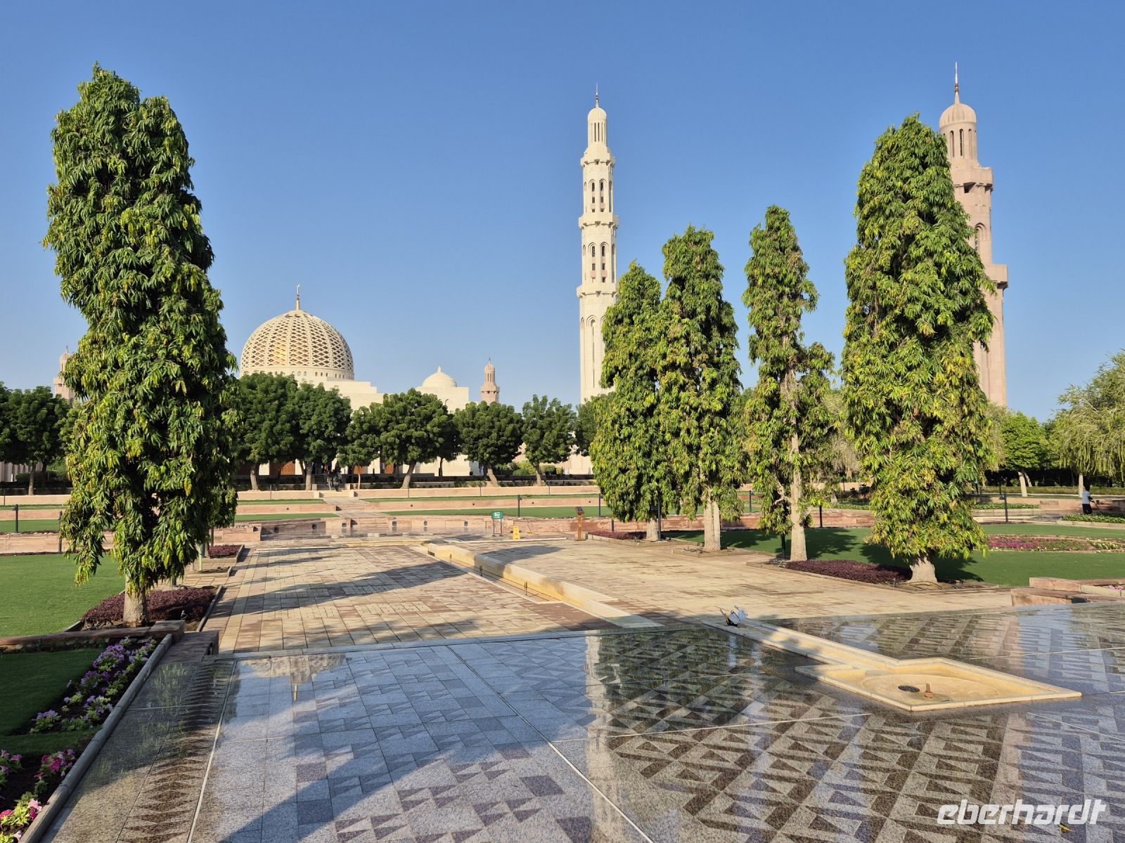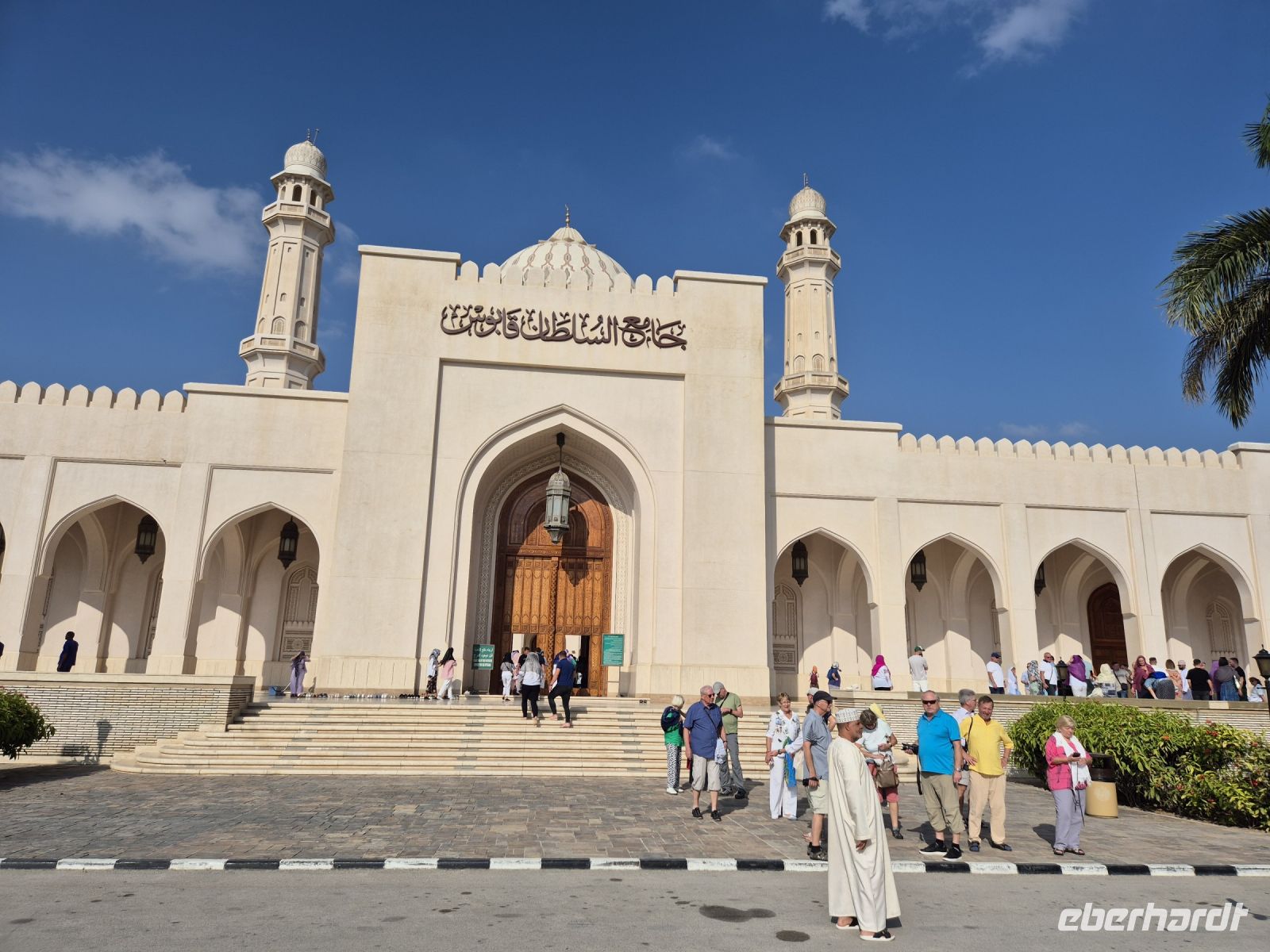 Zunächst besuchen wir die Große Sultan Qaboos Moschee. Hier gibt es am Morgen bei unserer Ankunft glücklicherweise noch nicht viele Besucher. Die Moschee ist neben der gleichnamigen Moschee in Salalah die einzige Moschee des Landes, welche Nichtmuslime betreten dürfen. Zunächst wird am Eingang die Bekleidung, insbesondere der Damen kontrolliert. Dann betreten wir einen grünen und blühenden Garten mit Wasserbächen. Dazu strahlt der polierte Marmorboden. Wir besichtigen die Frauengebetshalle, die 750 Muslima Platz zum Beten bietet. Muhammad zeigt uns zwischenzeitlich wie man sich als Muslim vor dem Gebet reinigt. Höhepunkt ist sicherlich die prächtige Hauptgebetshalle für die Männer mit dem riesigen persischen Teppich, Swarovski-Leuchtern sowie den azurblauen Fayencen der Gebetsnische.