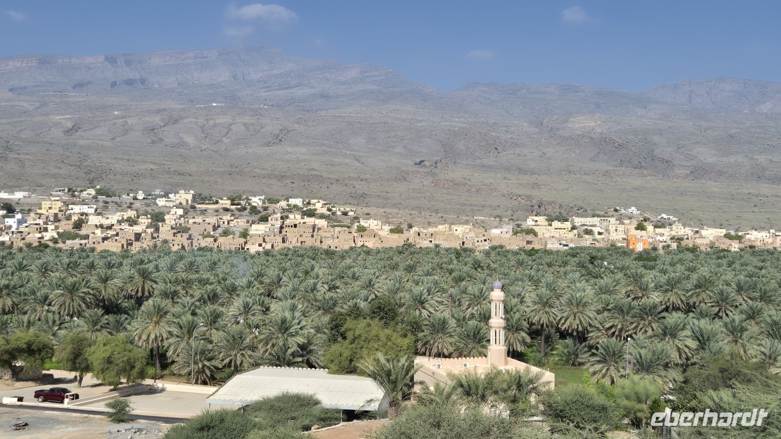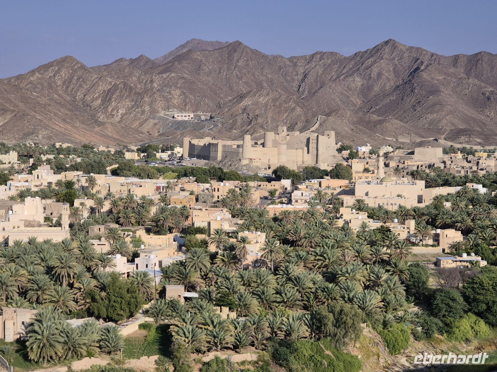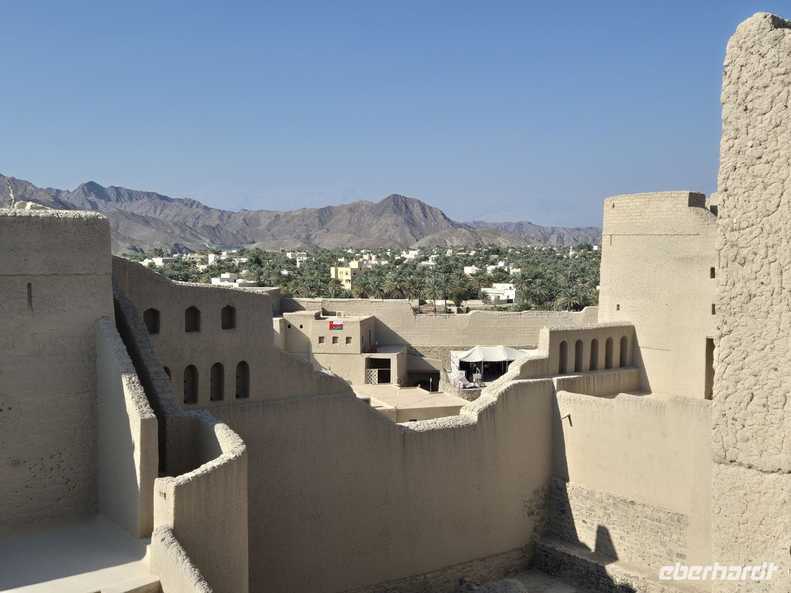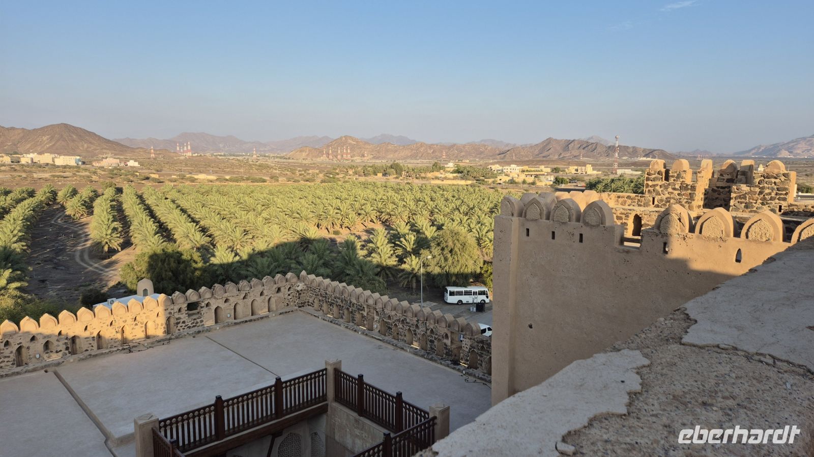 Anschließend verlassen wir die Küstenregion und wenden uns dem Hajar-Gebirge zu. Zu Füßen eines mächtigen Bergmassives erhebt sich, auf einem Felsen errichtet, die Festung von Nakhl. Im Innenhof der Festung sind aufgrund der Ferien zum Nationalfeiertag Stände mit verschiedenen omanischen Speisen aufgebaut. Vom Obergeschoss des Forts haben wir einen wunderschönen Ausblick auf die Oase.