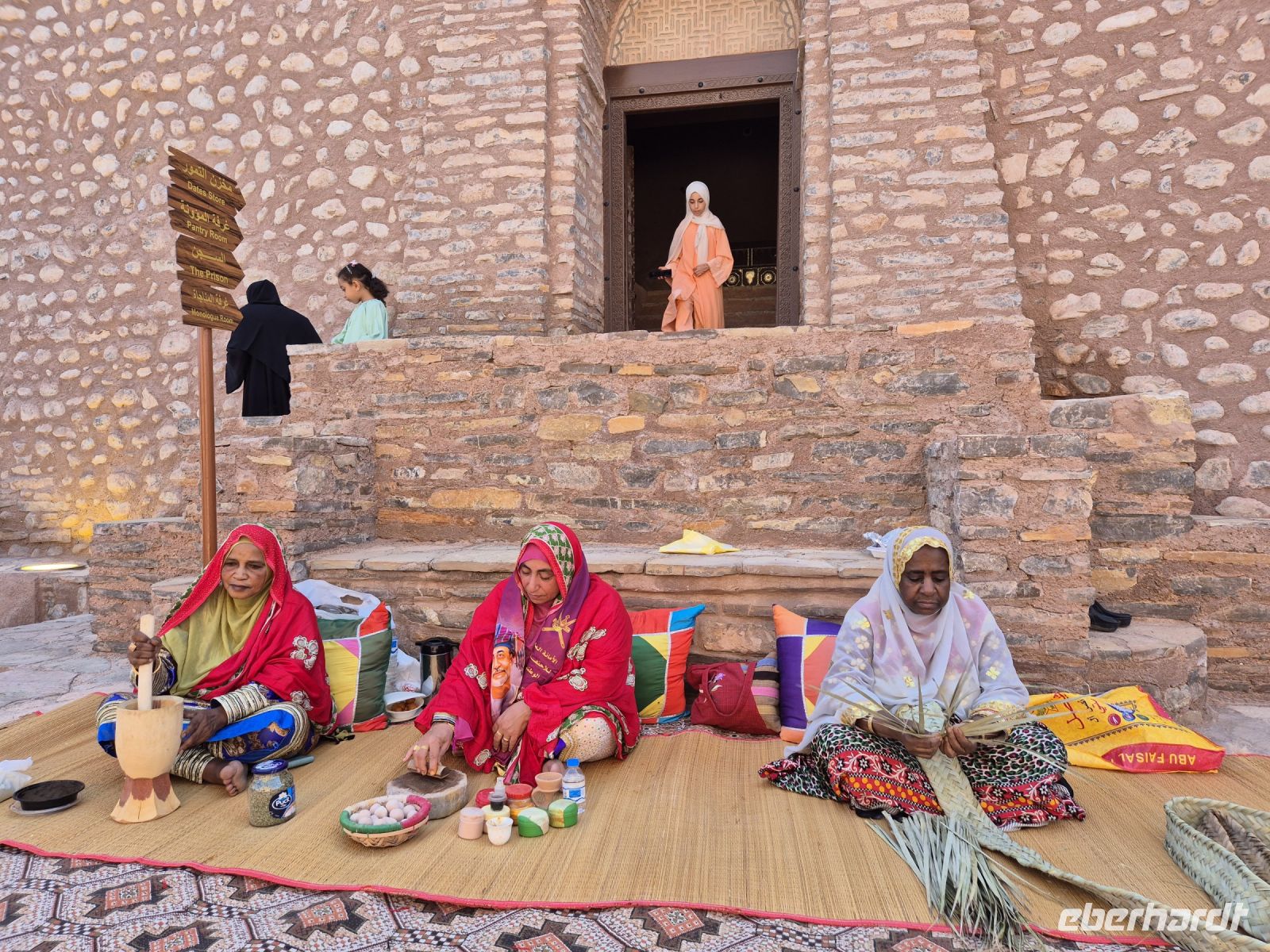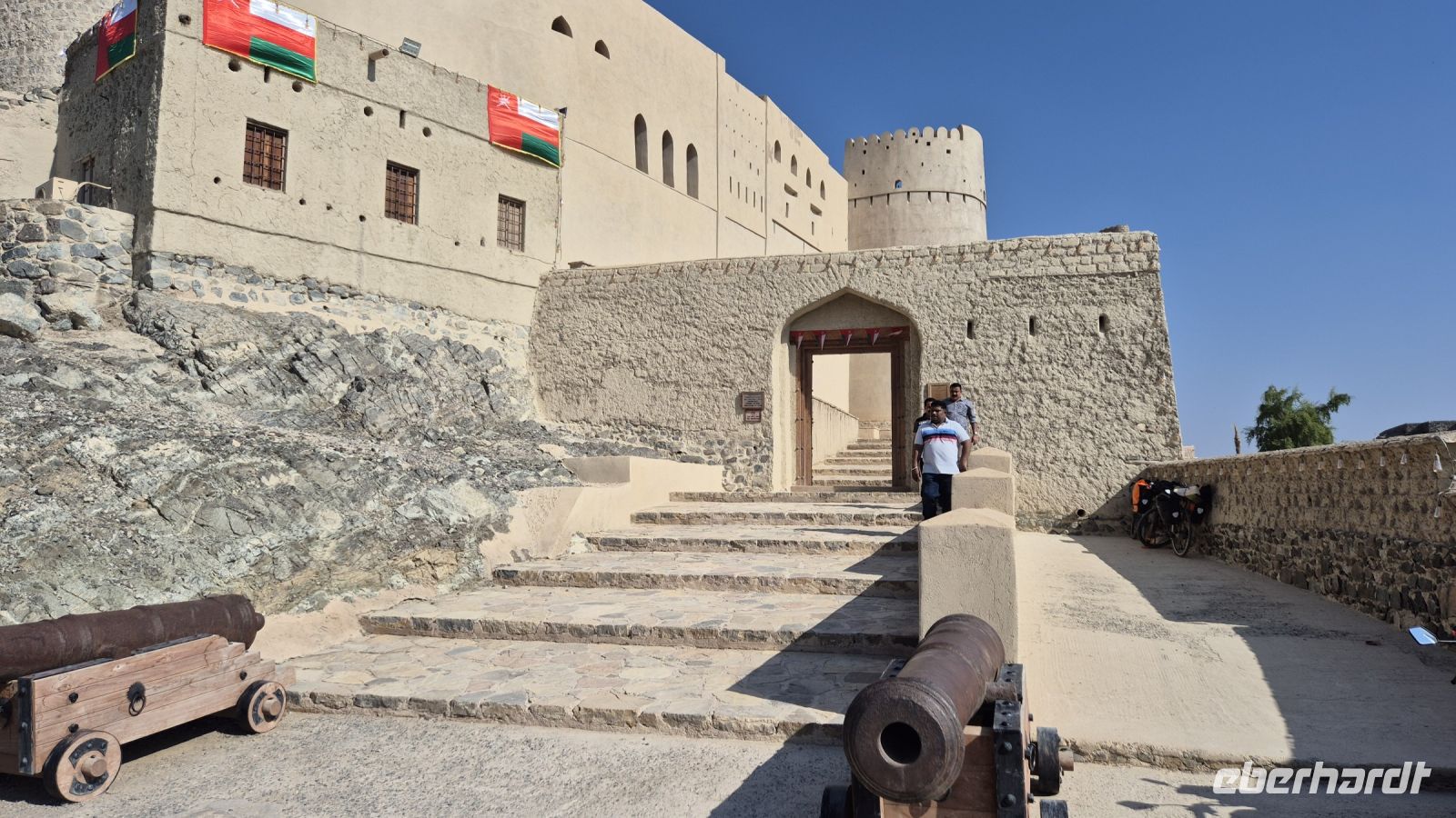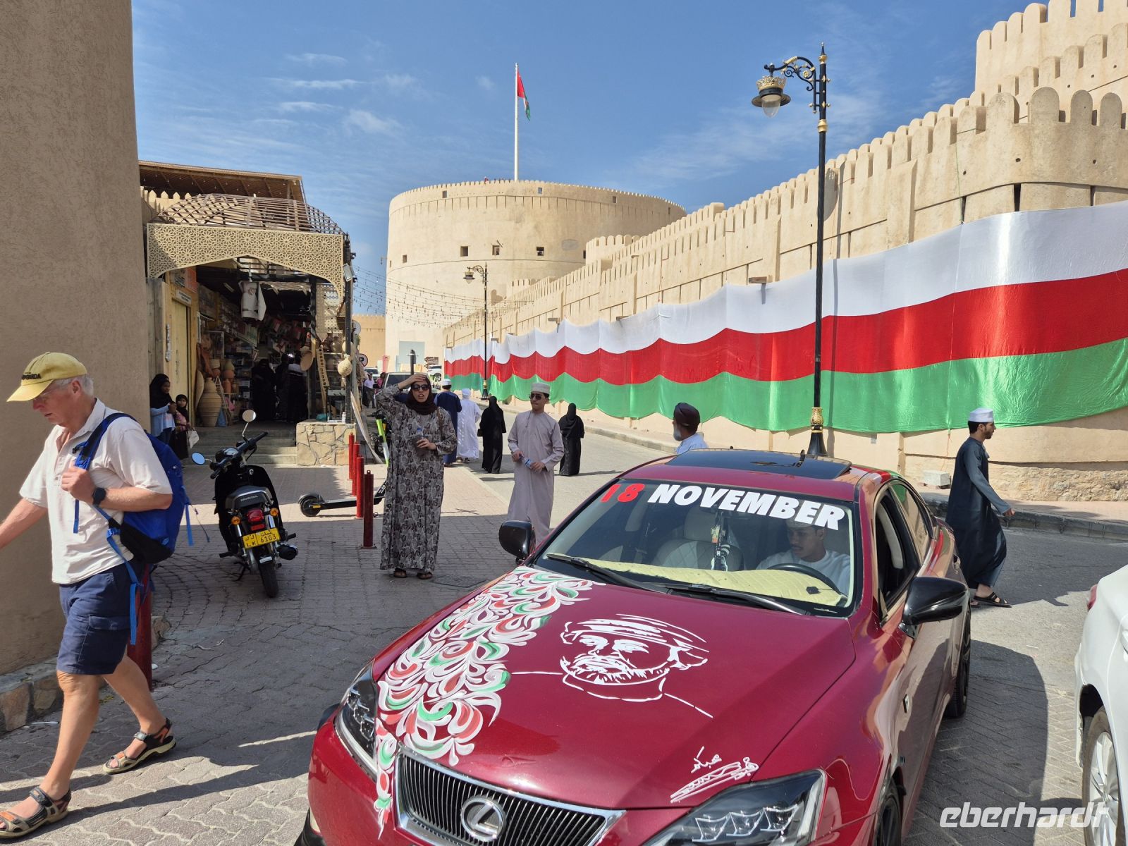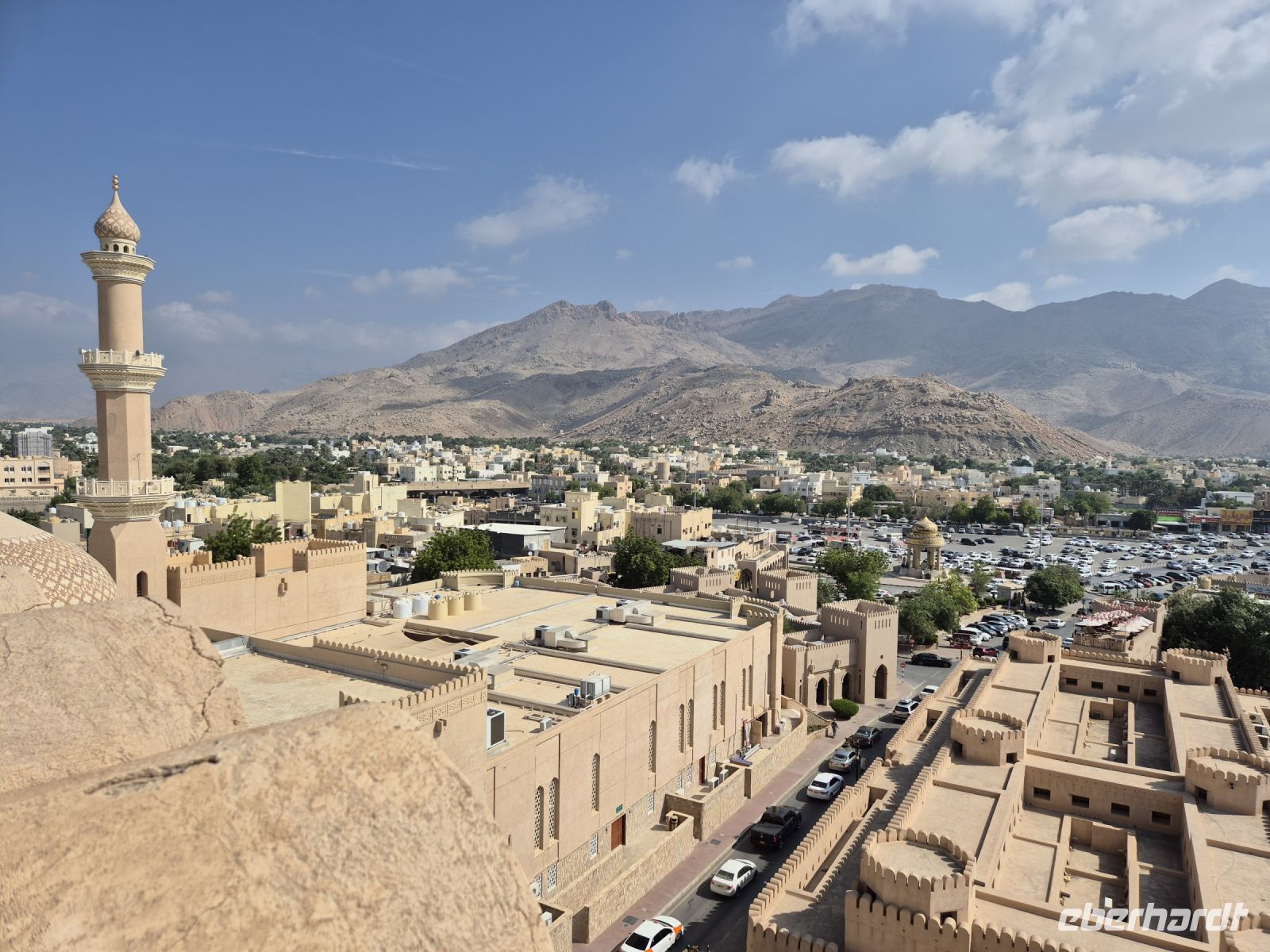 Anschließend verlassen wir die Küstenregion und wenden uns dem Hajar-Gebirge zu. Zu Füßen eines mächtigen Bergmassives erhebt sich, auf einem Felsen errichtet, die Festung von Nakhl. Im Innenhof der Festung sind aufgrund der Ferien zum Nationalfeiertag Stände mit verschiedenen omanischen Speisen aufgebaut. Vom Obergeschoss des Forts haben wir einen wunderschönen Ausblick auf die Oase.