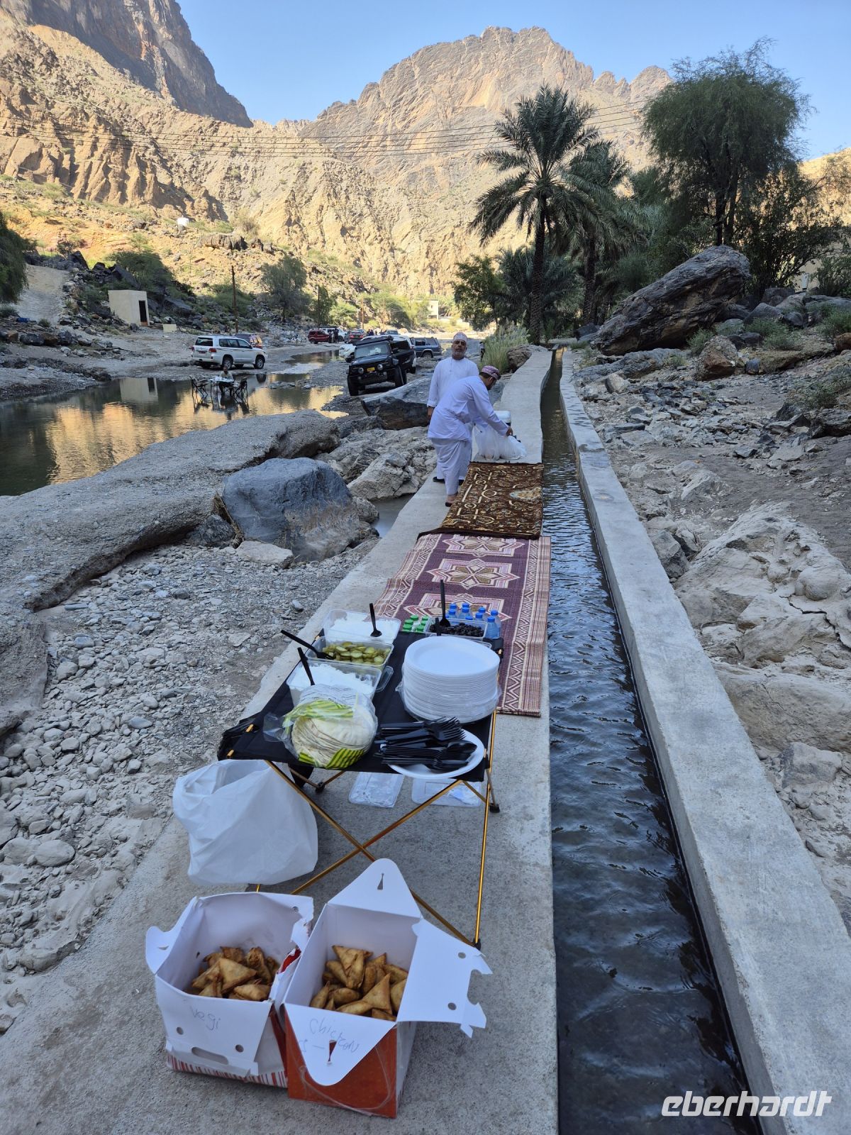 Zur Mittagszeit halten wir uns im Wadi Darbat auf. Es ist das vielleicht bekannteste und schönste Tal der Region. In einem schattigen Waldstück rasten wir für unser Picknick.