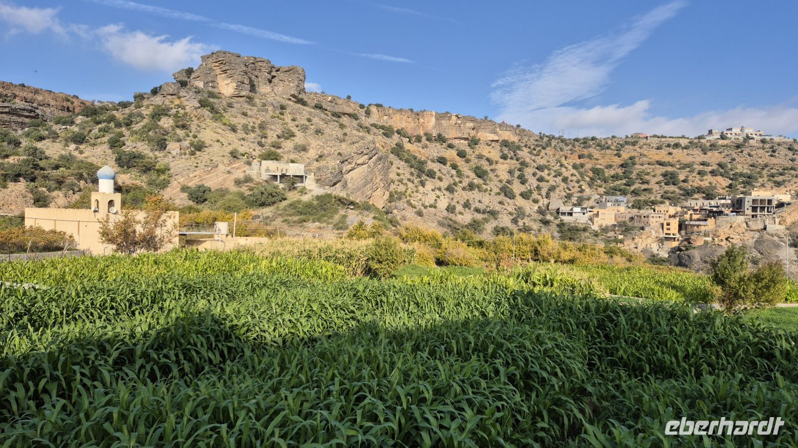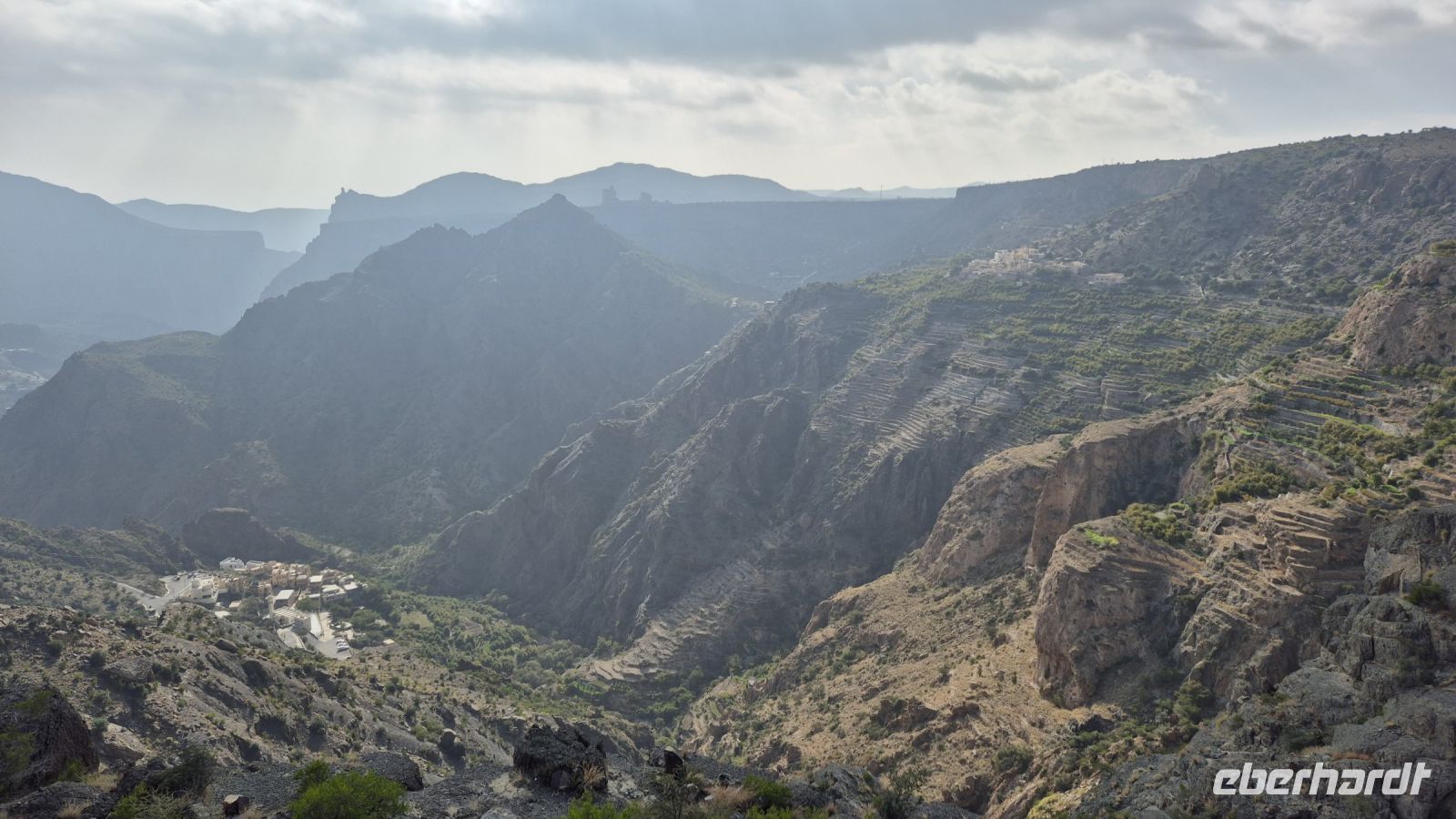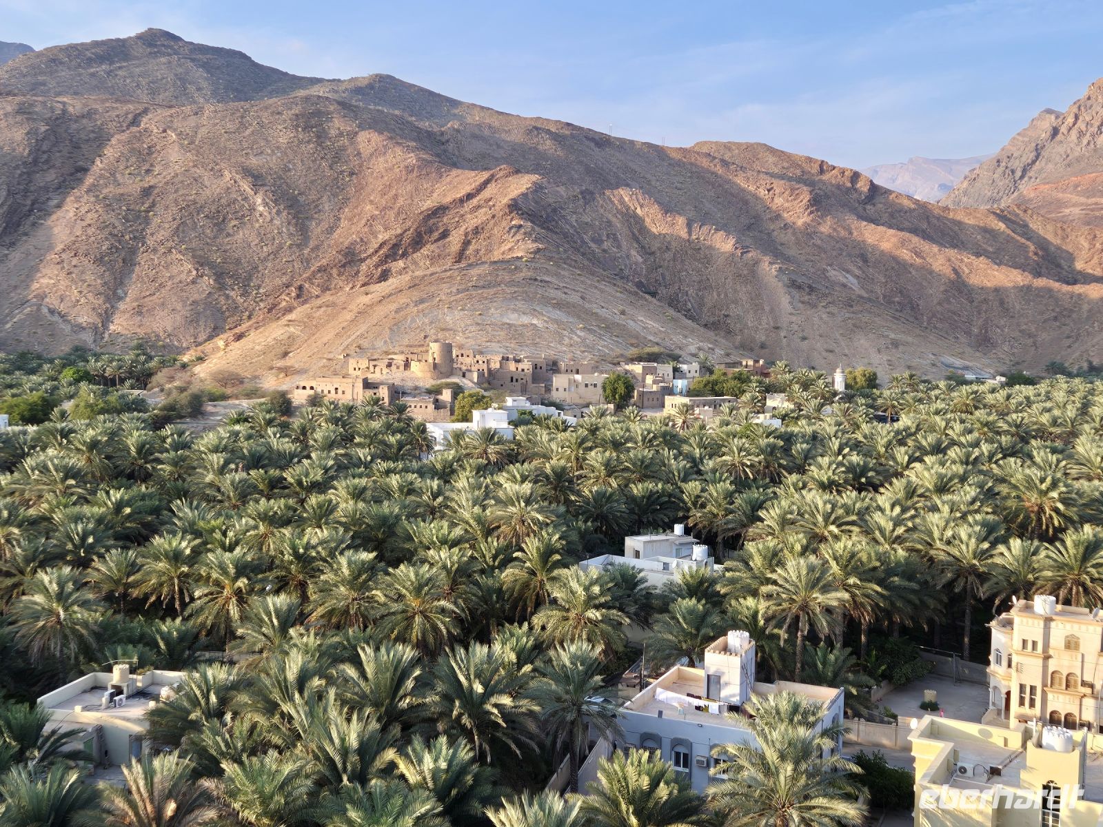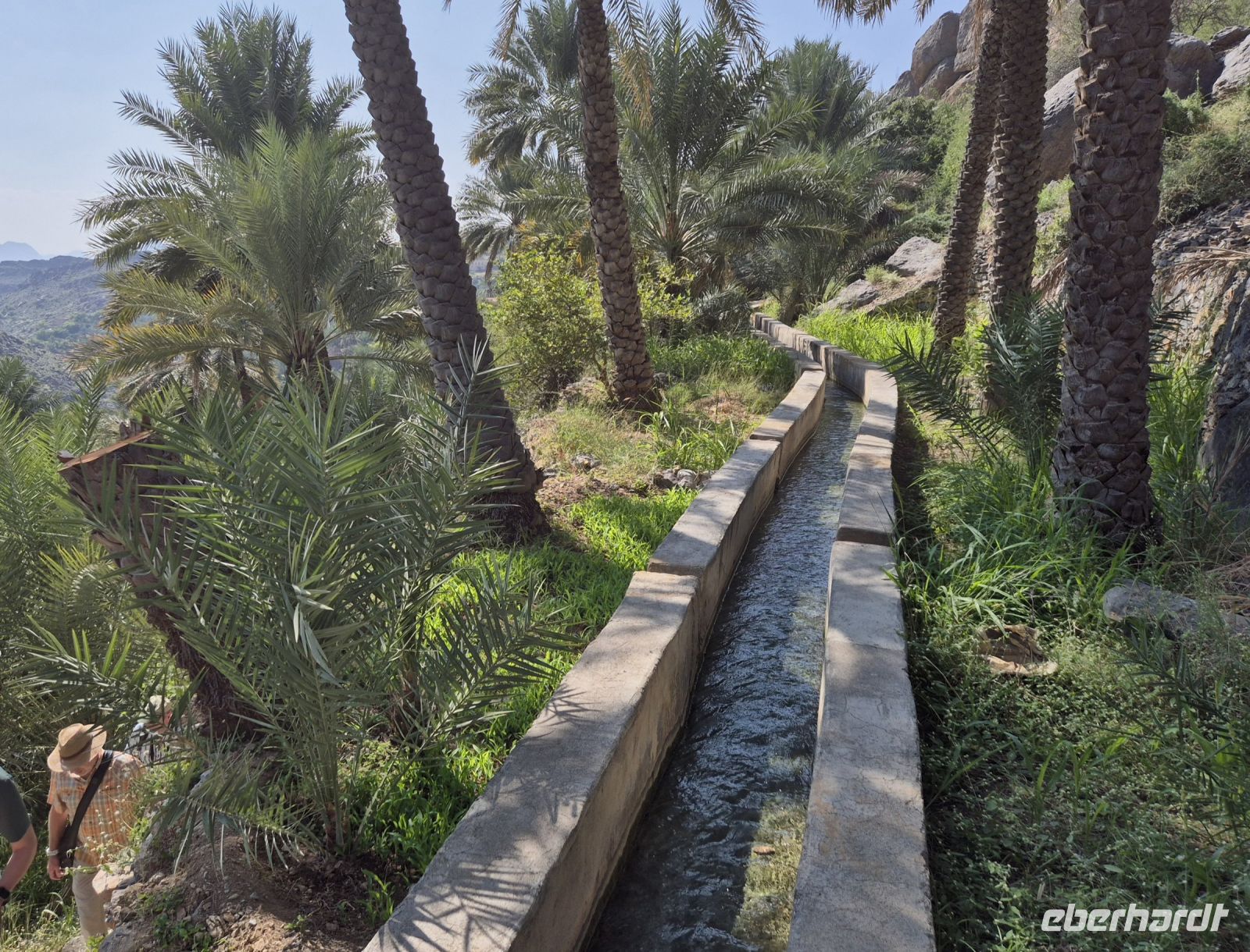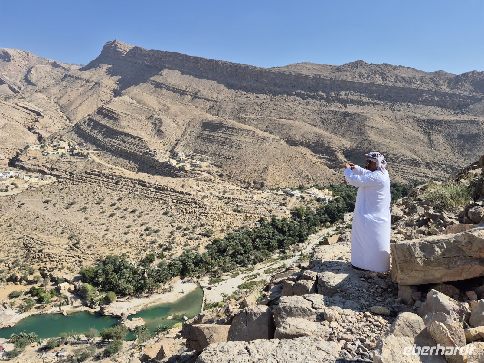 Heute ist Donnerstag, einer der zwei zusätzlichen von HM Sultan Haitham ausgerufenen Feiertage. So unternehmen viele Omanis Ausflüge wie z. B. in das beliebte Dorf Misfat Al Abreen. Es ist kein Geheimtipp und sehr bekannt für seine Terrassenfelder und die idyllische Lage in den Bergen. Wir bekommen hier den vollen Besucheransturm zu spüren, haben aber Glück, dass der Ort noch nicht abgeriegelt ist (was im Laufe des Tages passieren wird). Wir unternehmen in Misfat Al Abreen eine kleine Wanderung entlang der Terrassen und auf einem Bewässerungskanal (Falaj). Weiter geht es nun nach Al Hamra, wo wir durch die Dattelpalmenoase spazieren, um dann von einer erhöhten Stelle den Ausblick auf die Oase und verlassene Lehmhäuser zu genießen.