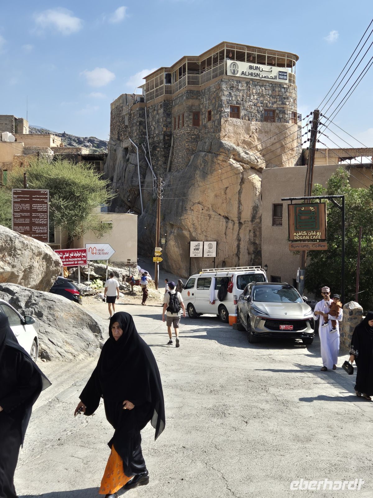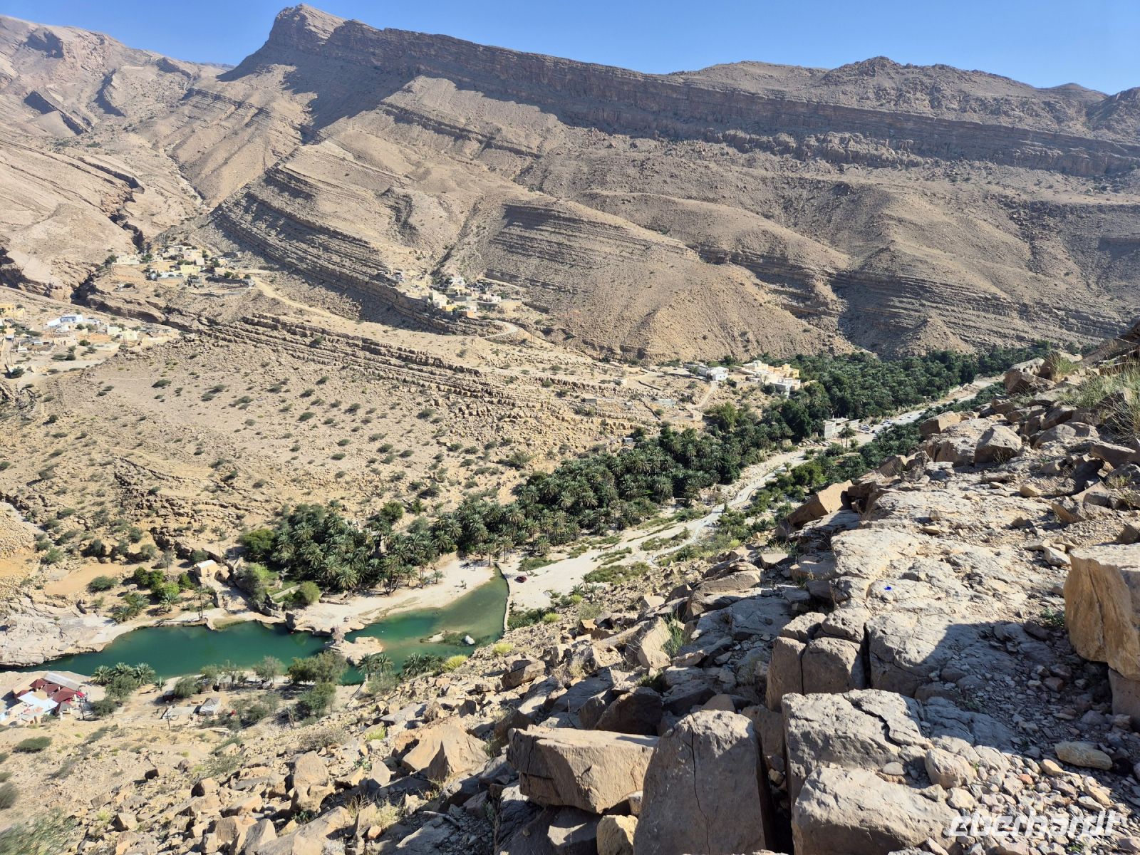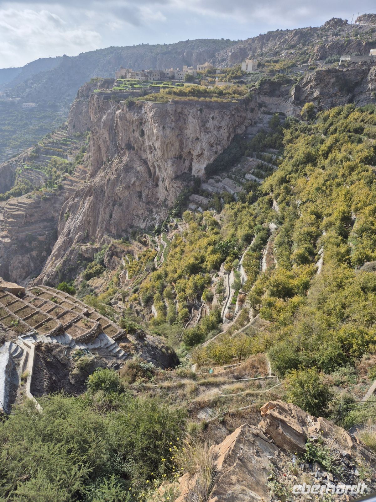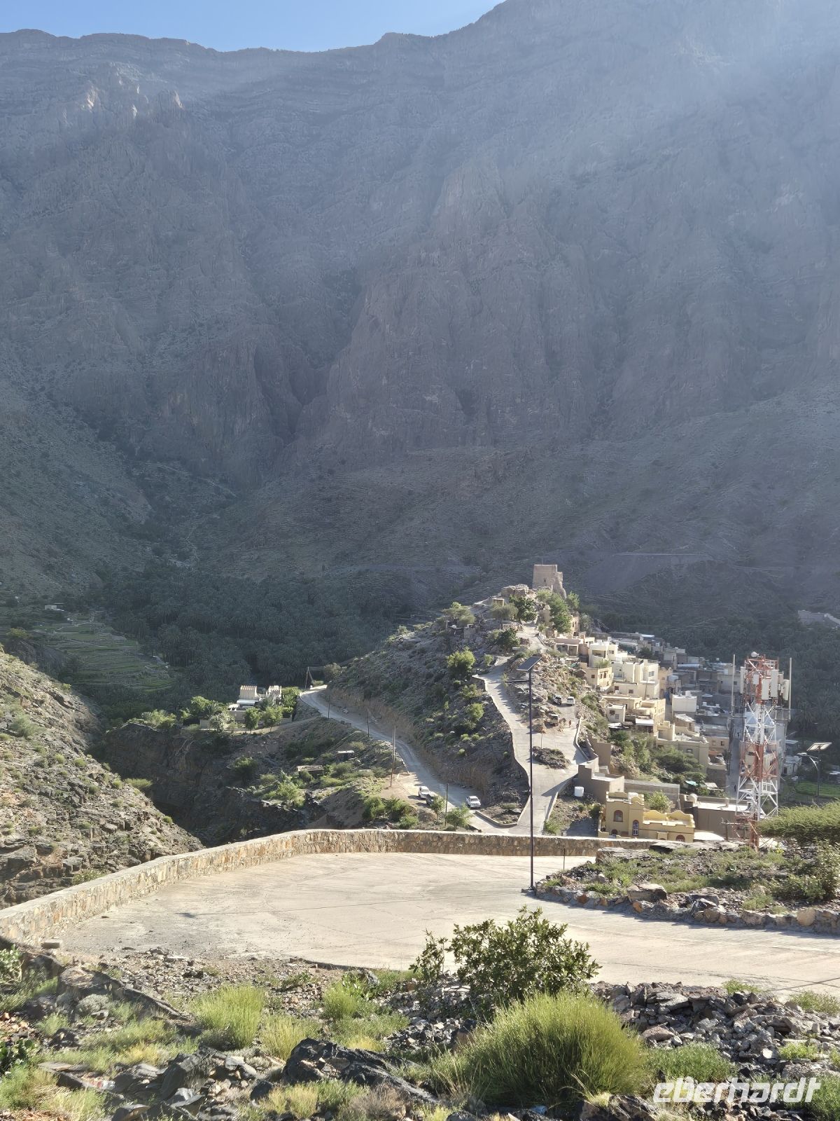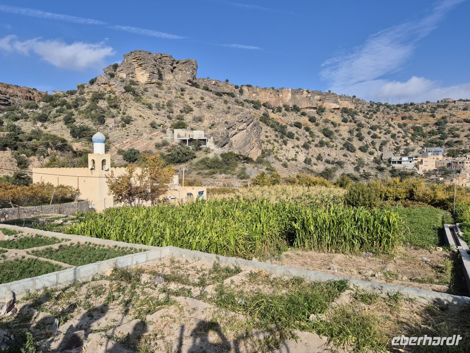 Heute ist Donnerstag, einer der zwei zusätzlichen von HM Sultan Haitham ausgerufenen Feiertage. So unternehmen viele Omanis Ausflüge wie z. B. in das beliebte Dorf Misfat Al Abreen. Es ist kein Geheimtipp und sehr bekannt für seine Terrassenfelder und die idyllische Lage in den Bergen. Wir bekommen hier den vollen Besucheransturm zu spüren, haben aber Glück, dass der Ort noch nicht abgeriegelt ist (was im Laufe des Tages passieren wird). Wir unternehmen in Misfat Al Abreen eine kleine Wanderung entlang der Terrassen und auf einem Bewässerungskanal (Falaj). Weiter geht es nun nach Al Hamra, wo wir durch die Dattelpalmenoase spazieren, um dann von einer erhöhten Stelle den Ausblick auf die Oase und verlassene Lehmhäuser zu genießen.