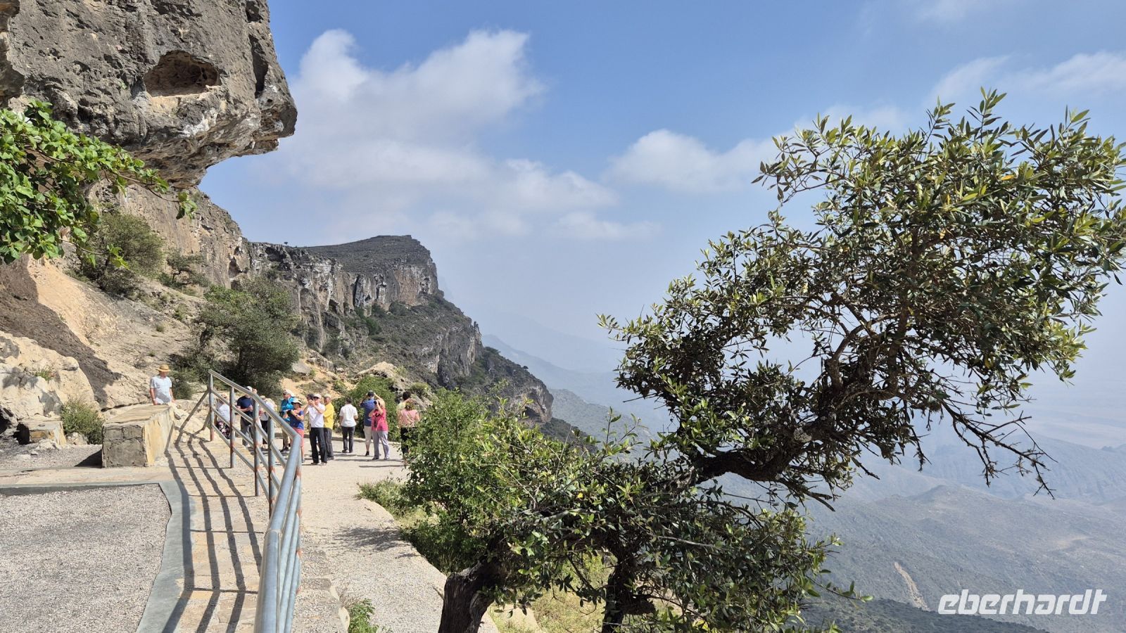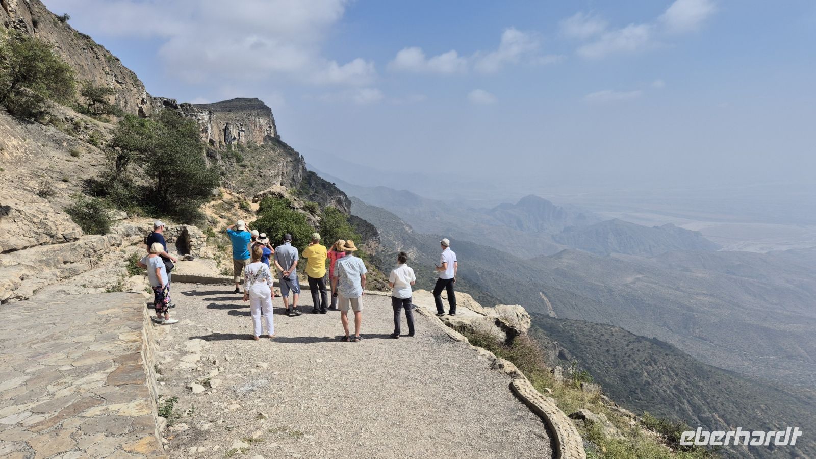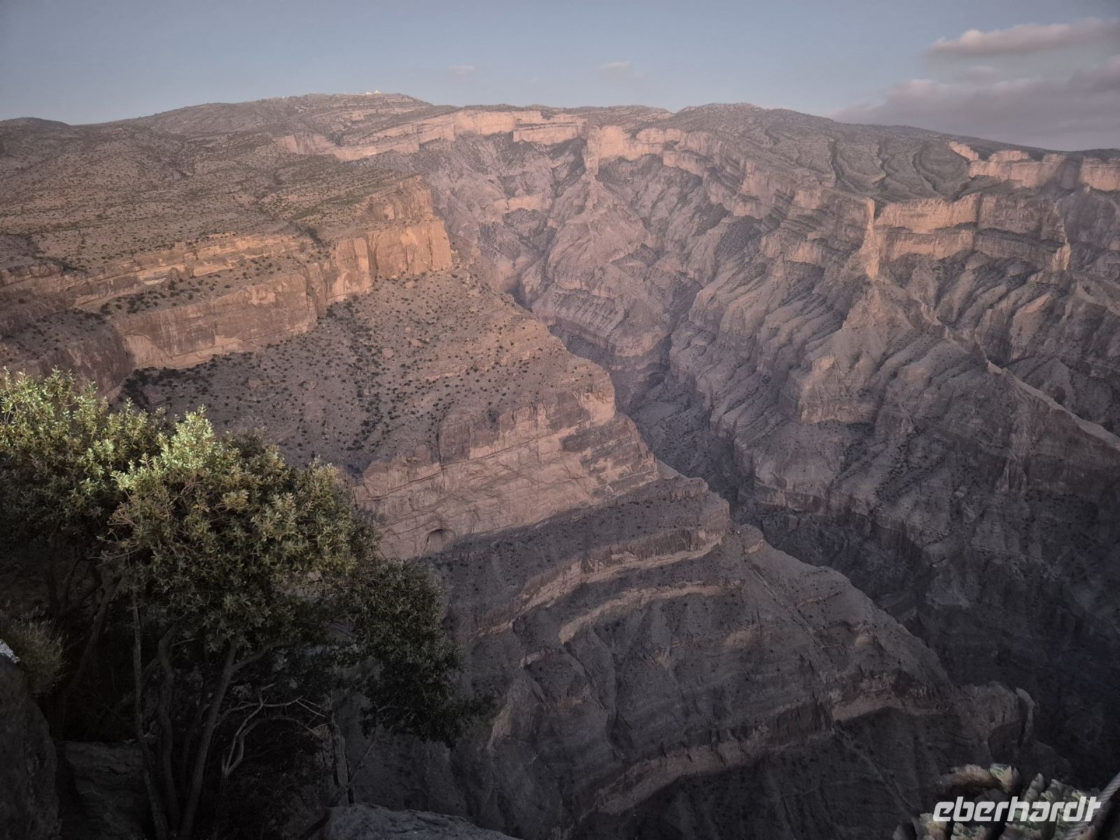 Erstmals bei einer Eberhardt-Reise durchqueren wir die Berge offroad durch das landschaftlich faszinierende Wadi Bani Awf. Im Tal ist es erstaunlich grün. Immer wieder ergeben sich tolle Perspektiven und an schattigen Plätzen und an Wasserstellen lassen sich Omanis wie Gastarbeiter für ein Picknick nieder. Auch wir suchen uns am Eingang eines mit Wasser gefüllten Canyons einen schattigen Ort für unser Picknick. Schließlich erreichen wir auf 2.010 Meter den höchsten Punkt, dann gelangen wir in die Ebene von Al Hamra um aber kurz darauf in die nächste Schlucht, das Wadi Ghul, hineinzufahren. Über eine anfangs noch gut ausgebaute Serpentinenstraße nähern wir uns dem heute letzten Ziel, dem Grand Canyon von Oman. Kurz nach dem Sonnenuntergang können wir in der Abenddämmerung auf ca. 2.000 Meter Höhe die Weite des Canyons erleben. Gleich in der Nähe des Grand Canyon checken wir in unser „Himmelshotel“ (Sama = arab. Himmel) ein. Aufgrund der Höhenlage hat es sich nach dem Sonnenuntergang schon spürbar abgekühlt. In der Nacht fällt die Temperatur bis auf 10 Grad.