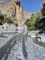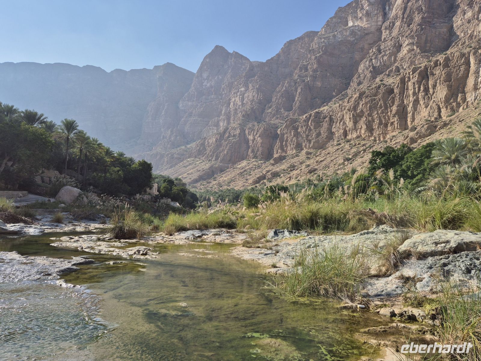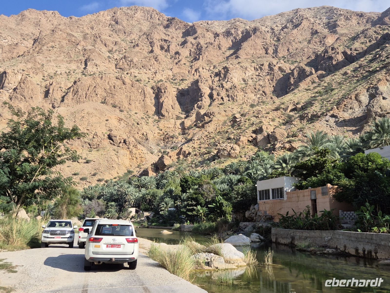 Mit den ersten Sonnenstrahlen steigen die Temperaturen rasch an. Schön wäre noch, wenn Wasser aus dem Hahn kommen würde, leider haben wir am Morgen zwischenzeitlich ein Problem mit der Wasserversorgung... Bevor wir uns hinunter in die Ebene begeben, halten wir nochmals am Grand Canyon von Oman, um ihn jetzt noch einmal bei Tageslicht zu betrachten. Hinter dem Grand Canyon ist der höchste Berg des Oman, der 3009 Meter hohe Jabal Shams zu sehen. Von unserem Standort aus betrachtet fallen hier die Berge etwa 1.000 Meter senkrecht ab. Am Fuße des Canyons befindet sich das Wadi Nakher – das ist unser nächstes Ziel. Zunächst fahren wir mit unseren Allradwagen (hier brauchen wir auch die Allradfunktion) ca. 3 km ins Wadi Nakher hinein. In der Schlucht unternehmen wir eine kleine Wanderung. Hier befinden sich gewaltige Felsbrocken und ein ständig wechselnder Wasserlauf, den wir immer wieder irgendwie überqueren.