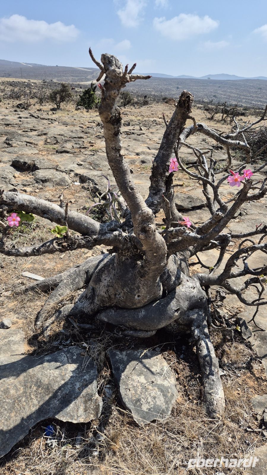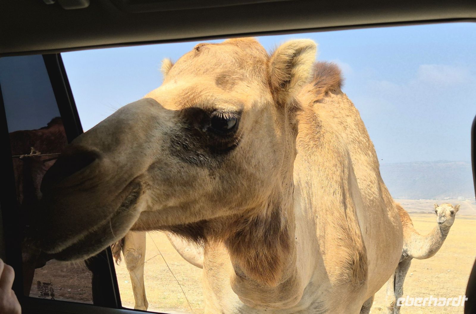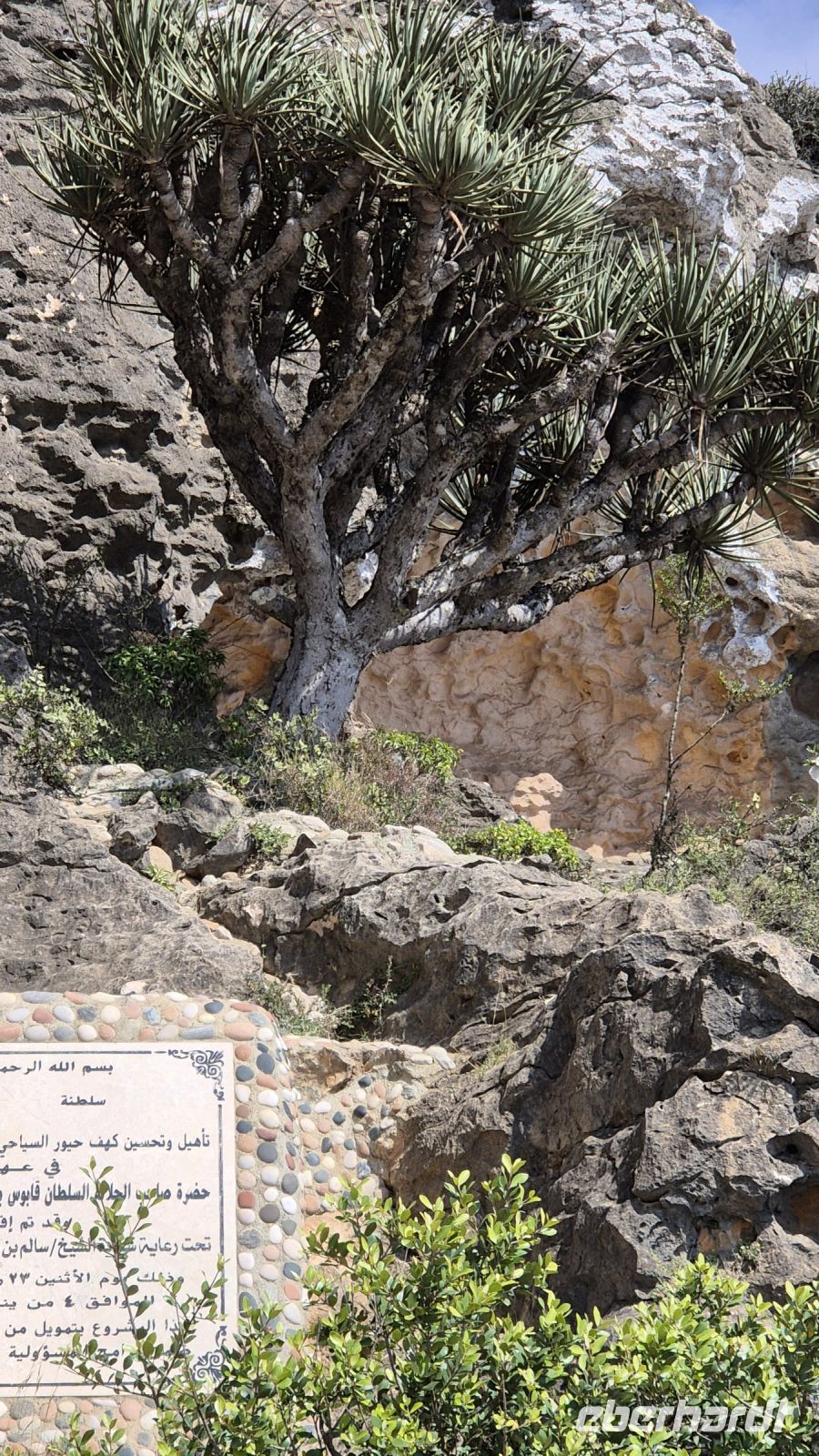 Wir verlassen die Küste Richtung Jabal Samhan. Dies ist das höchst gelegene Bergmassiv der Region. Der Gipfel selbst mit rund 1.800 Meter und angrenzende Regionen sind nicht zugänglich, da es Schutzgebiet für den seltenen Arabischen Leoparden ist. Während der Fahrt zum Aussichtspunkt am Jabal Samhan sind viele von uns erstaunt über die ungewöhnliche Fauna und Flora: hunderte von Kühen weiden in dem hügeligen Land und über weite Flächen wächst der hier von den Omanis sogenannte „Elephantenfuß“, es handelt sich richtiger Weise um die Wüstenrose (Adenium obesum, desert rose). Ihre Blätter hat sie in dieser trockenen Jahreszeit eingespart, aber sie blüht sehr schön in rosaroten Farbtönen. Am Aussichtspunkt selbst befindet sich einer der hier selten vorkommenden Drachenblutbäume (Dracaena cinnabari), ihre Heimat ist eigentlich die Insel Sokotra (Jemen). Während unserer Fahrt begegnen wir auch häufig Kamelen – mal queren sie in aller Ruhe die Straße, mal kommen sie nach Futter suchend direkt ans bzw. sogar ins Fenster unserer Jeeps ??