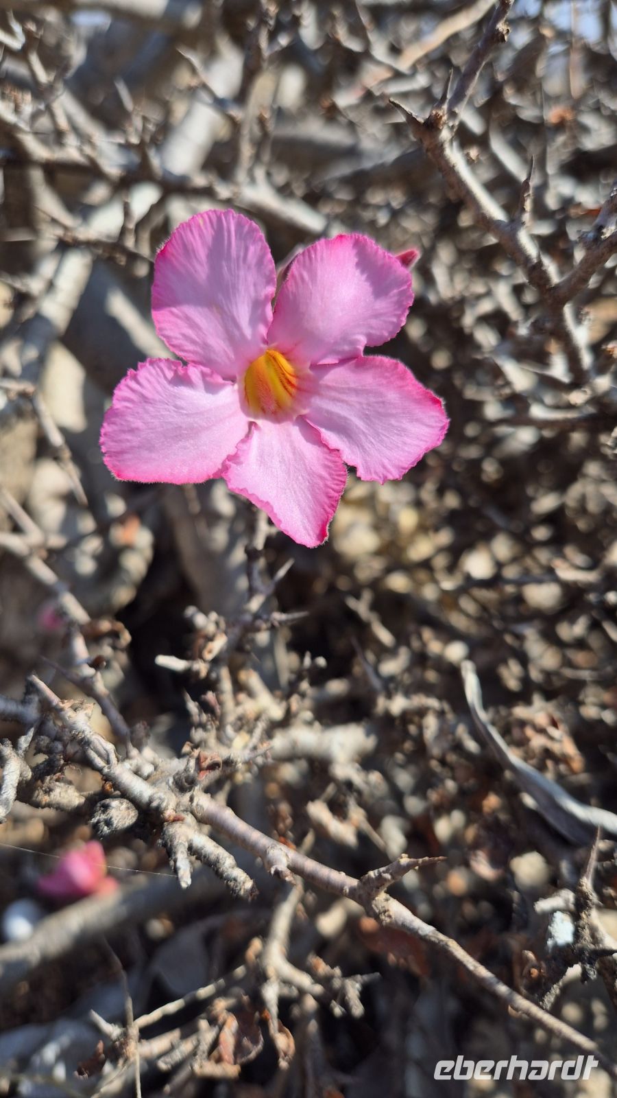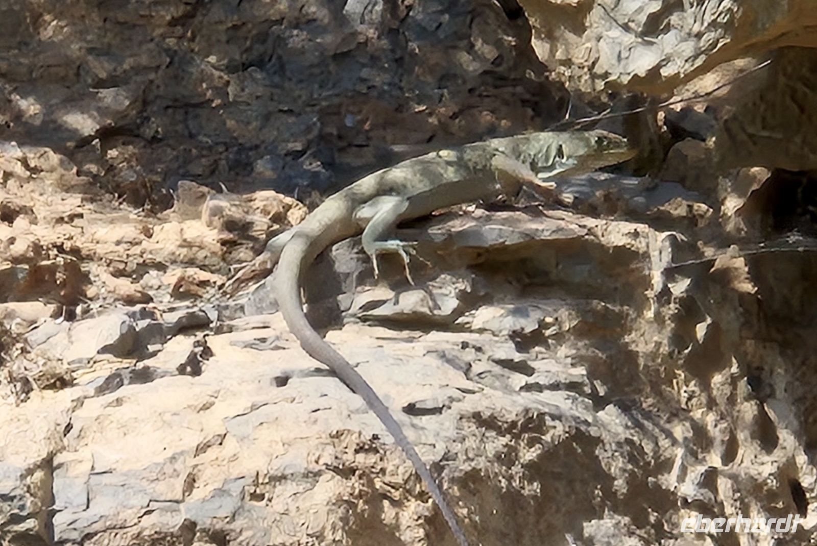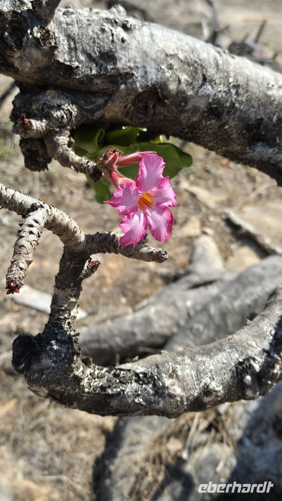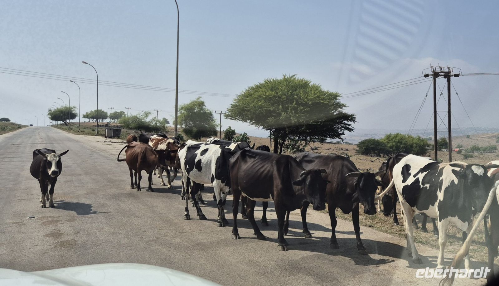 Wir verlassen die Küste Richtung Jabal Samhan. Dies ist das höchst gelegene Bergmassiv der Region. Der Gipfel selbst mit rund 1.800 Meter und angrenzende Regionen sind nicht zugänglich, da es Schutzgebiet für den seltenen Arabischen Leoparden ist. Während der Fahrt zum Aussichtspunkt am Jabal Samhan sind viele von uns erstaunt über die ungewöhnliche Fauna und Flora: hunderte von Kühen weiden in dem hügeligen Land und über weite Flächen wächst der hier von den Omanis sogenannte „Elephantenfuß“, es handelt sich richtiger Weise um die Wüstenrose (Adenium obesum, desert rose). Ihre Blätter hat sie in dieser trockenen Jahreszeit eingespart, aber sie blüht sehr schön in rosaroten Farbtönen. Am Aussichtspunkt selbst befindet sich einer der hier selten vorkommenden Drachenblutbäume (Dracaena cinnabari), ihre Heimat ist eigentlich die Insel Sokotra (Jemen). Während unserer Fahrt begegnen wir auch häufig Kamelen – mal queren sie in aller Ruhe die Straße, mal kommen sie nach Futter suchend direkt ans bzw. sogar ins Fenster unserer Jeeps ??