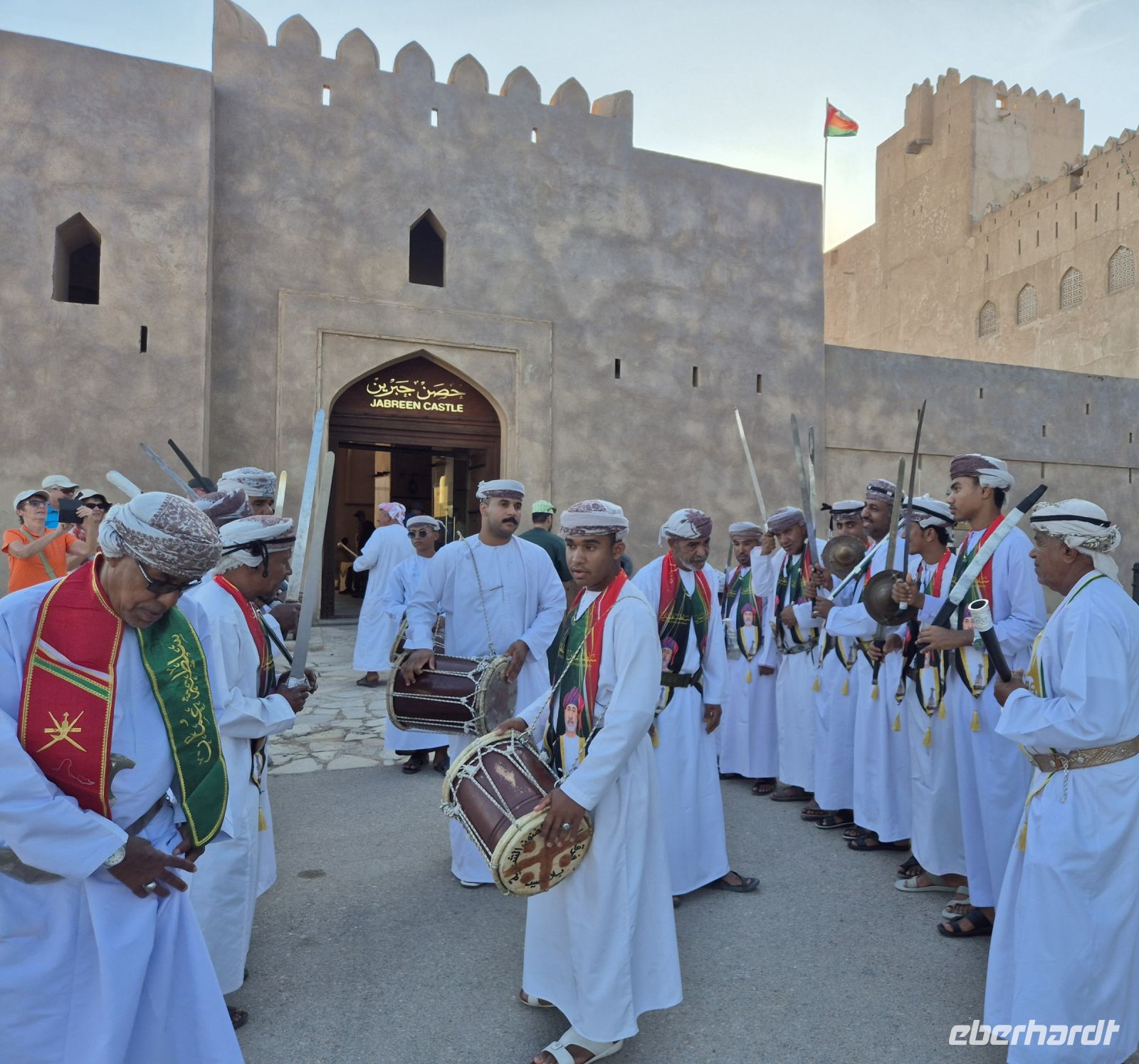 Nach unserer Mittagspause besichtigen wir noch das Schloss Jabrin. Dieses war ursprünglich ein Wohnfort und wurde später durch Verteidigungsanlagen erweitert. Bei unserer Ankunft gibt es vor dem Eingang des Forts einen Auftritt tanzender und singender Omanis anläßlich des Nationalfeiertages. Während des Rundgangs im Fort kommen wir in verschiedene Bereiche wie der Küche, Empfangsräume mit kunstvoll bemalten Decken, Räume für Wissenschaft wie z. B. Astronomie etc. vorbei. Von der Dachterrasse des Wohnforts haben wir einen tollen Ausblick auf die gewaltigen Berge des Felsen-Gebirges.
