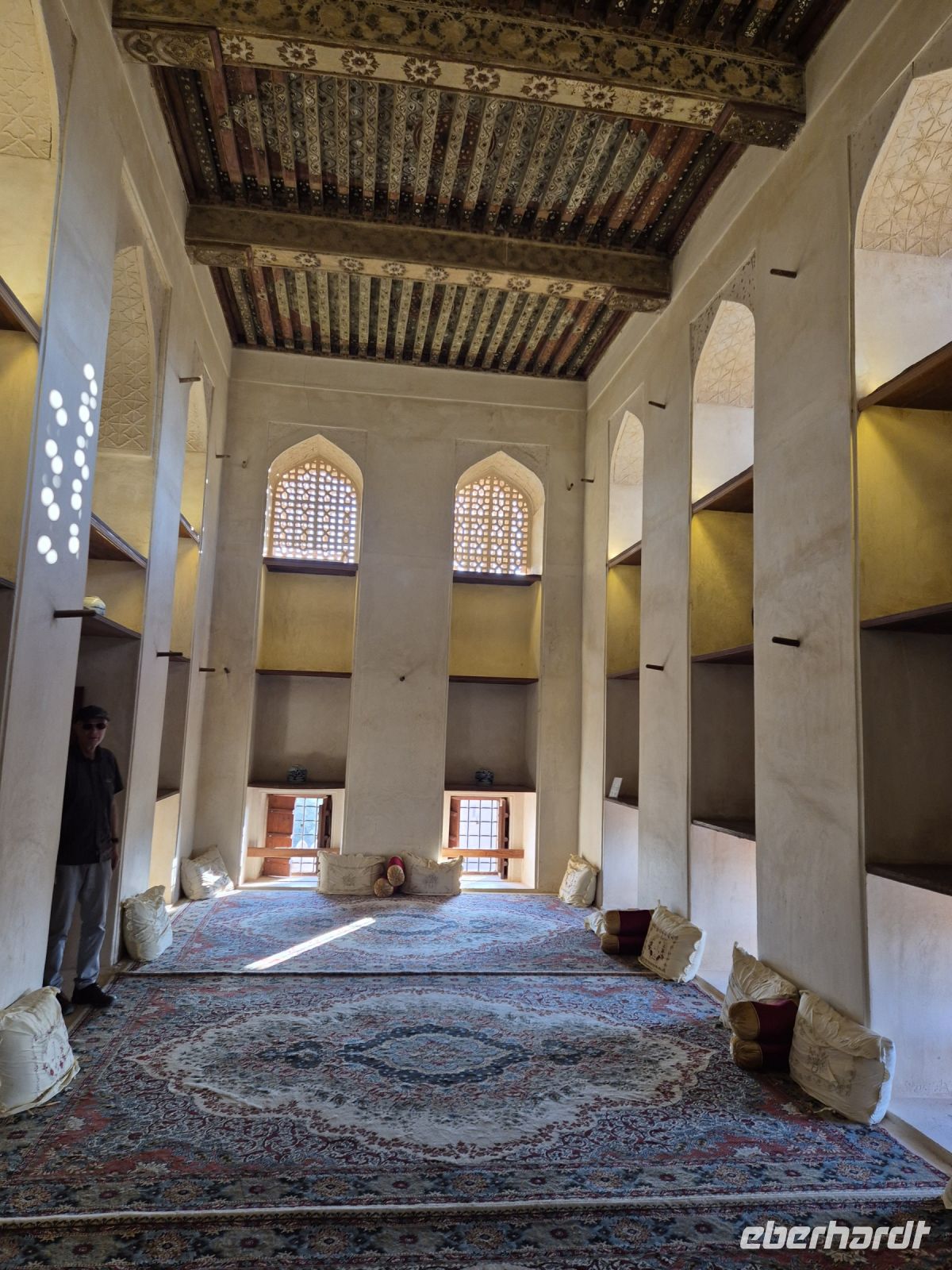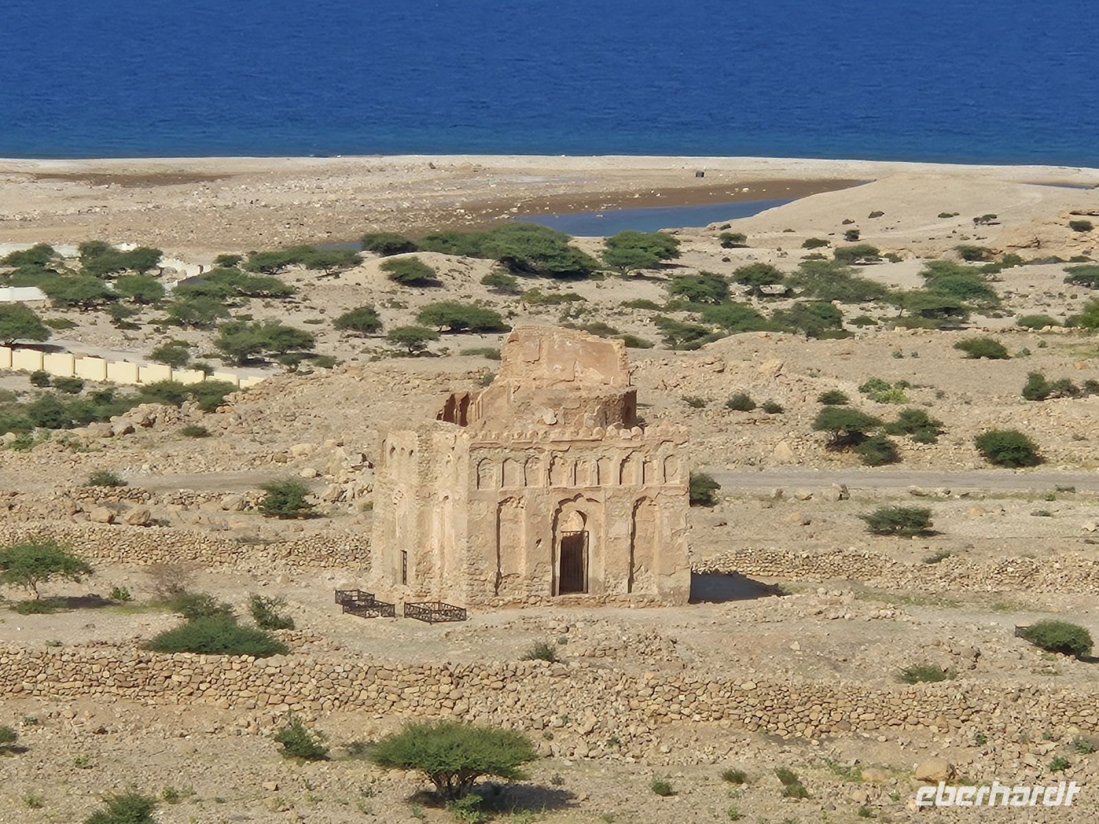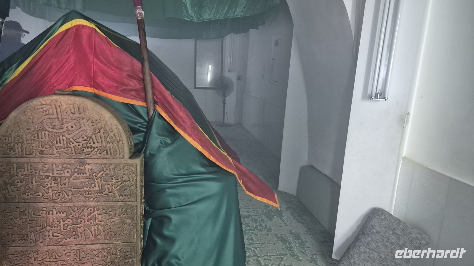 Zu guter letzt unternehmen wir noch einen Abstecher Grabmal des heiligen Shaikhs Muhammad bin Ali Al Alawi. Das Grabmal befindet sich auf einem Friedhof und ist schon aus der Ferne durch seine beiden weißen zwiebelförmigen Kuppeln zu erkennen. Muhammad bin Ali lebte hier im 12. Jahrhundert. Er war ein anerkannter und geachteter Gelehrter, zu dem viele Muslime auch aus entfernteren Regionen wie Ostafrika kamen, um sich bei ihm zum Koran und Islam unterrichten zu lassen. Sein Familienname „Al Alawi“ zeigt an, dass er aus der Familie des Propheten Muhammad stammt. Den Stammbaum sehen wir im Inneren des Grabes. Die stark mit Weihrauch benebelte Luft im Inneren lässt uns aber nur kurz verweilen…