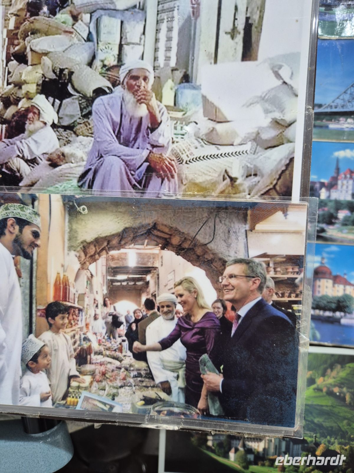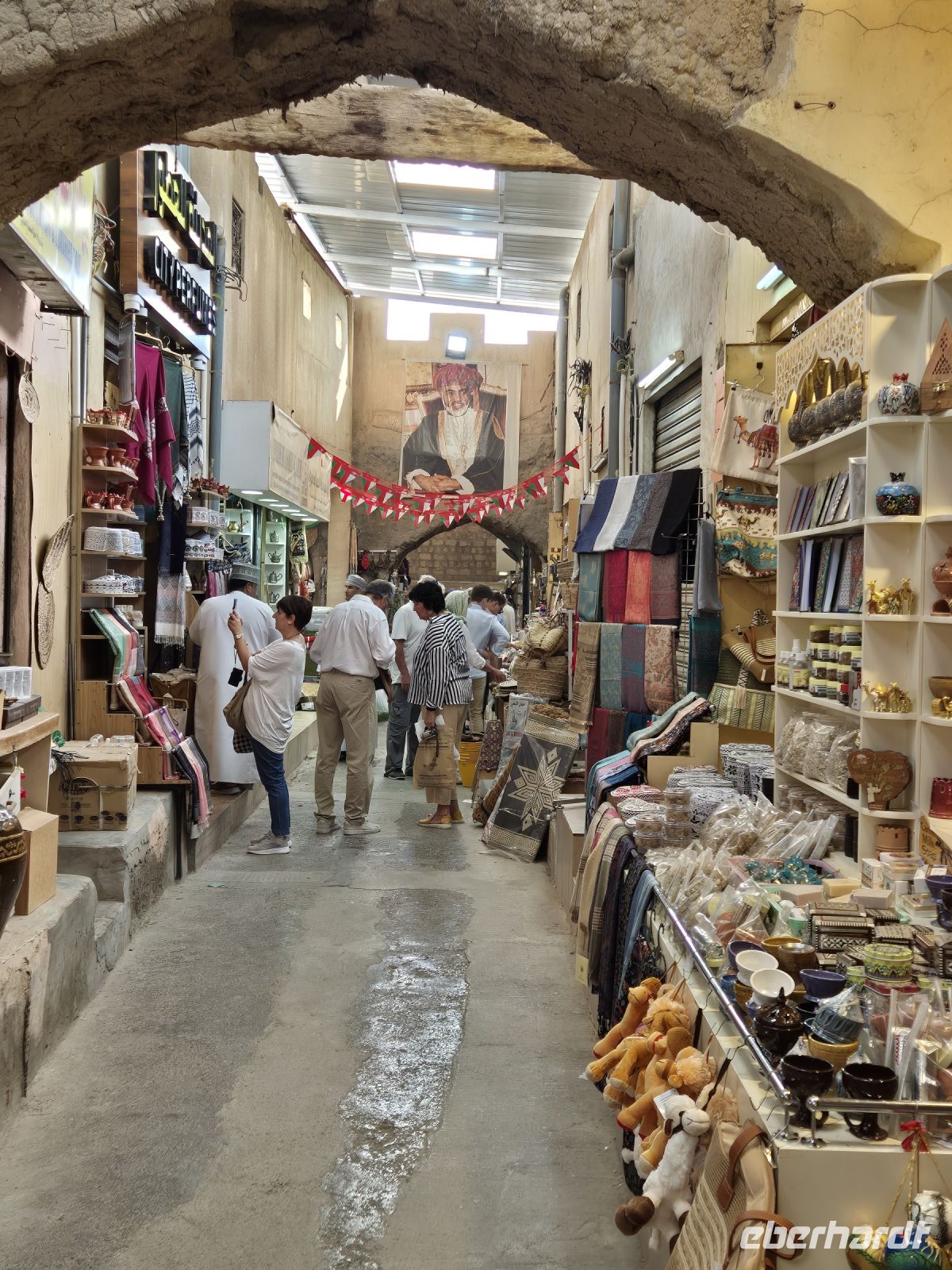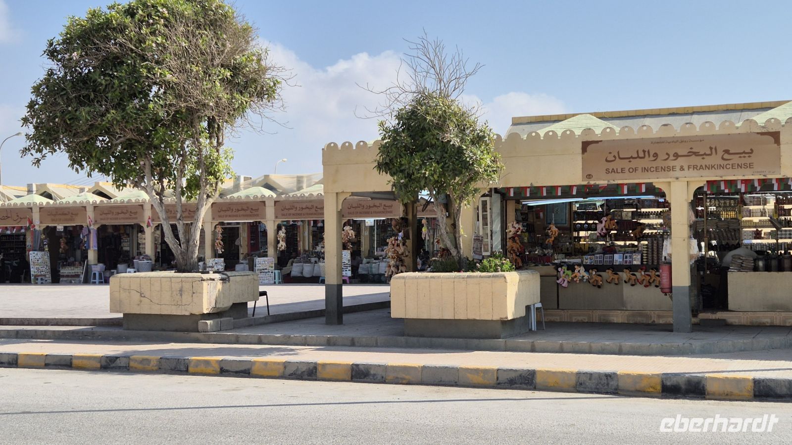 Gleich nebenan befinden sich die verbliebenen Stände des alten Weihrauchsouks. Das ist nun endlich der Moment, um an den Einkauf für zu Hause zu denken. Ein paar Kilo Weihrauch geht über die Ladentheke, dazu die typischen Weihrauchbrenner u. a. m. Ein paar Schritte weiter (wegen der intensiven Sonne aber mit Bus zurückgelegt) befindet sich der neue Haffa Souk. Dieser ist zu dieser Tageszeit fast Menschen leer.