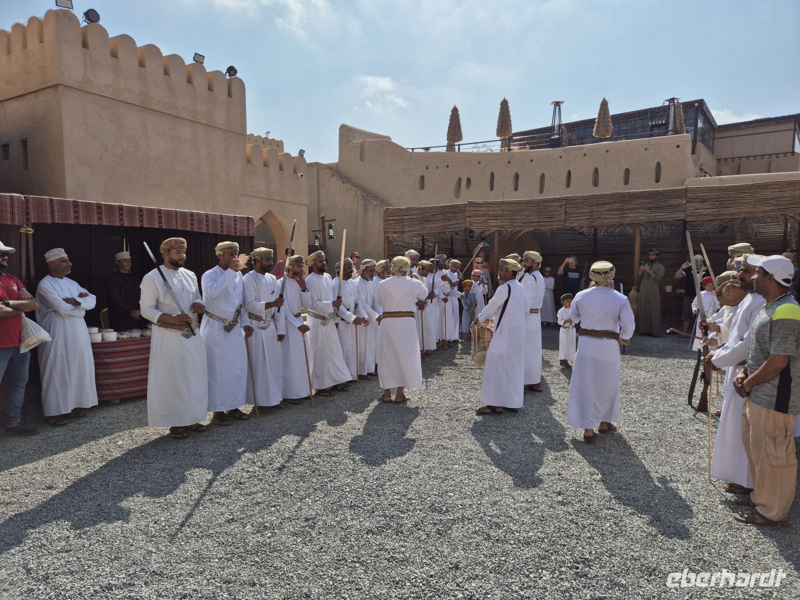 Unser erstes Ziel heute Morgen ist die Altstadt von Nizwa. Es ist Freitag, das bedeutet für die Omanis großer Einkauf für das anstehende Wochenende. So tauchen wir ein in das geschäftige Markttreiben. Im Prinzip gibt hier so ziemlich alles was die Region bietet, vom Lebendvieh (Rinder, Ziegen, Schafe) am traditionellen Viehmarkt, den sehr begehrten aber teuren Honigwaben von Wildbienen, Obst, Gemüse, Halwa, Töpferwaren, Datteln, Weihrauch, Silberschmuck, Krummdolchen etc. Bei einem Gewürzhändler im East Souk (die meisten Gewürze kommen aus Indien und Iran) werden wir sehr freundlich bedient. Er versteht auch gut Deutsch. An der Wand seines Geschäftes hängen noch alte Zeitungsartikel, welche vom Besuch des früheren Bundespräsidenten Wulff im Oman und in diesem Geschäft berichten. Nizwas Altstadt wird von einer mächtigen Festungsanlage geprägt. Als wir den Innenhof der Festung betreten, können wir eine Tanzaufführung omanischer Männer anlässlich der Feierlichkeiten zum Nationalfeiertag anschauen. Vom oberen Rand des riesigen Kanonenturms bietet sich ein sehr schöner Ausblick auf die Oasenstadt und die umliegenden Berge.
