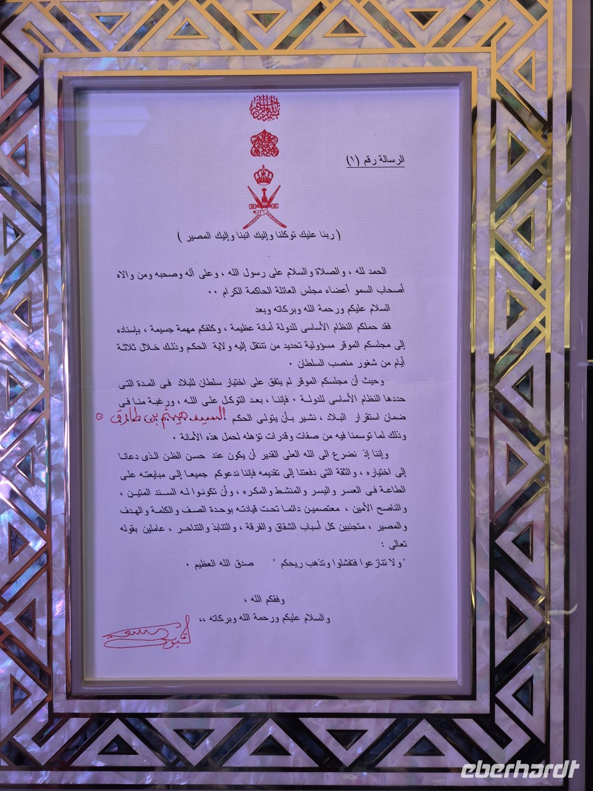 Wir besuchen die drei Bereiche des Museums - Vorgeschichte, Geschichte und Renaissance. Über weite Strecken ist das Museum aufgrund des Einsatzes visueller, akustischer und interaktiver Präsentationen selbsterklärend. Es gibt eine bemerkenswerte Ausstellung zur omanischen Seefahrt, einmalige historische Aufnahmen u. v. m. Unbedingt zu erwähnen ist das Originalschreiben aus dem Nachlass von Sultan Qaboos, in welchem er seinen Cousin Haitham als Nachfolger bestimmt.