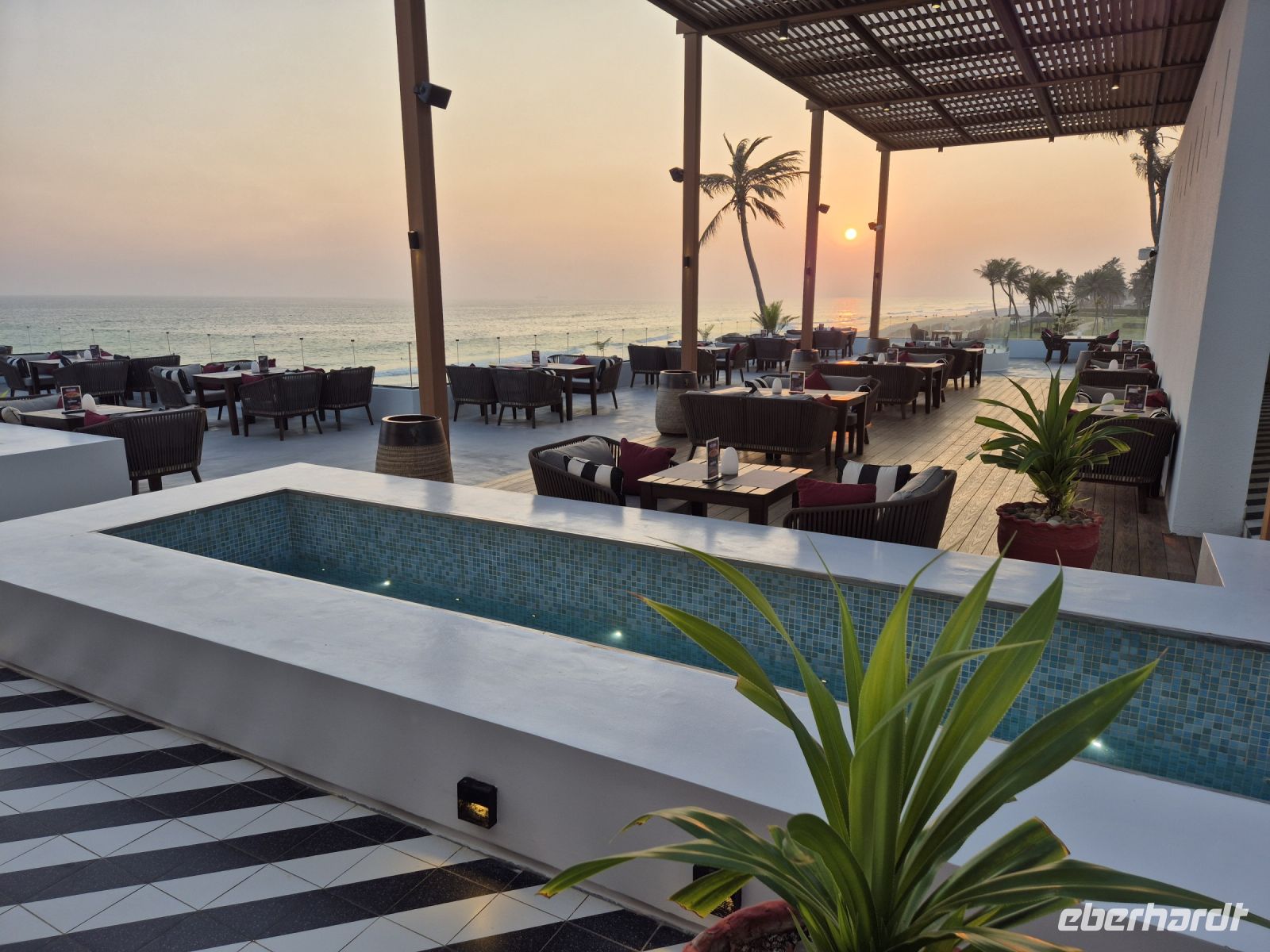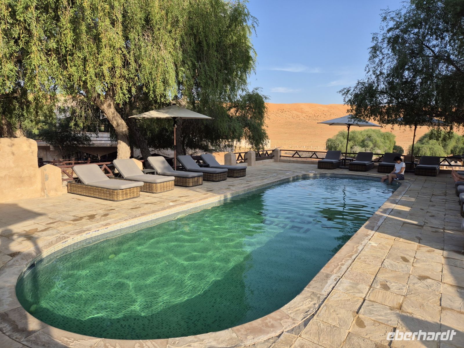 Angekommen im Golden Tulip Hotel Nizwa müssen wir uns aus persönlichen Gründen leider von unserem omanischen Begleiter Muhammad verabschieden. Vielen Dank für alles! Unser Abendessen haben wir bei tropischen Temperaturen am Hotelpool. Es gibt ein leckeres Buffet und für Durstige auch Bier.
