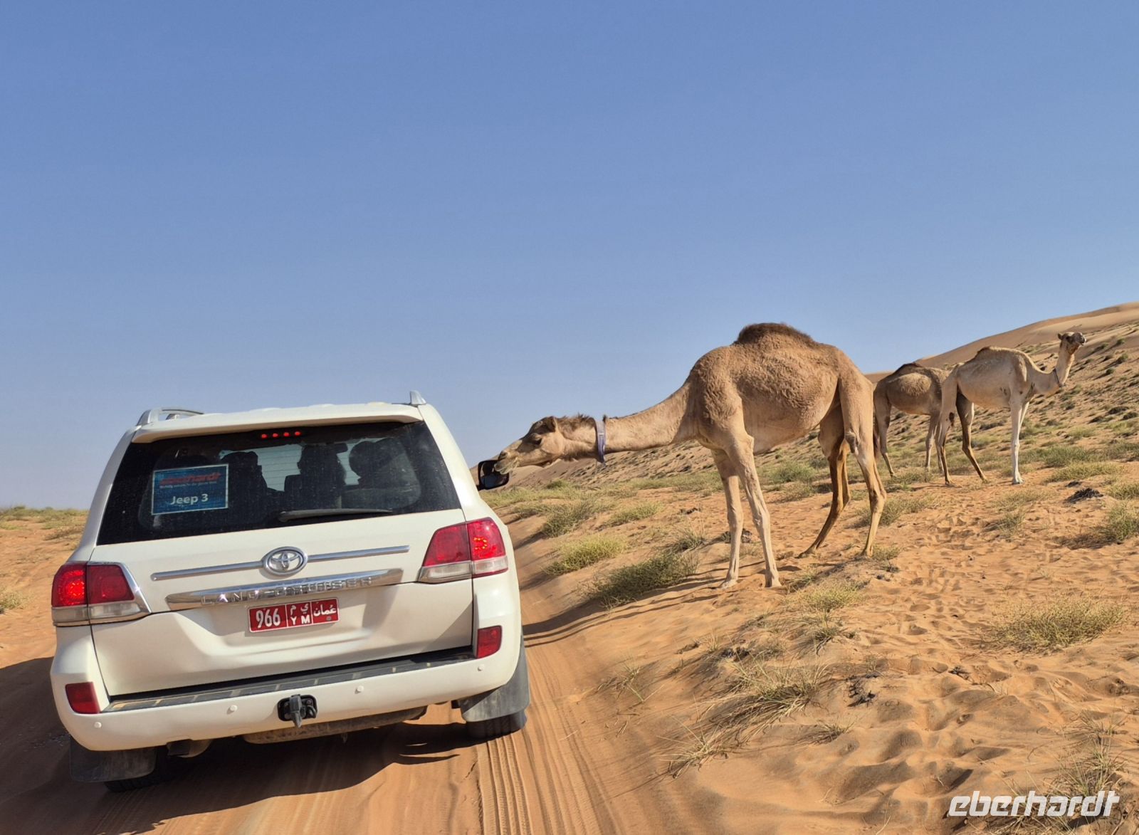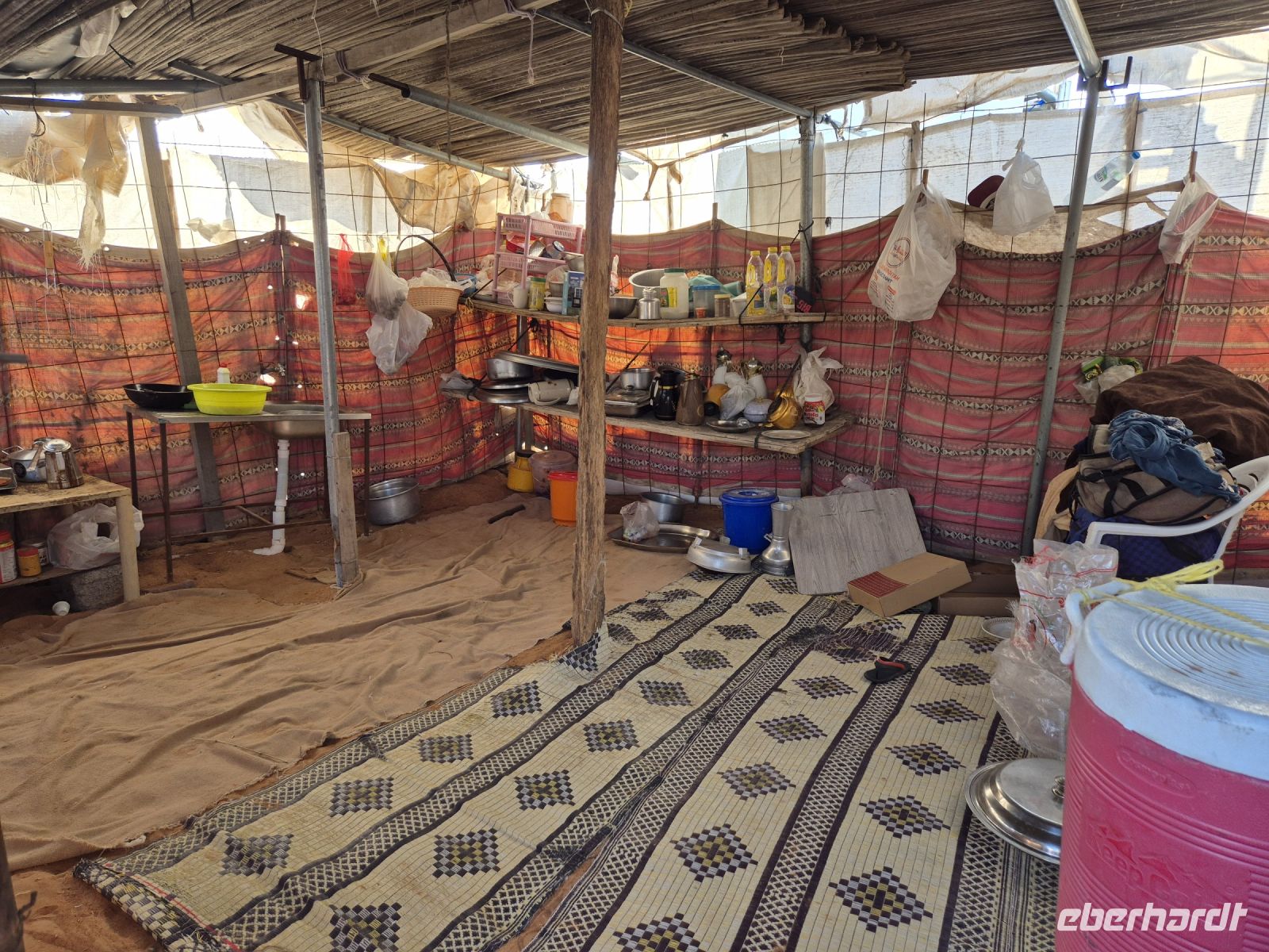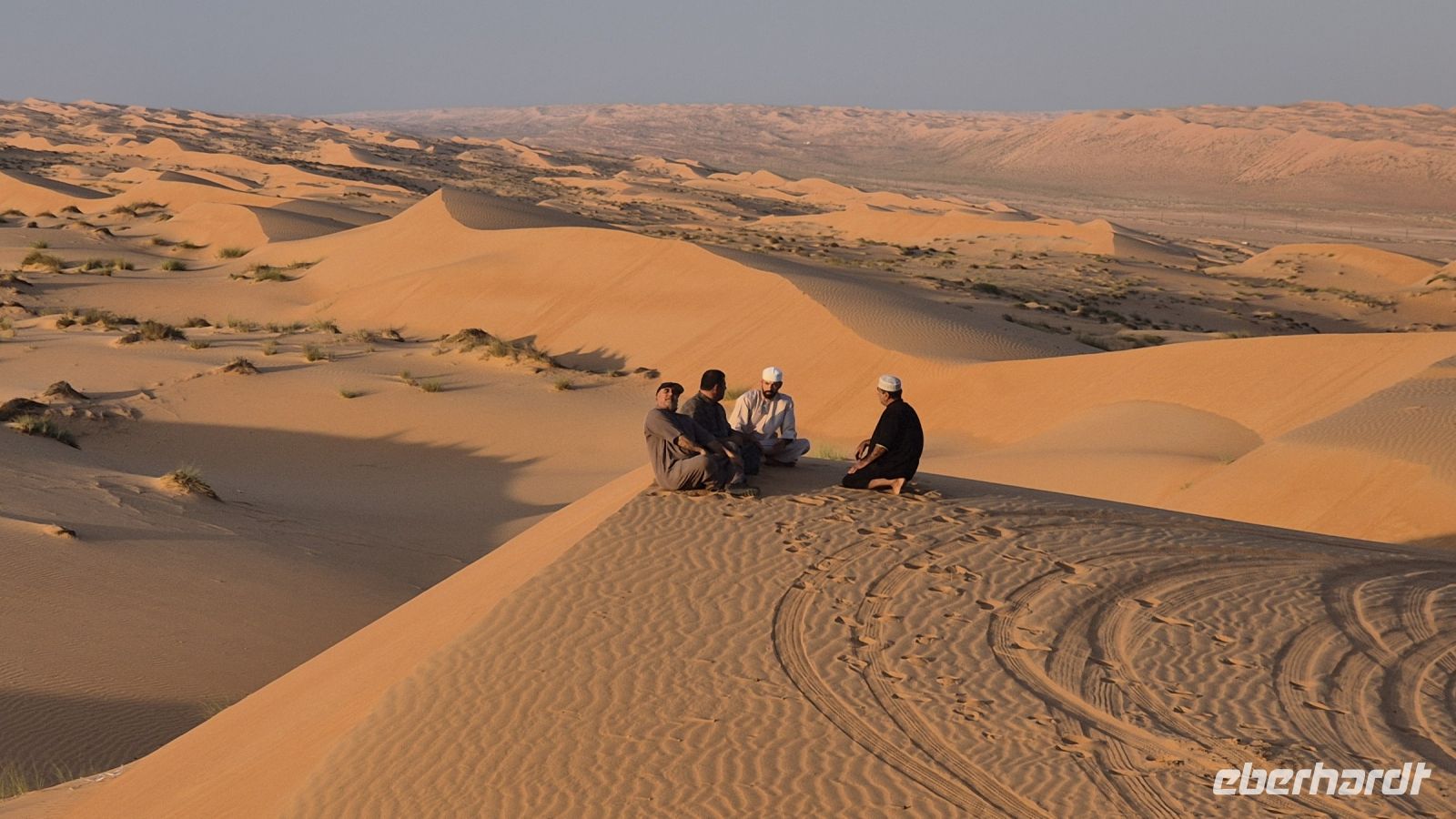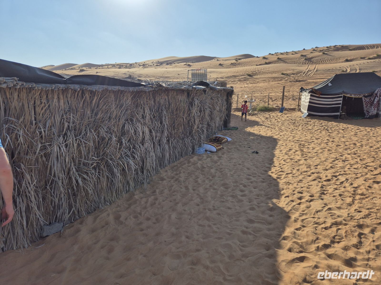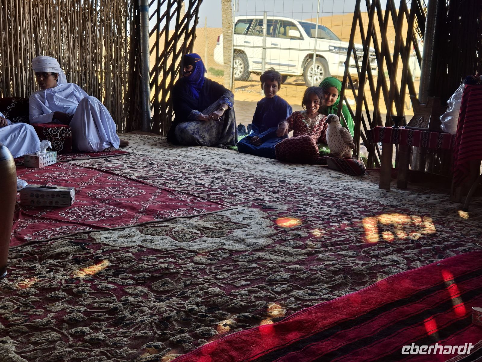 Auf dem Weg zurück zum Wüstencamp ist Gelegenheit für etwas Dunebushing. Auch den Fahrern macht es Spaß, die ausgefahrenen Wege zu verlassen und die Dünen hoch und runter zu fahren. Dann legen wir noch eine Pause in einem sogenannten „Beduinhouse“ ein. Im Beduinenzelt werden wir mit omanischen Kaffee und Datteln bewirtet. Anwesend ist die Frau mit ihren vier Kindern. Wir dürfen auch einen Blick in die anderen Zelte mit Küche bzw. Schlafplatz werfen.