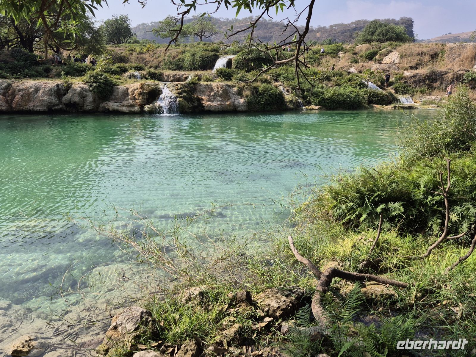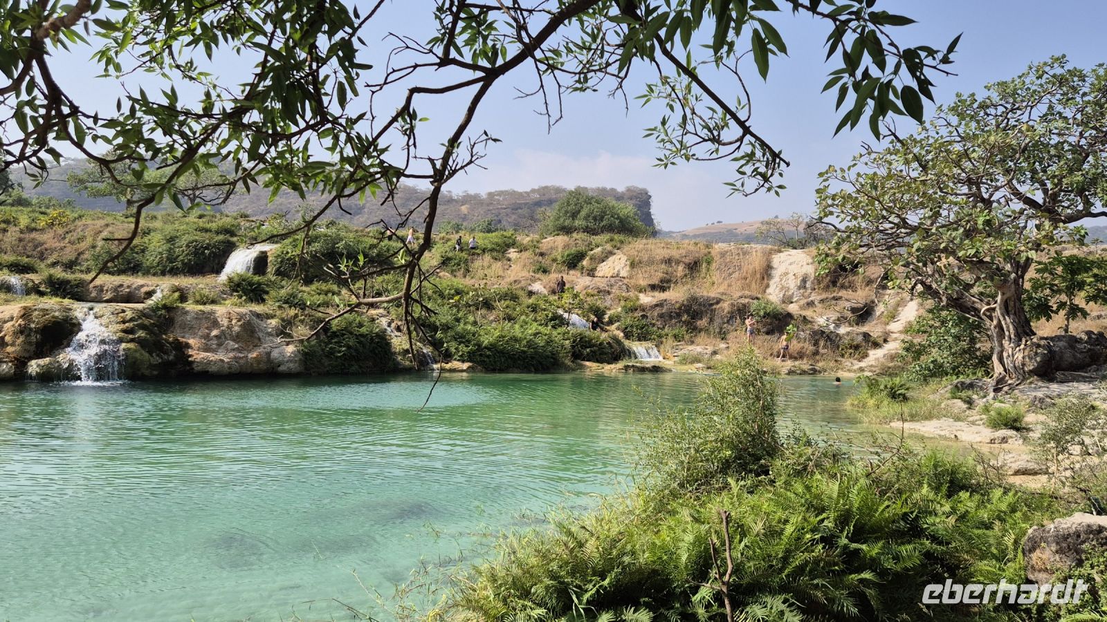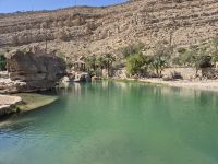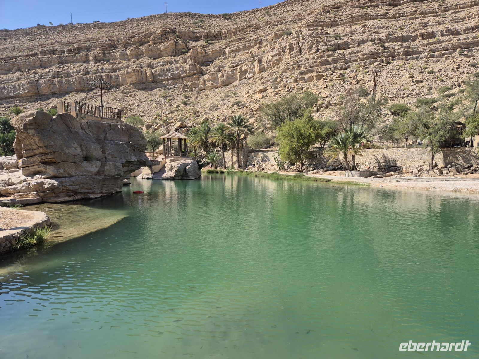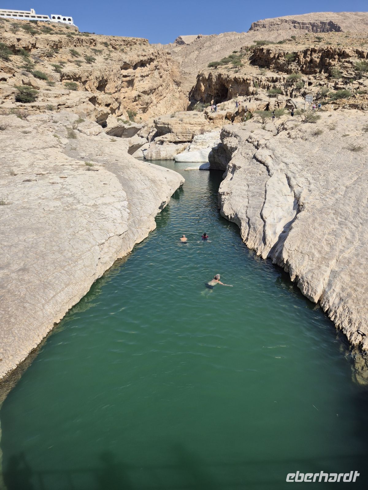 Vor uns liegt ein entspannter Tag. Bis zur Abfahrt um 9.00 Uhr bleibt Zeit für ein ausgiebiges Frühstück und vielleicht auch für die Erkundung des Camps. Mein Freund und Fahrer Ahmad kennt sich in der Wahiba Sands hervorragend aus. Ihm verdanken wir eine schöne Alternativroute durch eine eindrucksvolle Dünenlandschaft bis wir wieder Biddiya erreichen. Nach einem Werkstattstopp zum Erhöhen des Reifendrucks sowie einen Tankstopp (der Liter Benzin 0,57 EUR bzw. mit Tankkarte 0,45 EUR) peilen wir die nah gelegenen Berge an. Wir fahren zum Wadi Bani Khalid, welches sich in einer tief eingeschnittenen Schlucht des Felsengebirges befindet. Die türkisblau schimmernden Wasserpools laden zum Schwimmen und Verweilen ein. Einige halten auch einfach nur ihre Füße in das angenehm warme Wasser und genießen eine Gratisfußpflege von den Putzerfischen. Beim Verlassen des Wadis in der Mittagszeit biegen wir zu einem Aussichtspunkt hoch oberhalb des Wadis ab. Die Aussicht von hier ins Wadi ist wirklich überwältigend.