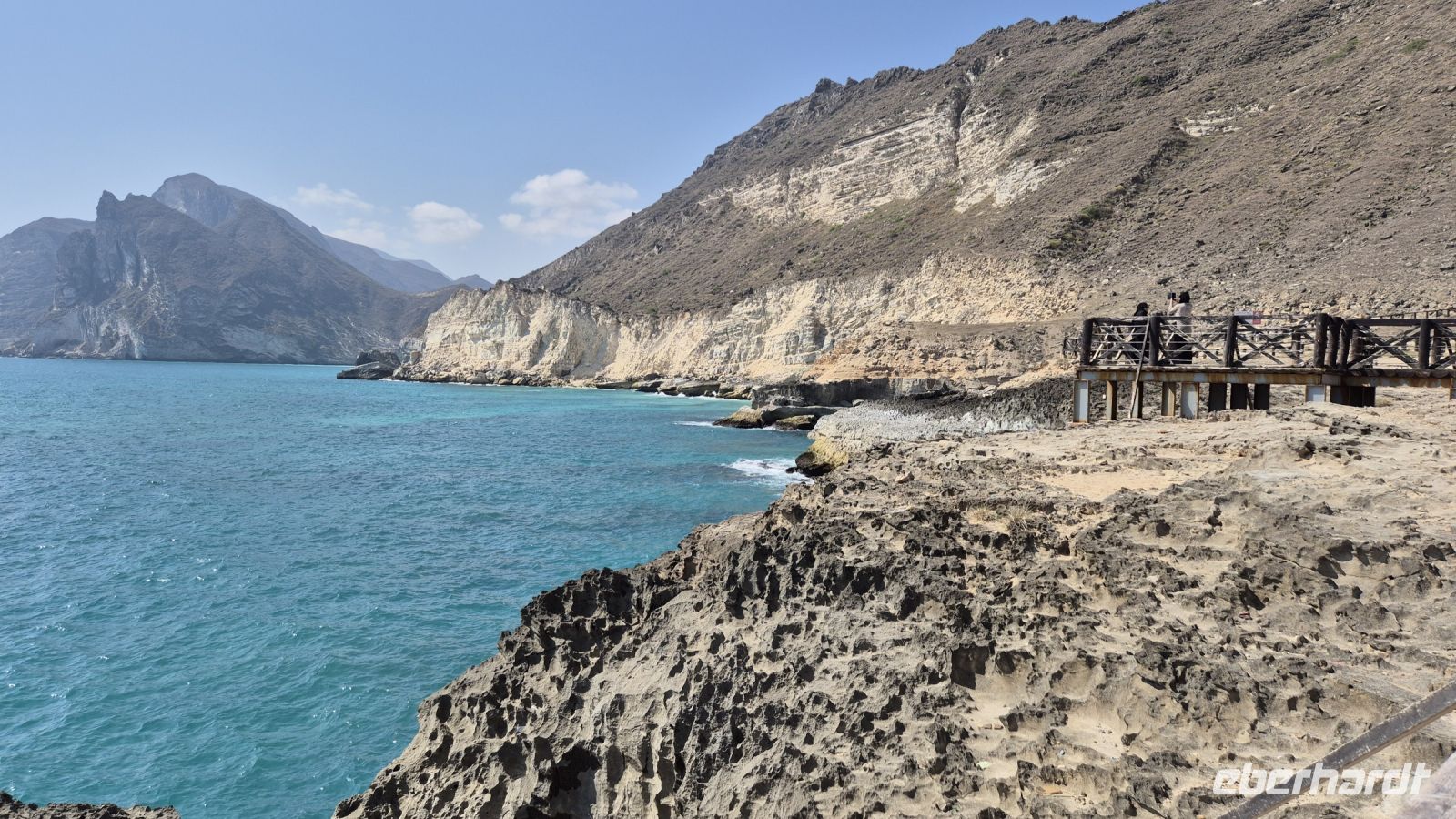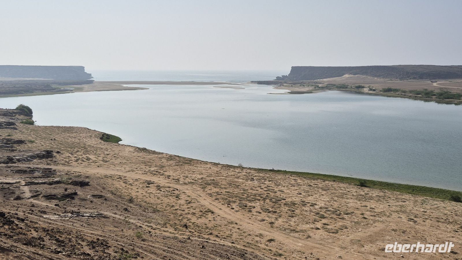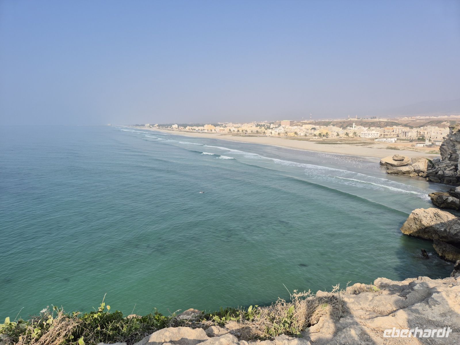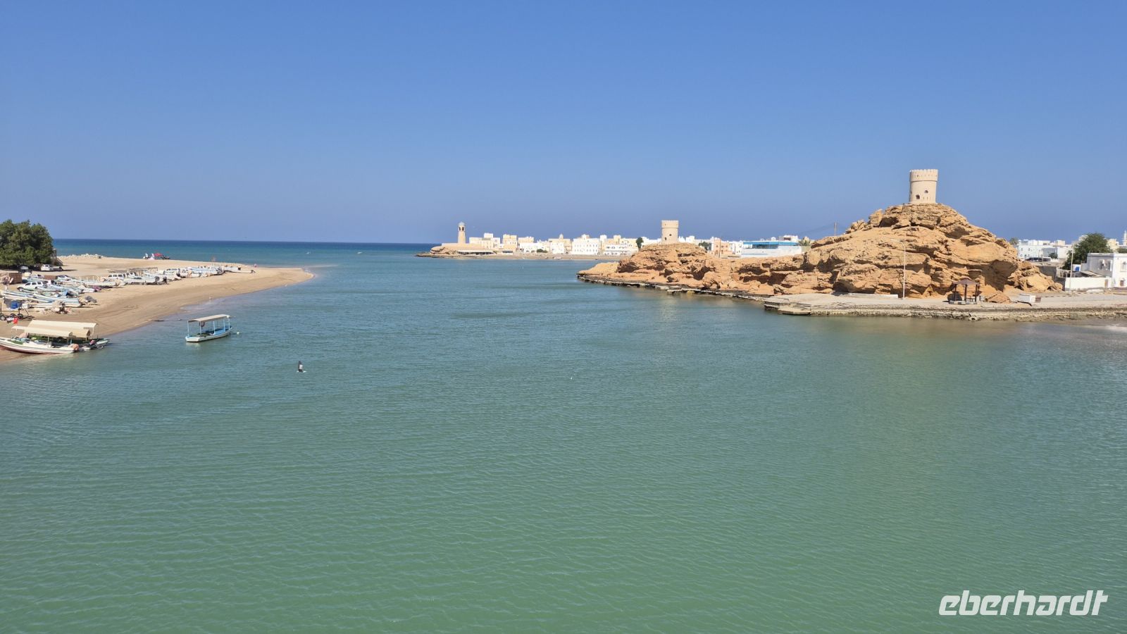 Unser erster Halt ist auf einem Plateau oberhalb des Küstenortes Taqa. Wir haben einen guten Zeitpunkt erwischt, denn wir können Delfine beobachten. Der Ort selbst ist dadurch bekannt, dass hier Sultan Qaboos geboren wurde, seine Mutter hier begraben ist und sein Onkel hier in einem prächtigen Anwesen lebt.