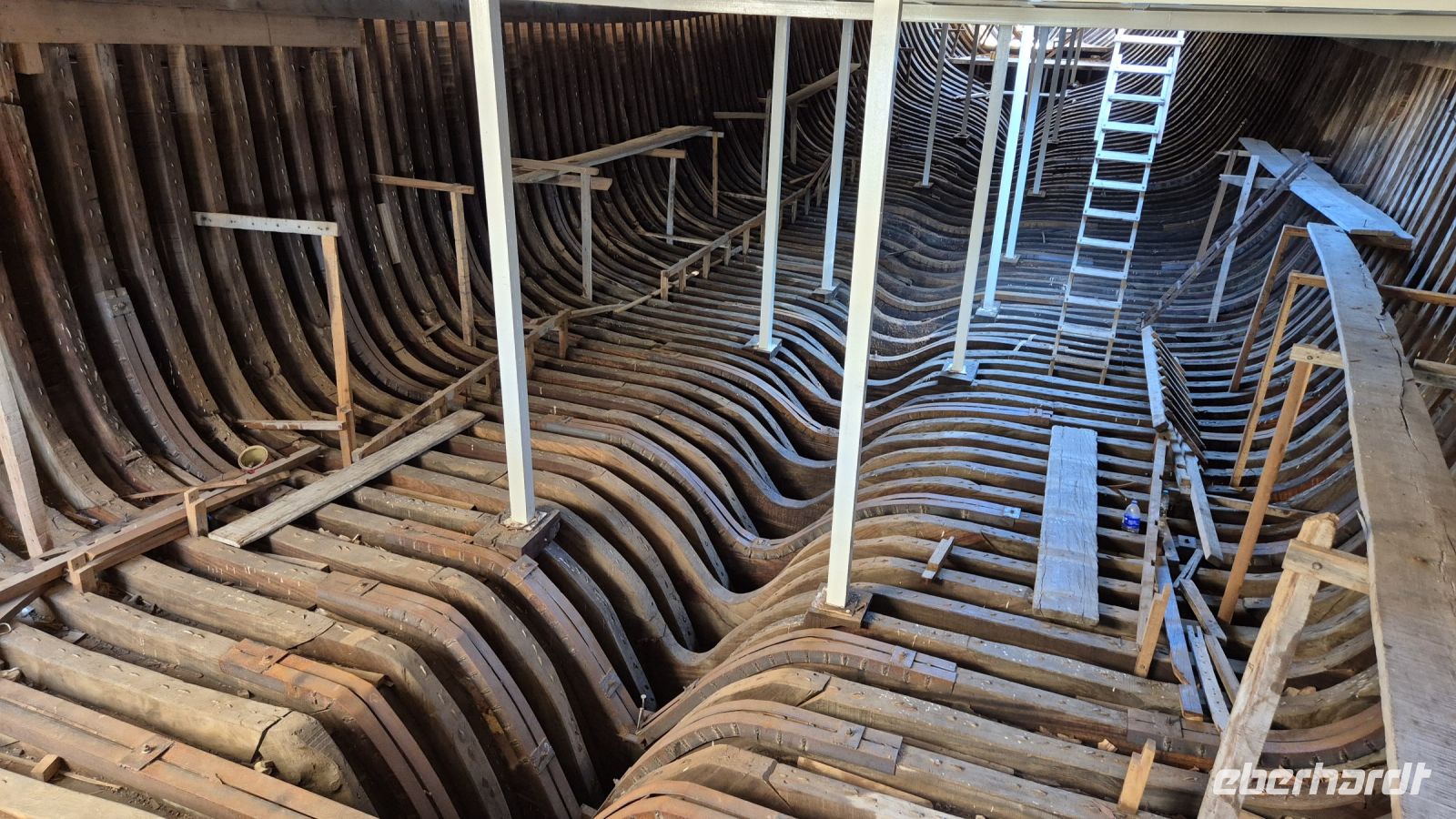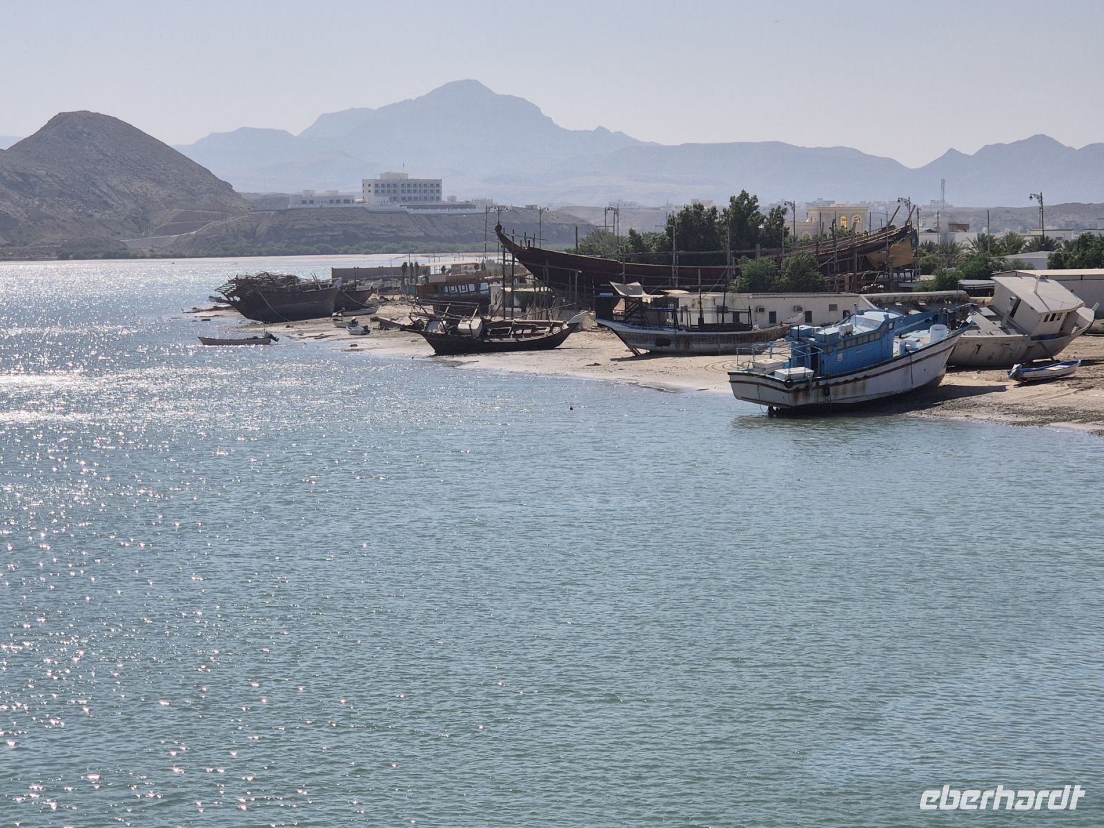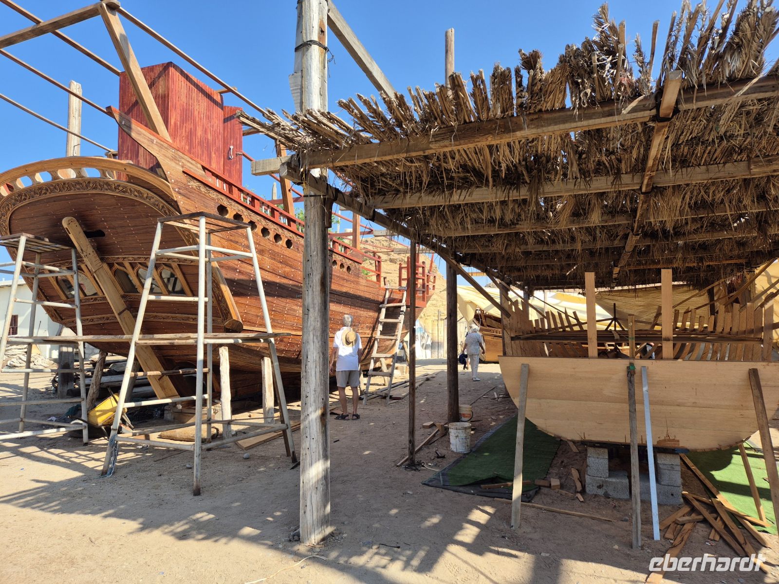 Nachdem der normal Reifendruck bei unseren SUVs wieder hergestellt ist, fahren wir in die Hafenstadt Sur am Indischen Ozean. In einem Supermarkt kaufen wir unser Picknick. Anschließend umfahren wir die riesige Lagune, um an der schmalsten Stelle über die Brücke nach Sur zu kommen. Am Ufer der Lagune, unterhalb der Brücke, rasten wir für unser Picknick. Gleich in der Nähe befindet sich die für Sur so bekannte Dhau Werft. Momentan wird eine ca. 50 Meter lange Dhau gebaut – eine Größe, wie man sie schon seit Jahrzehnten hier nicht mehr gesehen hat. Es ist ein traditionelles Handwerk, welches nur noch an ganz wenigen Orten im Mittleren Osten ausgeübt wird. Ein kleines Museum in der Werft gibt einen Einblick in die lange Seefahrtgeschichte des Oman.
