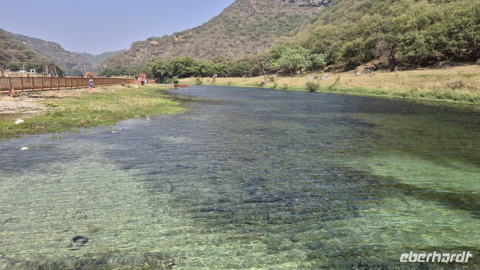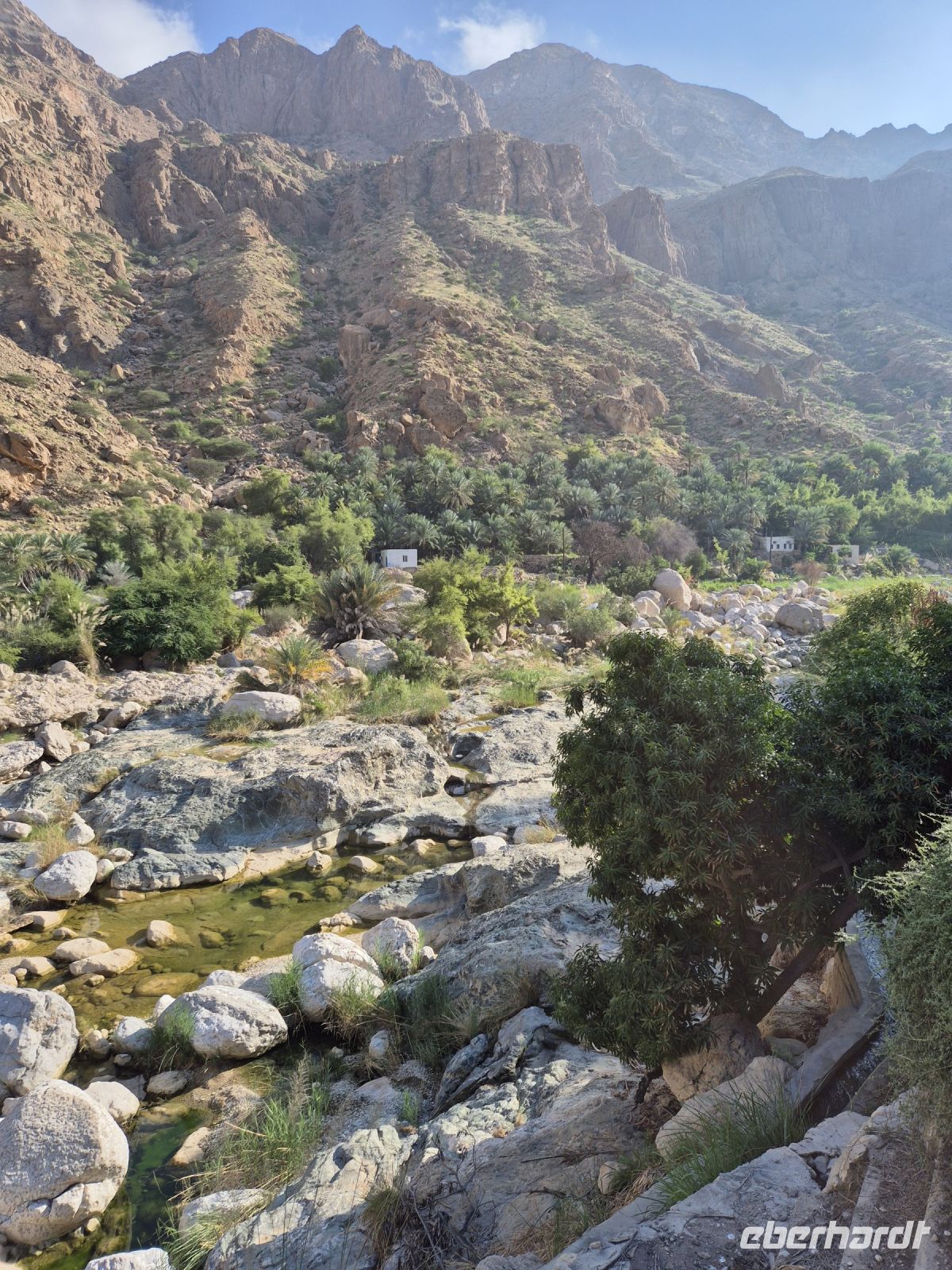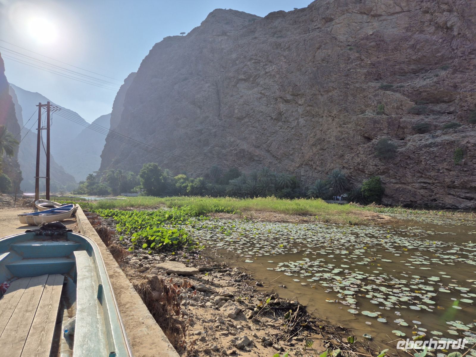 Entlang von grünen Hängen fließt ein Fluss durch das Tal. Für die Omanis und Besucher aus den Golfstaaten ist es ein Paradies, hier macht man Picknick, fährt mit den Kindern Tretboot oder schießt Selfies mit den Wasserkaskaden.