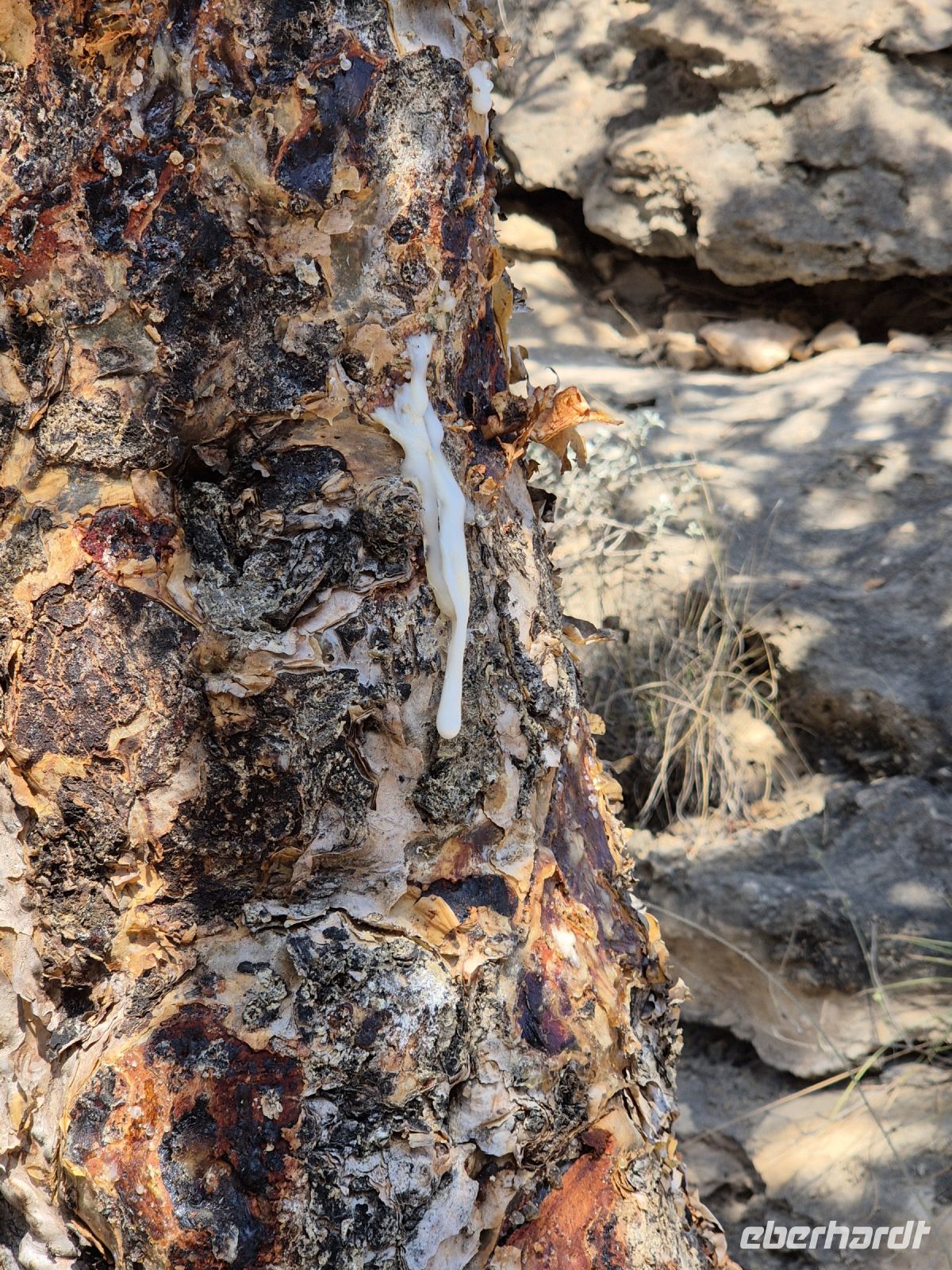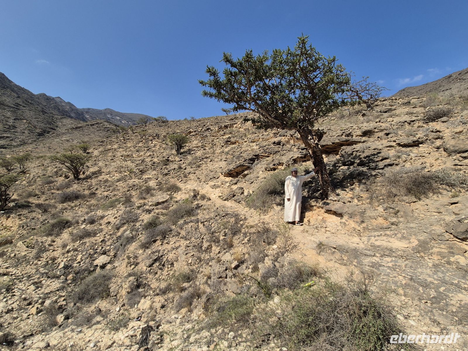 Anschließend unternehmen wir einen Abstecher ins bergige Hinterland, ums uns Weihrauchbäume anzusehen. Aus Sicht der alten Römer befinden wir uns im sagenumwobenen Arabia Felix, wo der kostbare Weihrauch wächst. In der Antike wurden die Weihrauchpreise mit abenteuerlichen Geschichten (heute würde man „fake news“ sagen) so hoch gehalten, dass dieses Luxusgut, nichts weiter als ein Baumharz, angeblich mit Gold aufgewogen wurde. Eines dieser „Märchen“ lautete, dass die Weihrauchbäume von geflügelten Schlangen mit giftigem Atem bewacht wurden…