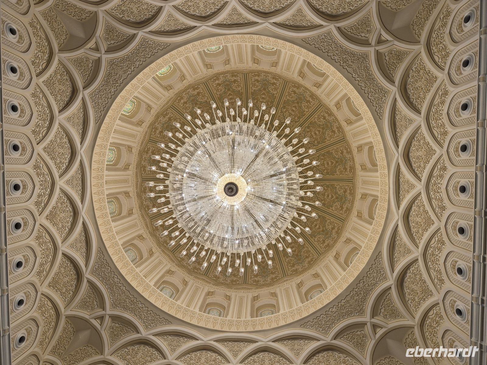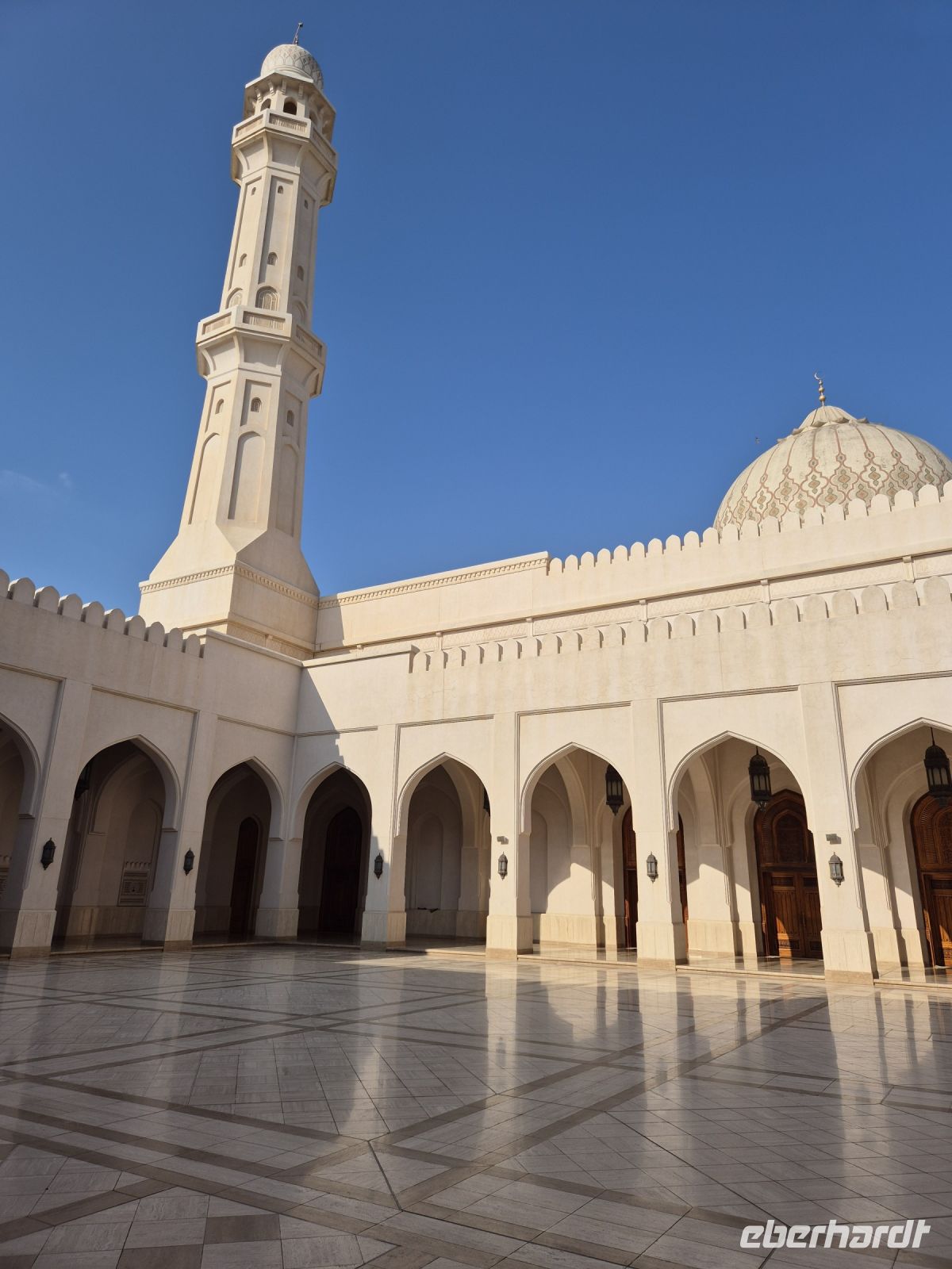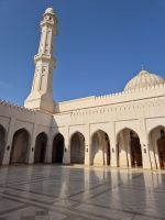 Nach einem sehr guten Frühstück im Strandrestaurant beginnen wir unsere Salalah-Tour mit der hiesigen Sultan Qaboos Moschee. Nachdem Muscat eine prächtige Moschee erhalten hatte, sollte auch Salalah mit einer würdigen Moschee bedacht werden. Sie wurde 2009 eröffnet, bietet ca. 4.750 Muslimen Platz und ist ebenfalls mit einem Hand geknüpften persischen Teppich und einem Swarovski-Leuchter ausgestattet.