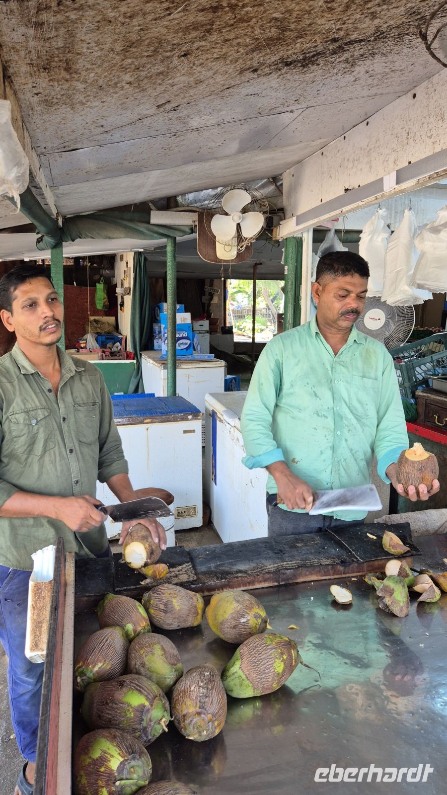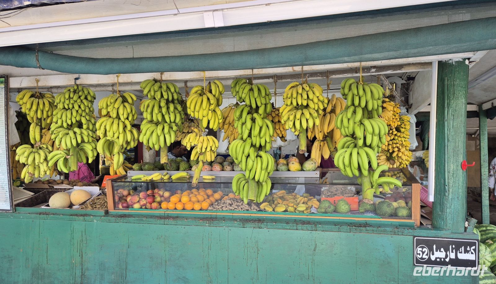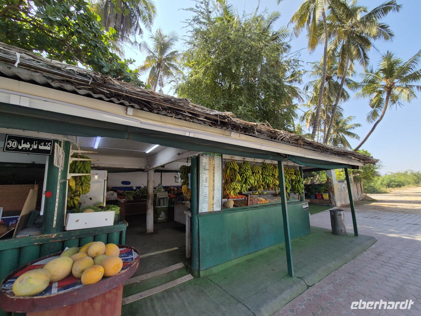 Nachdem wir schon mehrfach die vielen Obststände am Straßenrand gesehen haben, wird es nun Zeit, sich einen Stand mal näher anzusehen. Hier gibt es auch für uns weniger bekannte Lebensmittel wie die Yamswurzel, Maniok, Bananenblüten oder Bittergurken (Goya-Gurke). Wir probieren aber lieber Kokosnüsse, inklusive Testverkostung des Fruchtfleisches sowie die kleinen süßen Salalah-Bananen.
