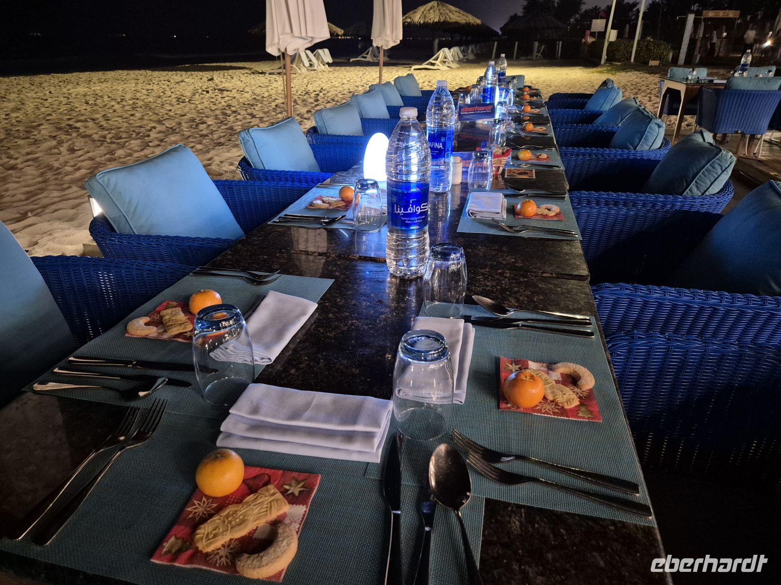 Zum Abendessen sitzen wir draußen direkt am Strand mit Meeresrauschen, in einer tropischen Nacht, mit einem kühlen Getränk und einem überaus schmackhaften Buffet.