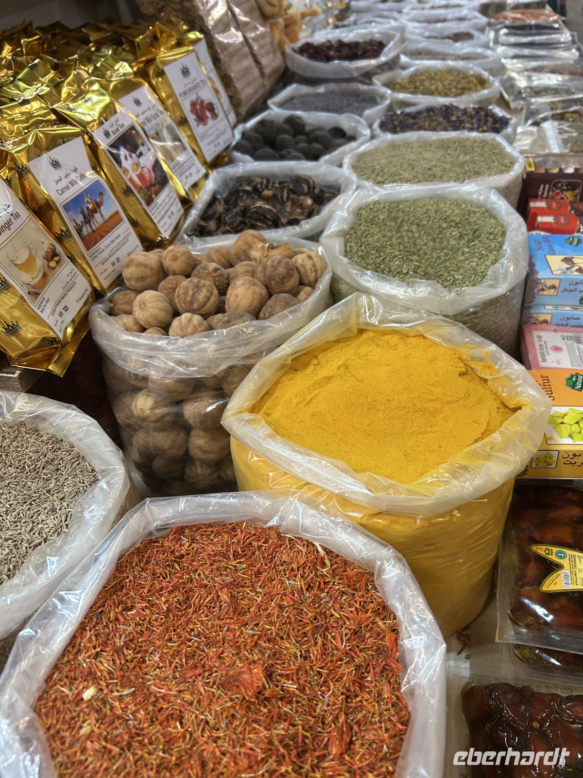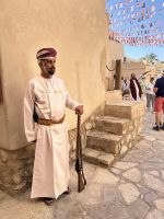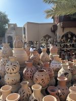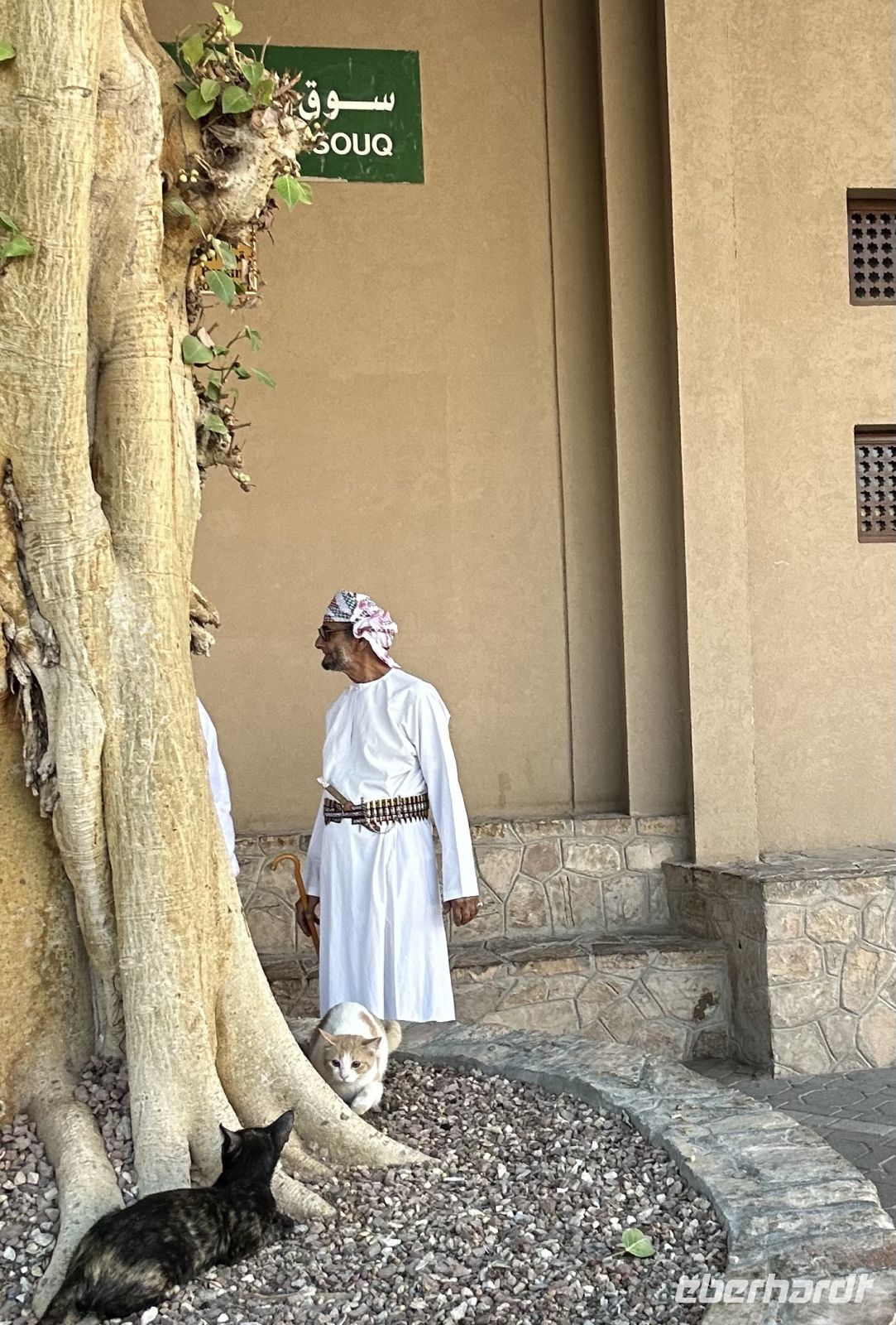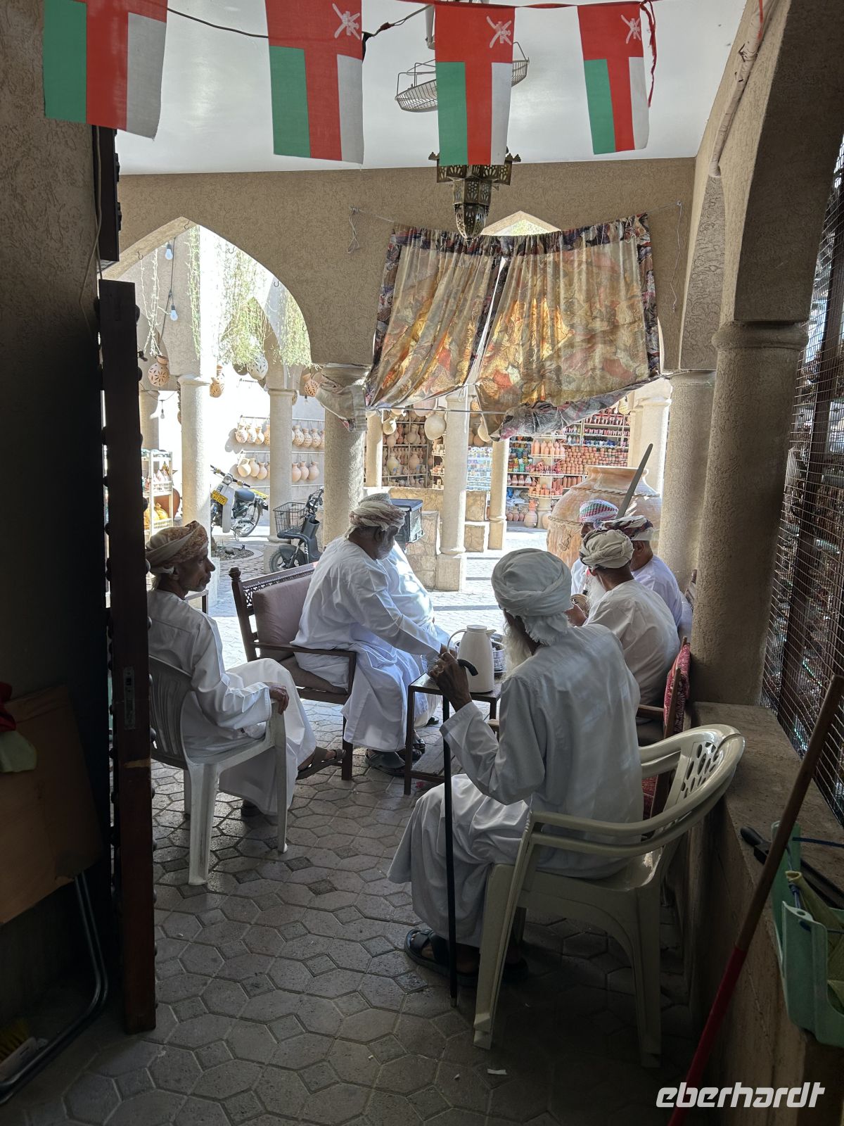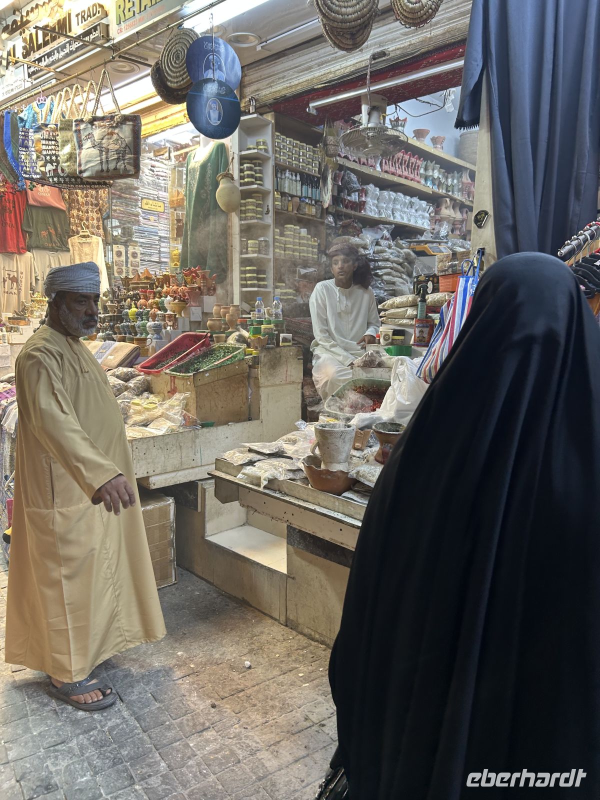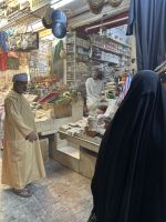 Dort erwartet uns der weitläufige Souk, ein Marktlabyrinth, das in seiner Vielfalt kaum zu übertreffen ist. Wir starten mit einer gemeinsamen Runde, um einen Überblick zu gewinnen: das Areal des Viehmarktes, der freitags zum echten Spektakel wird, der Dattelmarkt mit unzähligen Sorten, die Fischhalle, der Halwa-Markt, die farbenfrohen Obststände, der Waffen- und Khanjar-Markt, Gewürze, Töpferwaren, Schmuck, Kleidung – ein Kaleidoskop orientalischen Lebens.