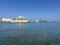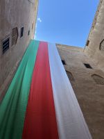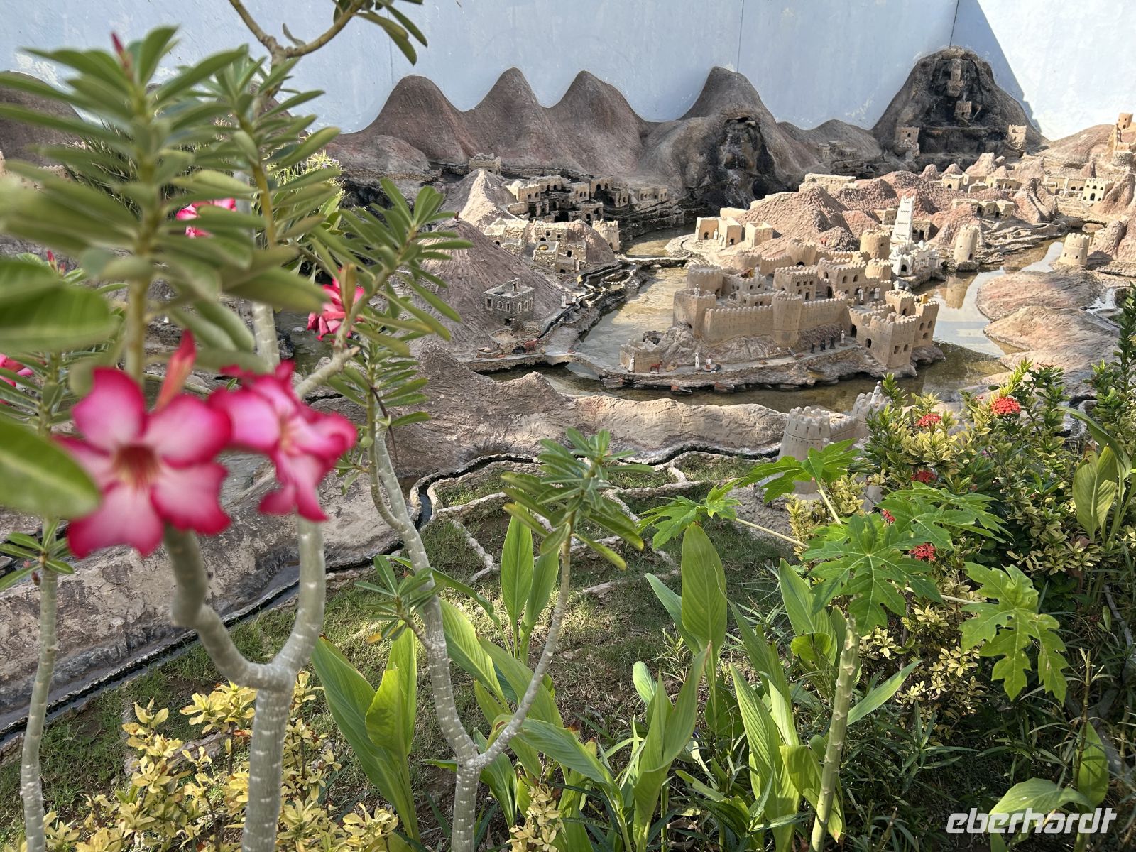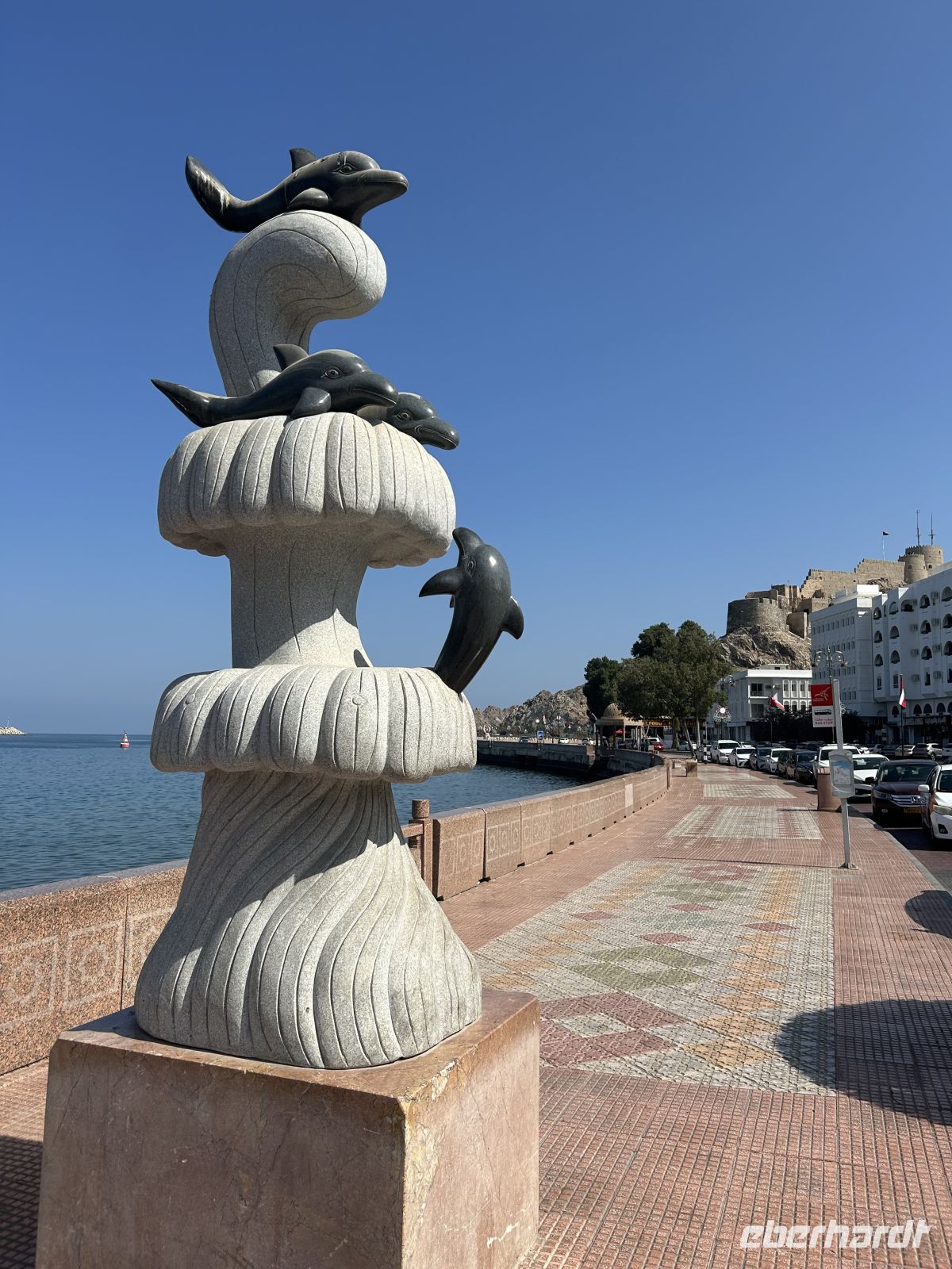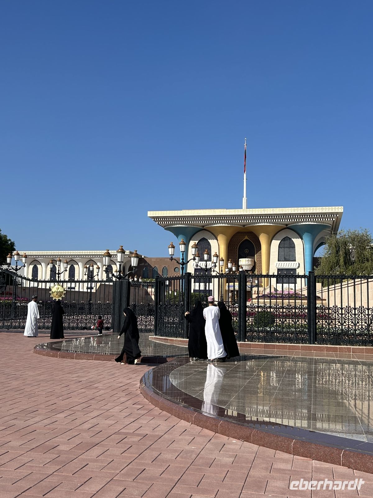 Ein Fotostopp führt uns zur Vorderseite des Al Alam Palastes, dem repräsentativen Palast des Sultans, eingerahmt von den imposanten portugiesischen Festungen Mirani und Jalali. Der geplante Überraschungsbesuch im Luxushotel Al Bustan Palace fällt leider buchstäblich ins Wasser, doch unser Fahrer dreht eine zusätzliche Runde, sodass wir die Hinterseite des Sultanspalastes noch zu Gesicht bekommen.