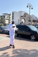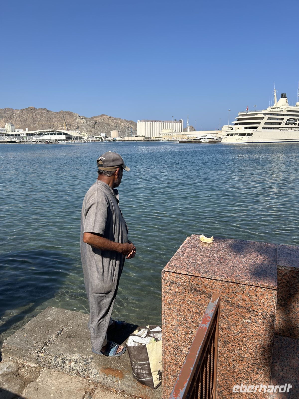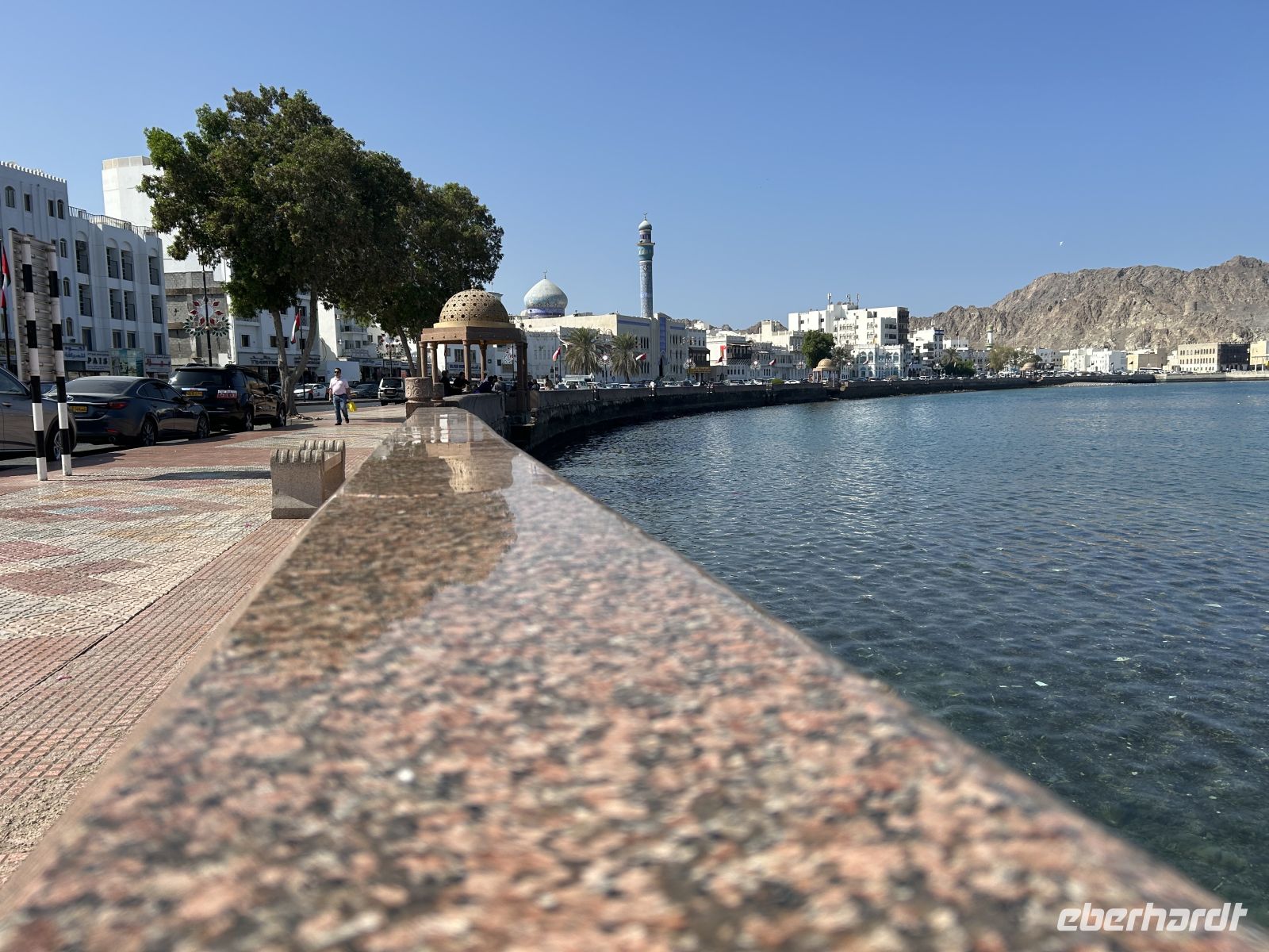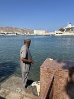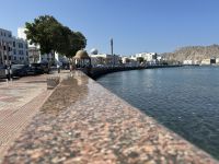 Weiter geht es nach Mutrah. Schon beim Aussteigen umfängt uns der Geruch von Weihrauch und Gewürzen – ein Hauch aus „Tausendundeiner Nacht“. Im Mutrah Souk schlendern wir durch enge Gassen, in denen Händler bunte Stoffe, Silberwaren, Räuchermischungen und Kunsthandwerk anbieten. Wir wechseln Geld, stöbern, lassen die Farben und Düfte auf uns wirken. Ein Blick über die Corniche mit ihren weißen Häusern und dem Hafen erzählt Geschichten alter Seefahrertraditionen.