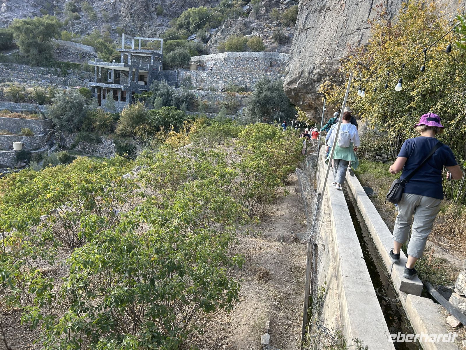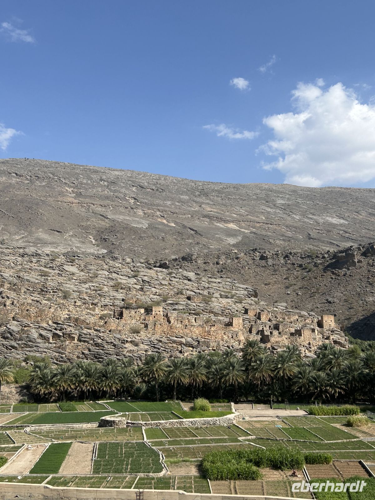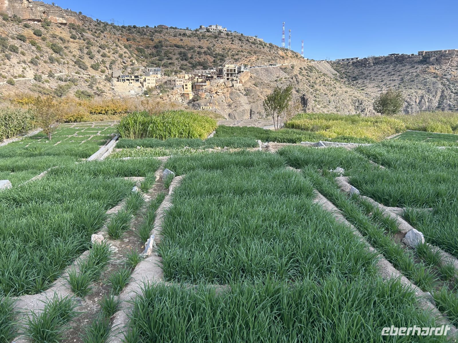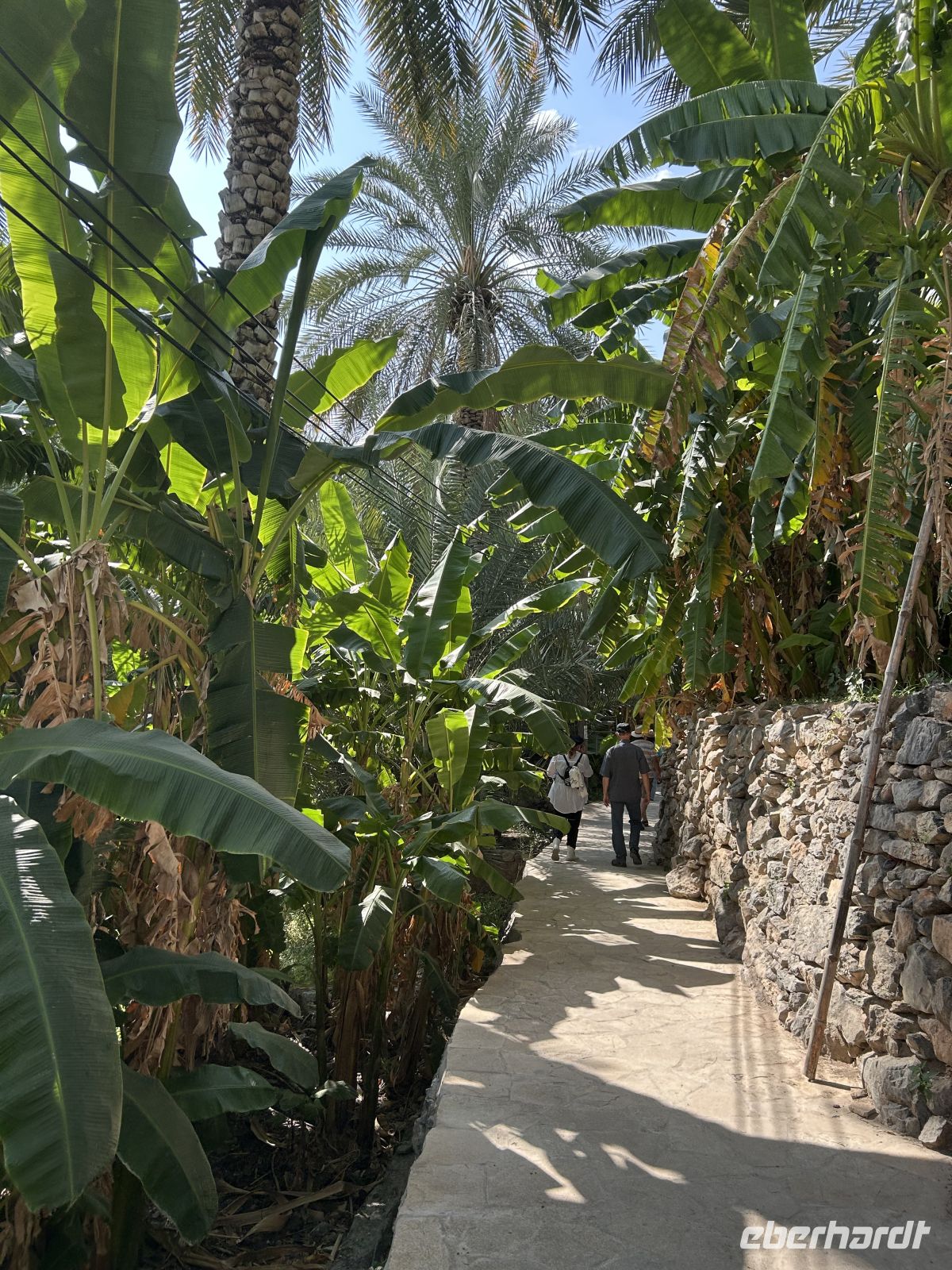 Anschließend bringt uns eine kurvige Strecke hinauf nach Misfat Al Abriyeen, einem der schönsten Bergdörfer des Landes. Zwischen Palmen, Bananenstauden und den kunstvoll angelegten Falaj-Bewässerungskanälen spazieren wir durch eine Oase, die bis heute nach alten Traditionen gepflegt wird.