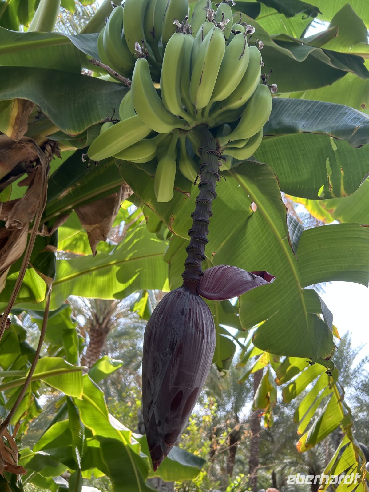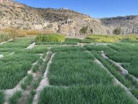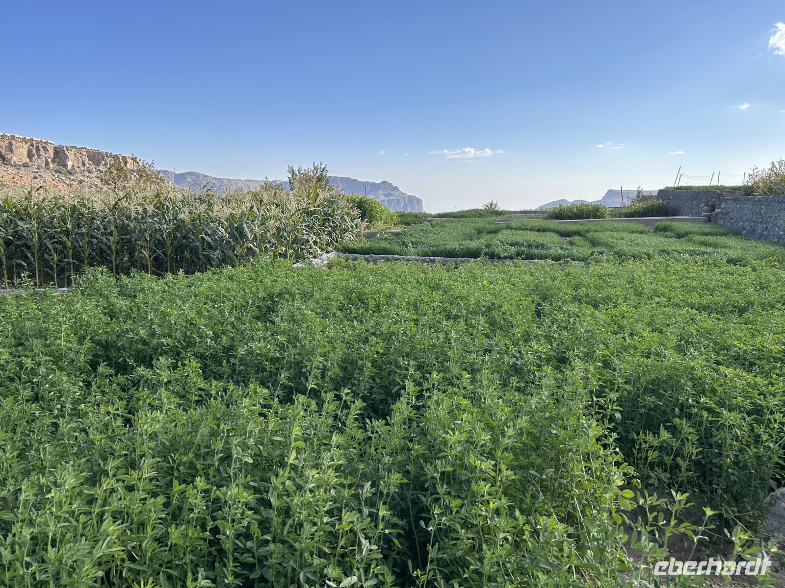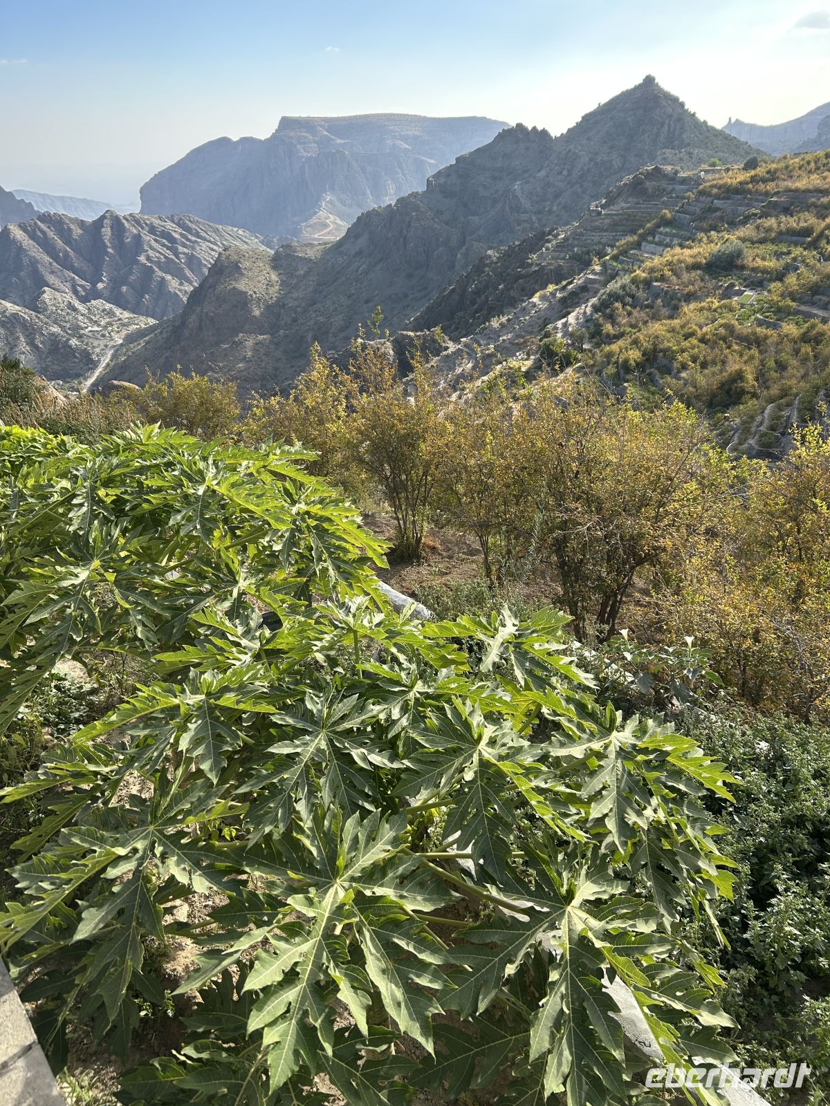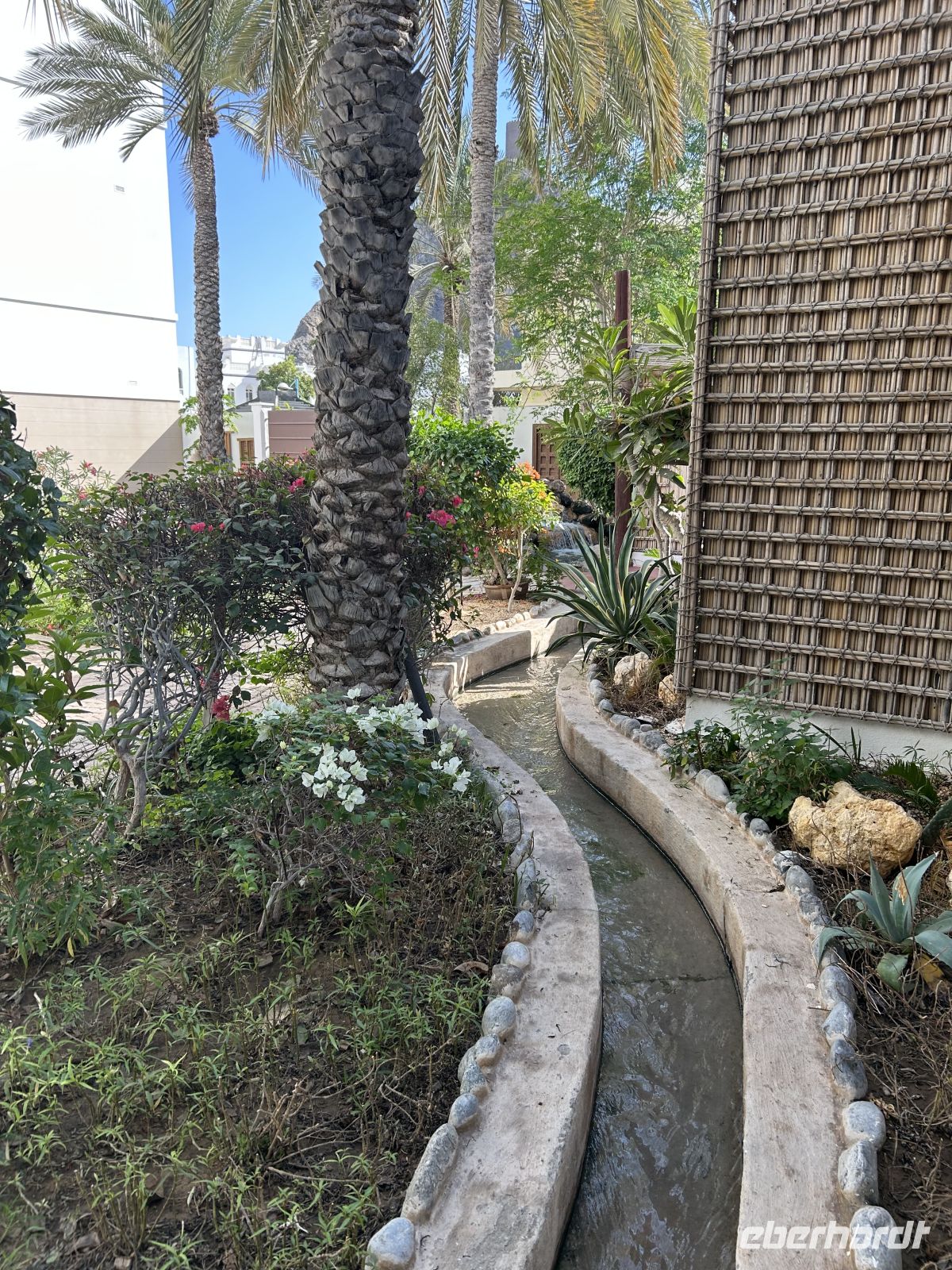 Anschließend bringt uns eine kurvige Strecke hinauf nach Misfat Al Abriyeen, einem der schönsten Bergdörfer des Landes. Zwischen Palmen, Bananenstauden und den kunstvoll angelegten Falaj-Bewässerungskanälen spazieren wir durch eine Oase, die bis heute nach alten Traditionen gepflegt wird.