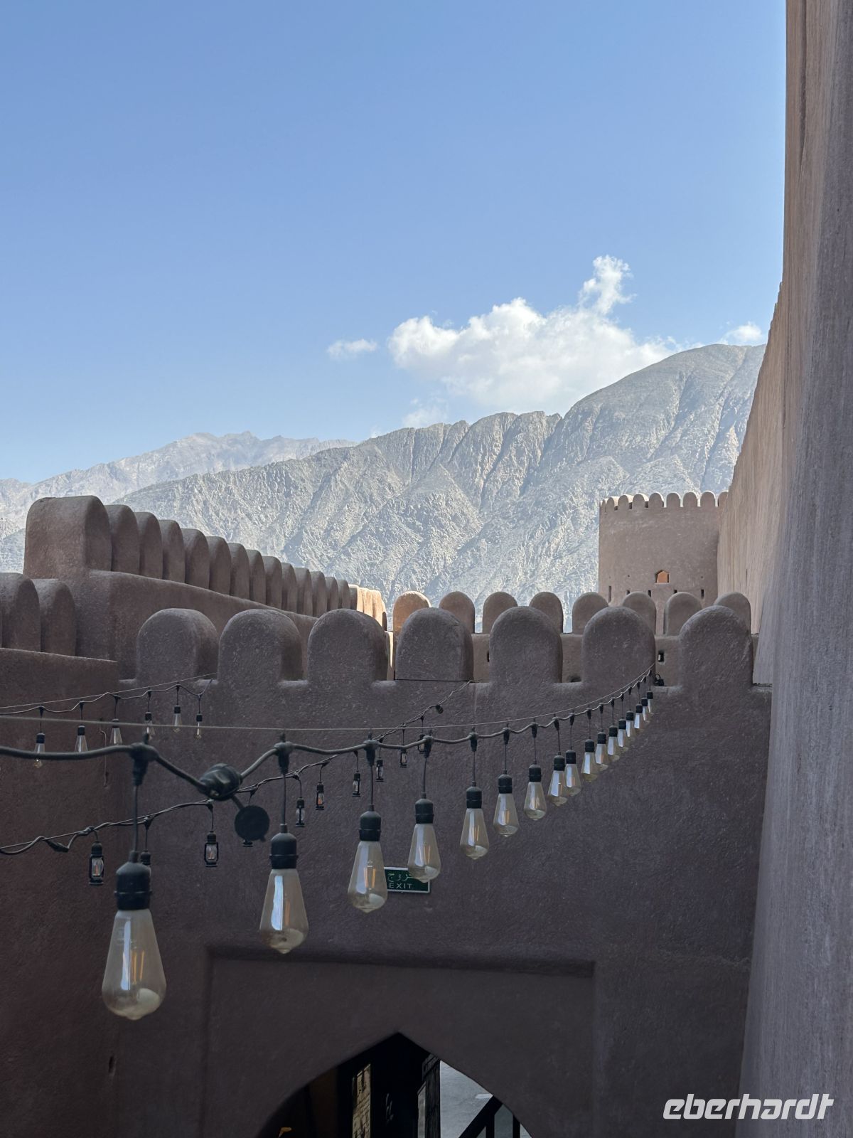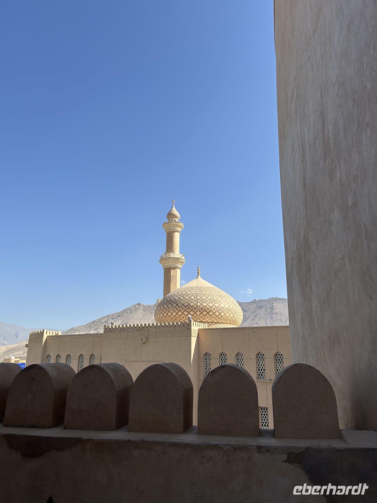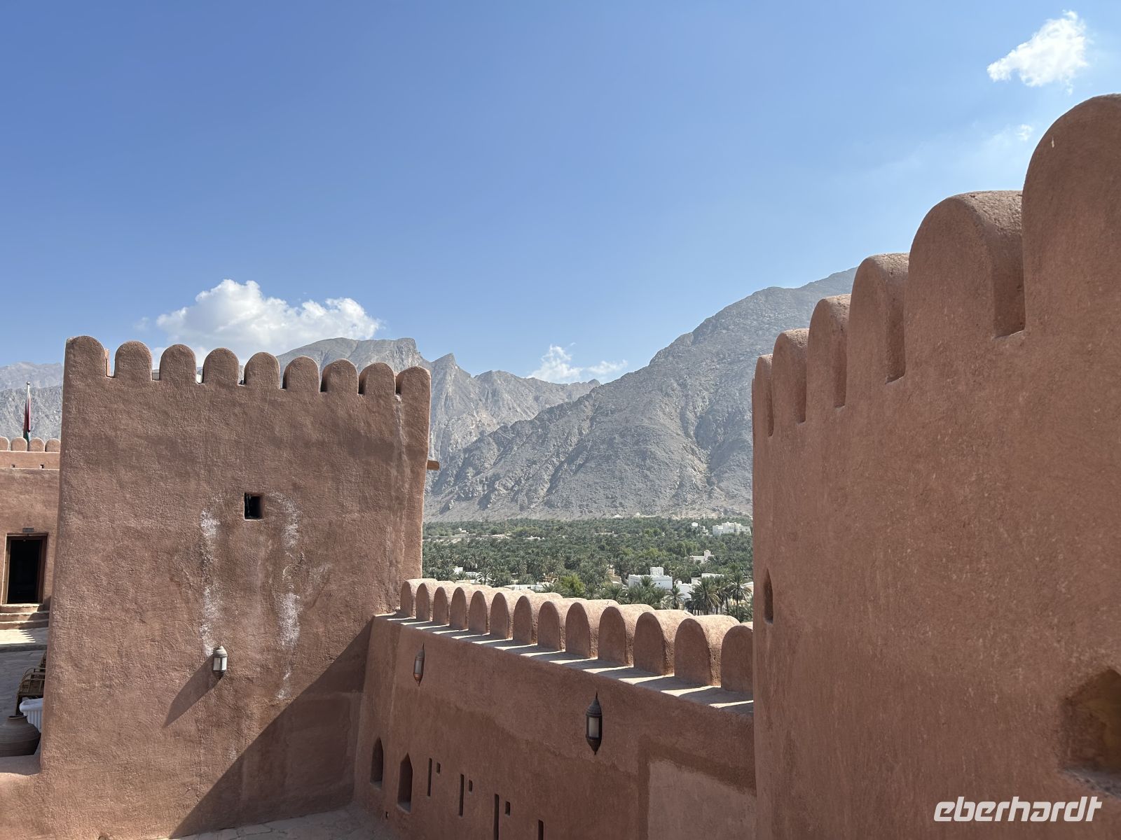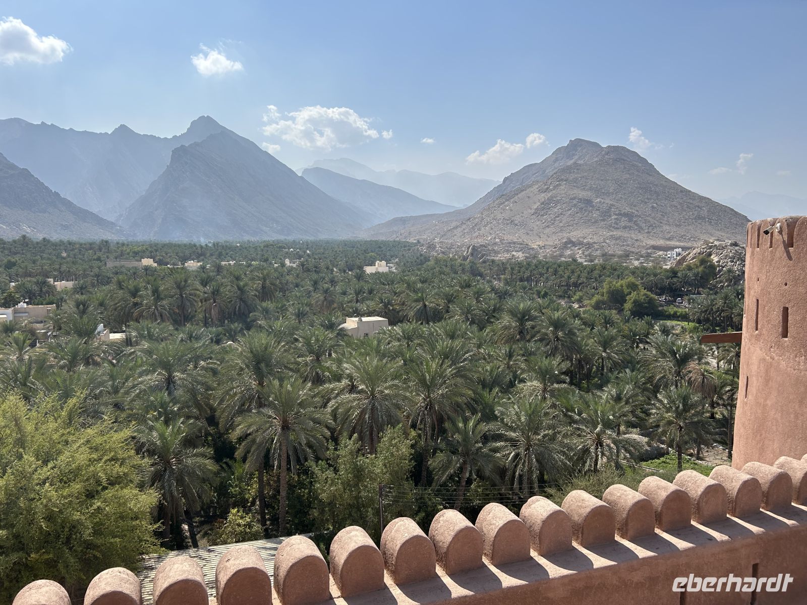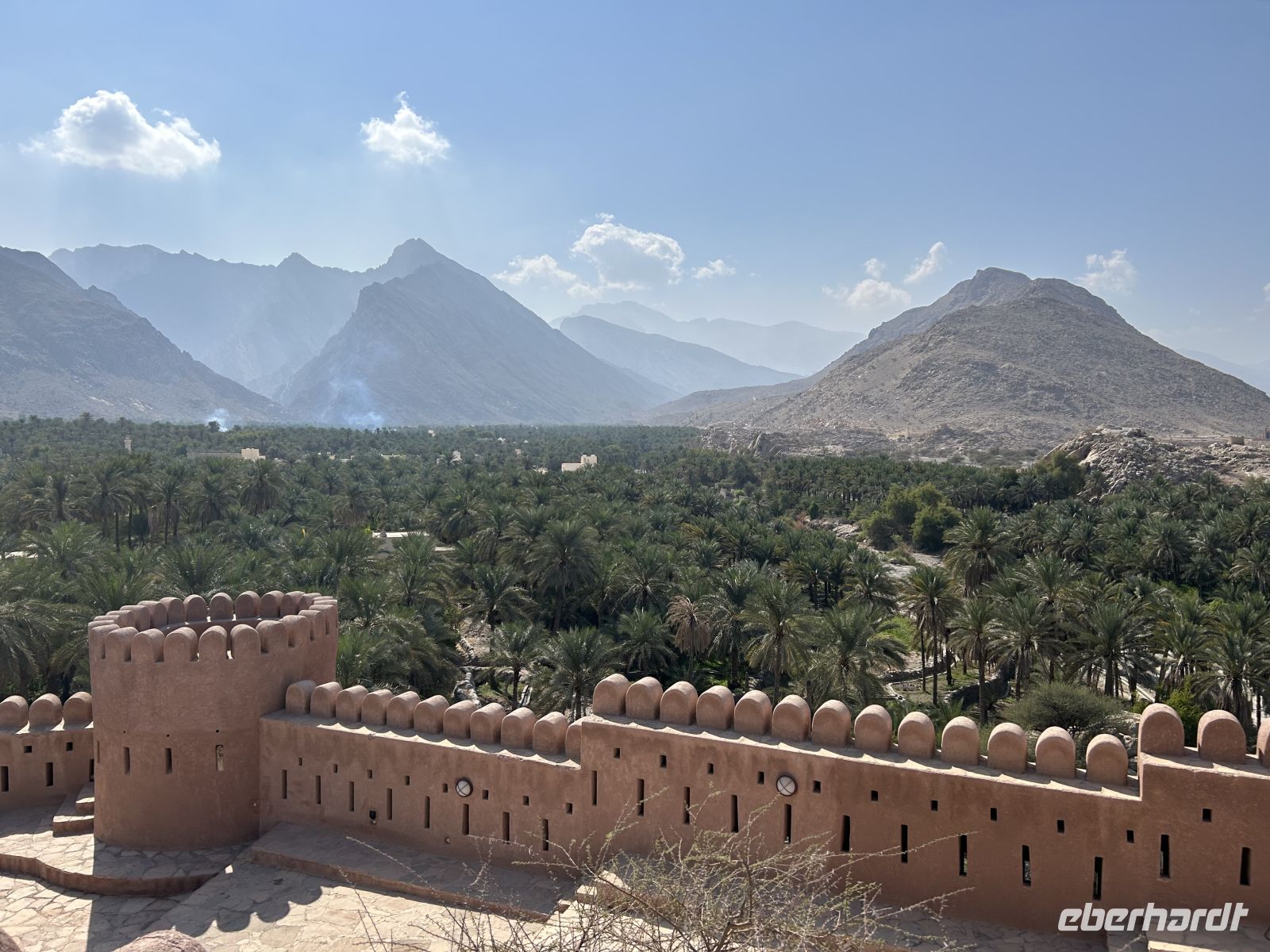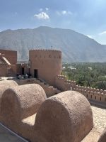 Danach führt uns die Route nach Nakhl, wo das mächtige Fort auf einem Felsen thront. Von den Zinnen aus öffnet sich ein traumhafter Blick über Palmenhaine, Berge und das weitläufige Tal – ein Panorama, das die Kamera kaum einfangen kann.