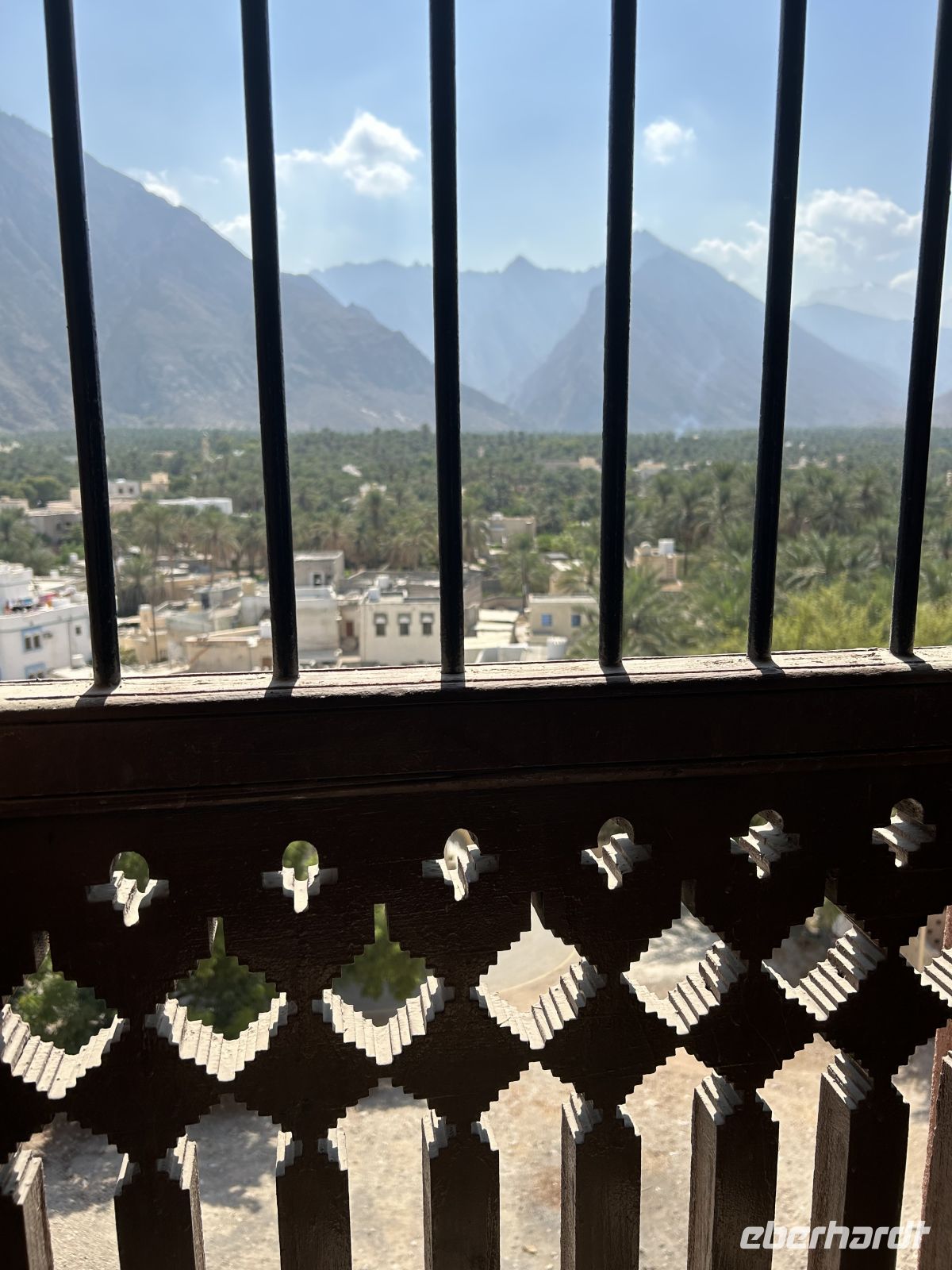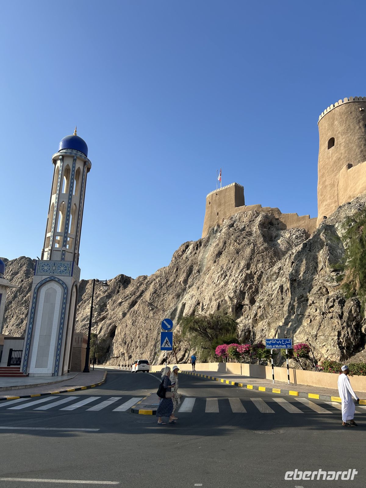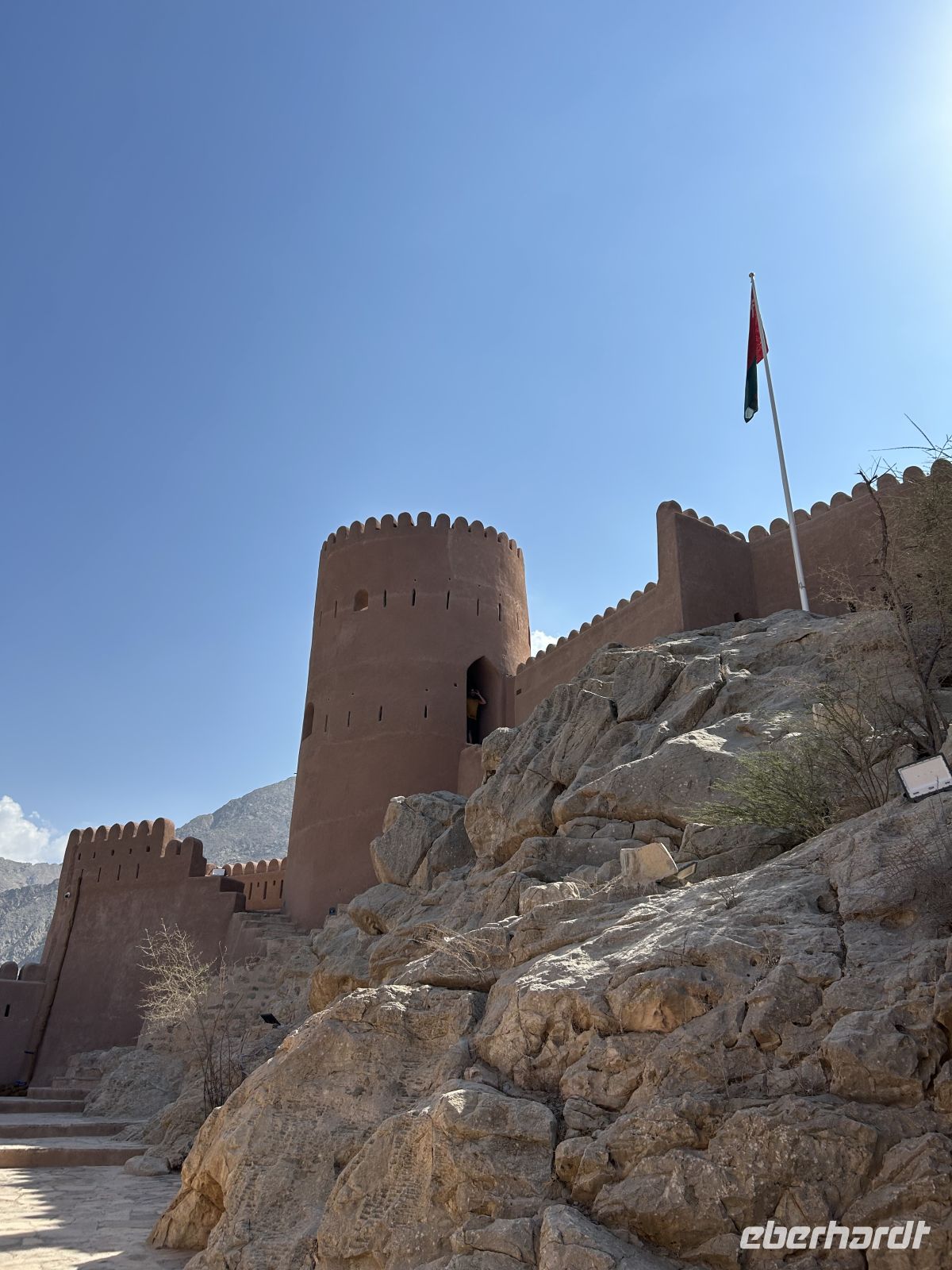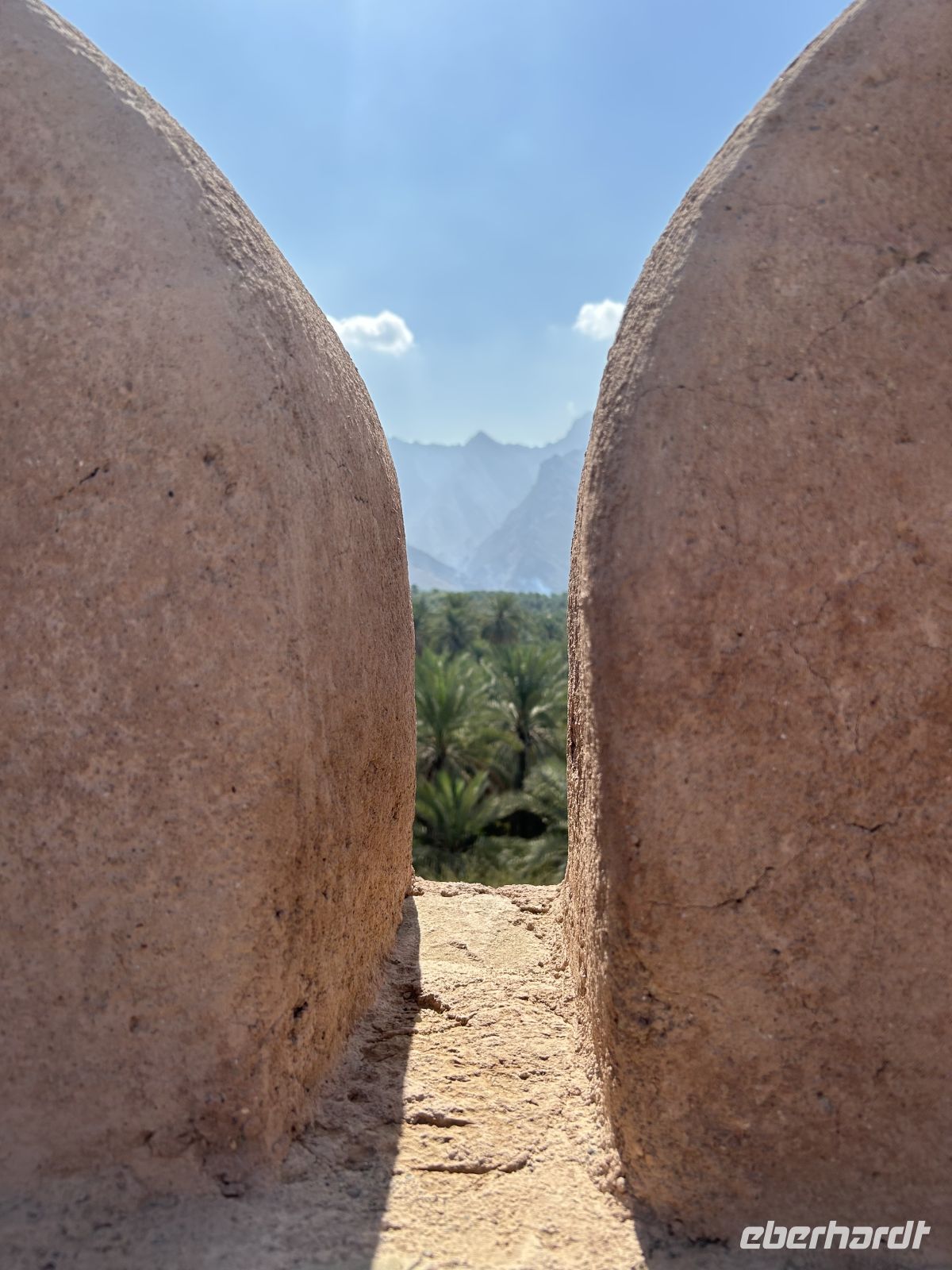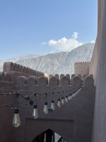 Danach führt uns die Route nach Nakhl, wo das mächtige Fort auf einem Felsen thront. Von den Zinnen aus öffnet sich ein traumhafter Blick über Palmenhaine, Berge und das weitläufige Tal – ein Panorama, das die Kamera kaum einfangen kann.
