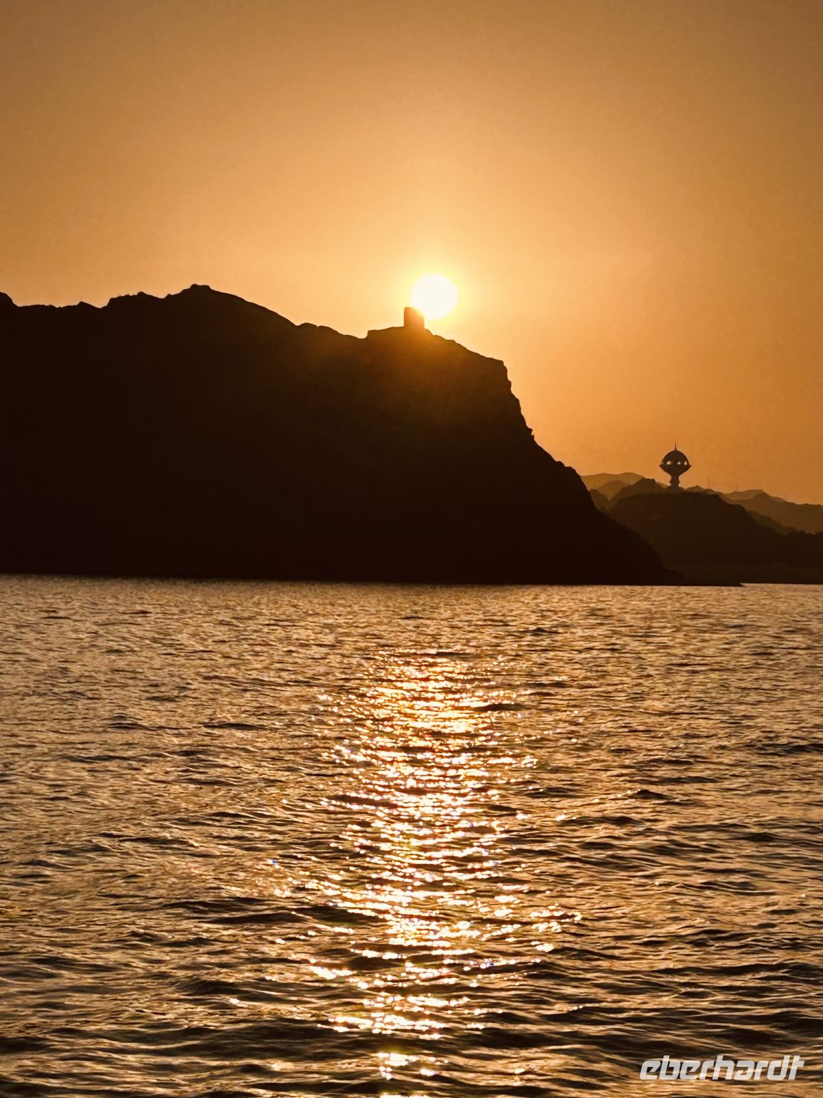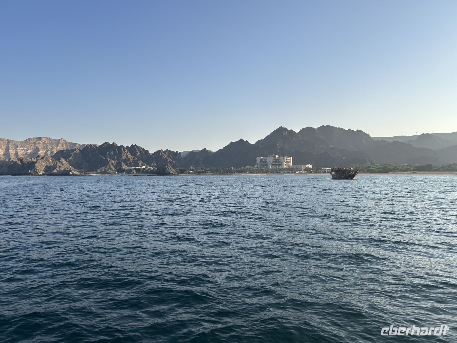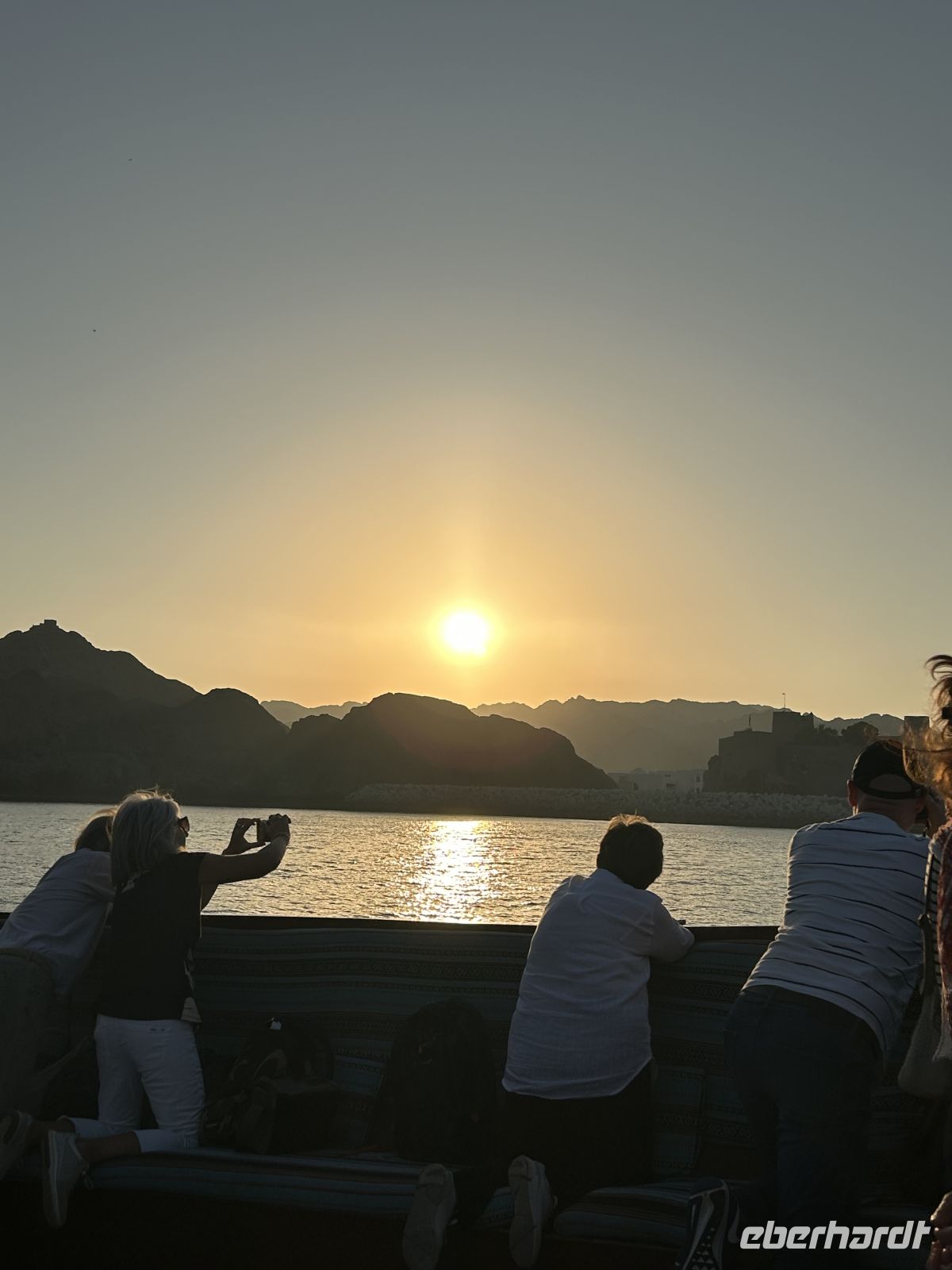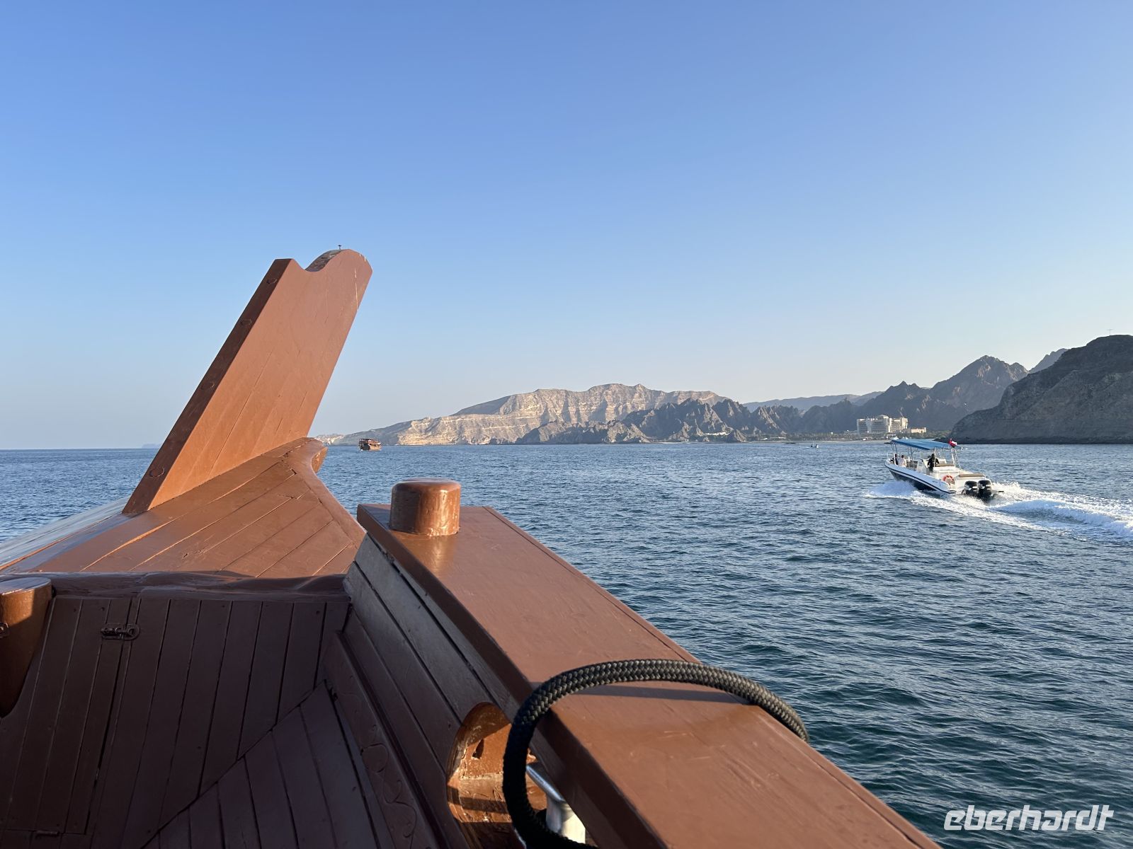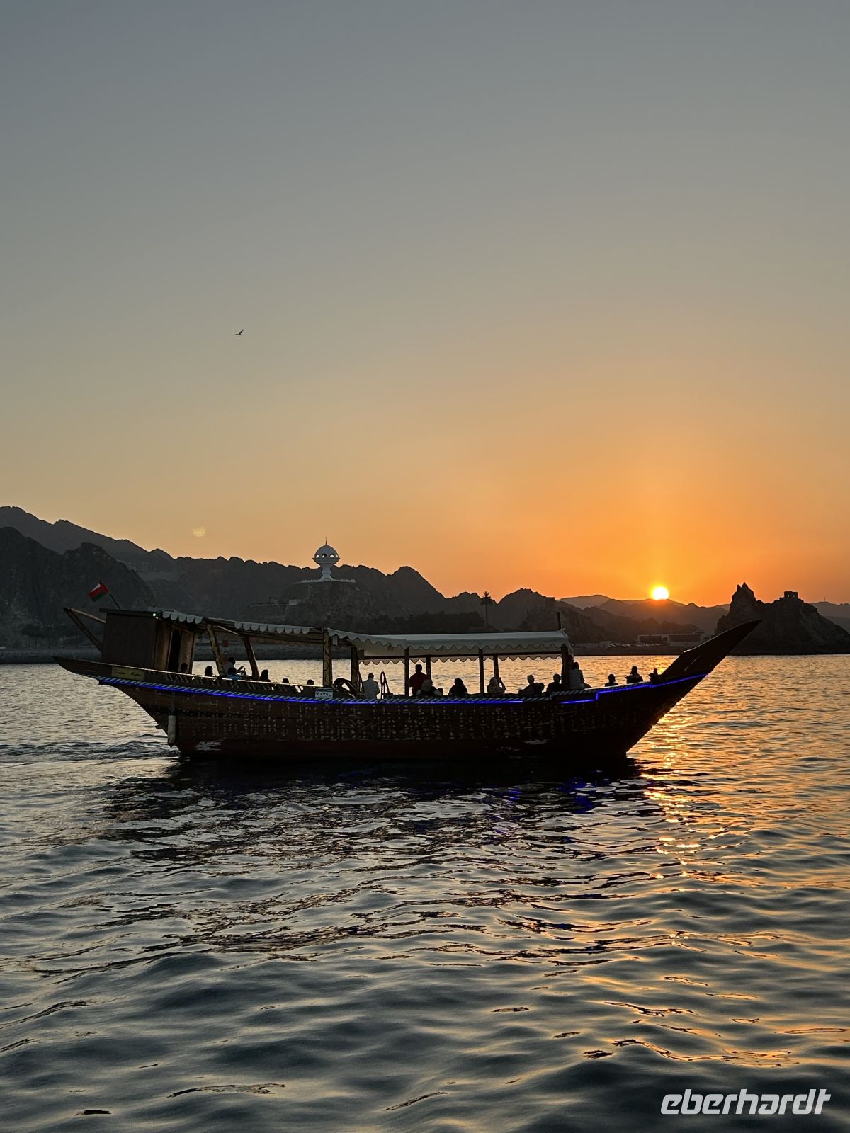Am späten Nachmittag erreichen wir die Marina. Eine traditionelle Dhau wartet bereits auf uns, und als wir ablegen, glitzert das Meer wie flüssiges Silber. Während wir entlang der dramatischen Felsenküste Muscats fahren, sinkt die Sonne langsam hinter den Bergen und taucht alles in ein warmes, goldenes Licht. Es ist einer jener Momente, in denen die Reise plötzlich ganz real wird und man denkt: Ja, genau deshalb bin ich hier.