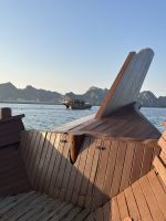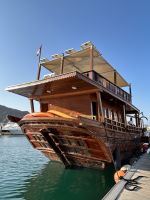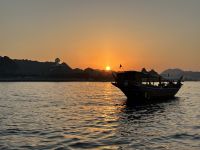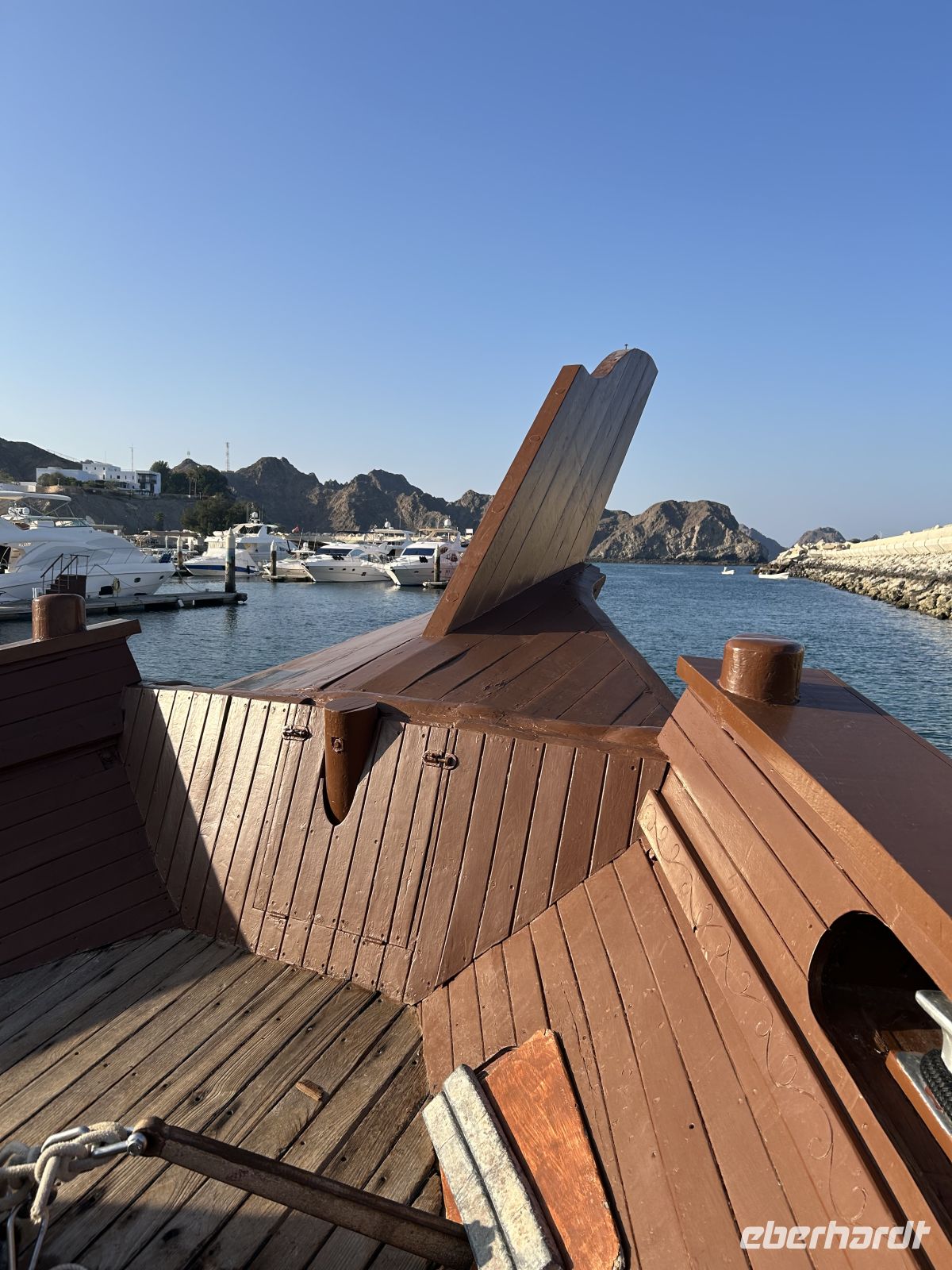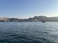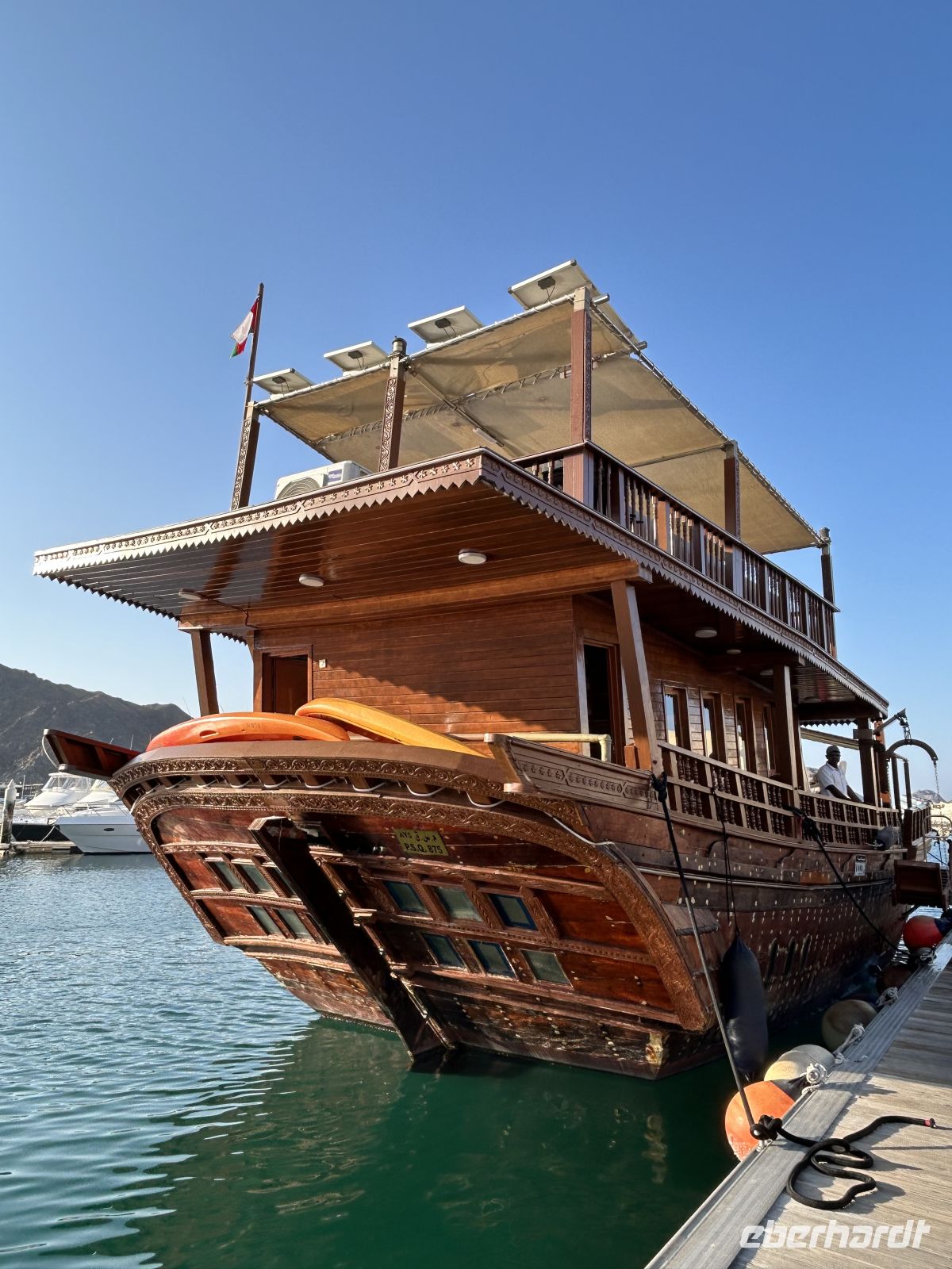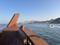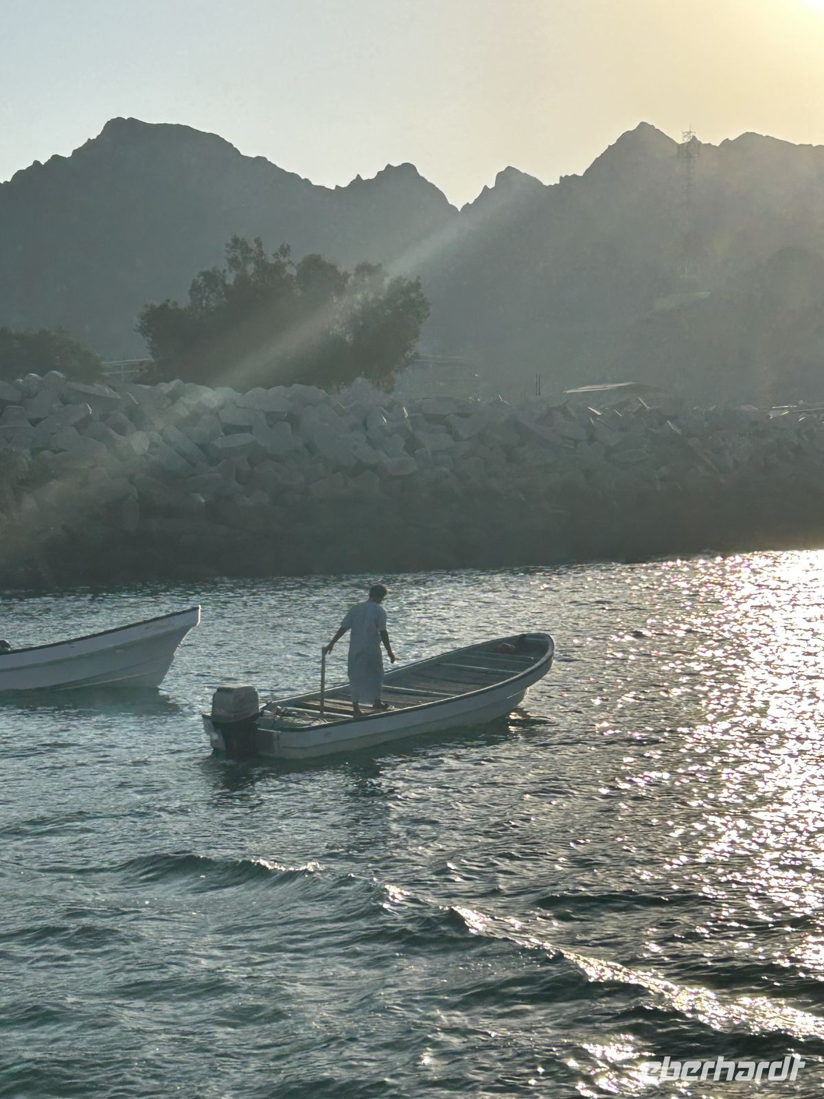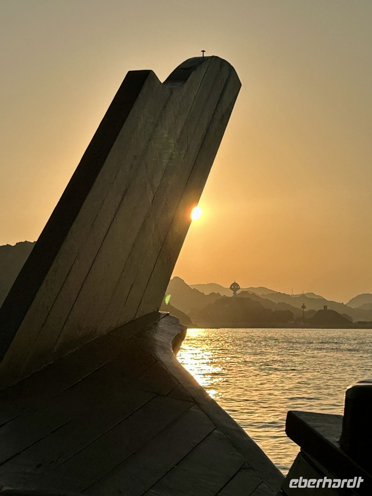 Am späten Nachmittag erreichen wir die Marina. Eine traditionelle Dhau wartet bereits auf uns, und als wir ablegen, glitzert das Meer wie flüssiges Silber. Während wir entlang der dramatischen Felsenküste Muscats fahren, sinkt die Sonne langsam hinter den Bergen und taucht alles in ein warmes, goldenes Licht. Es ist einer jener Momente, in denen die Reise plötzlich ganz real wird und man denkt: Ja, genau deshalb bin ich hier.