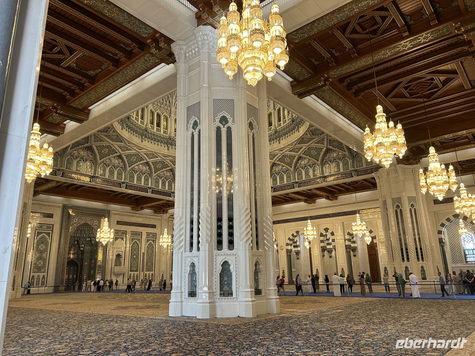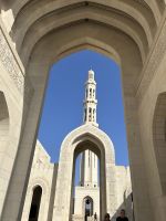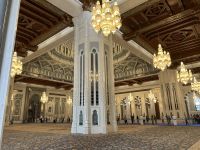 Erster Halt: die Sultan-Qaboos-Moschee, ein Meisterwerk weißer Steinmetzkunst. Die filigranen Bögen, die stillen Innenhöfe und der gigantische Swarowski-Kronleuchter im Gebetssaal beeindrucken uns ebenso wie der gewaltige handgeknüpfte Teppich, der fast den gesamten Raum bedeckt. Ein Ort, der Ruhe und Würde ausstrahlt.