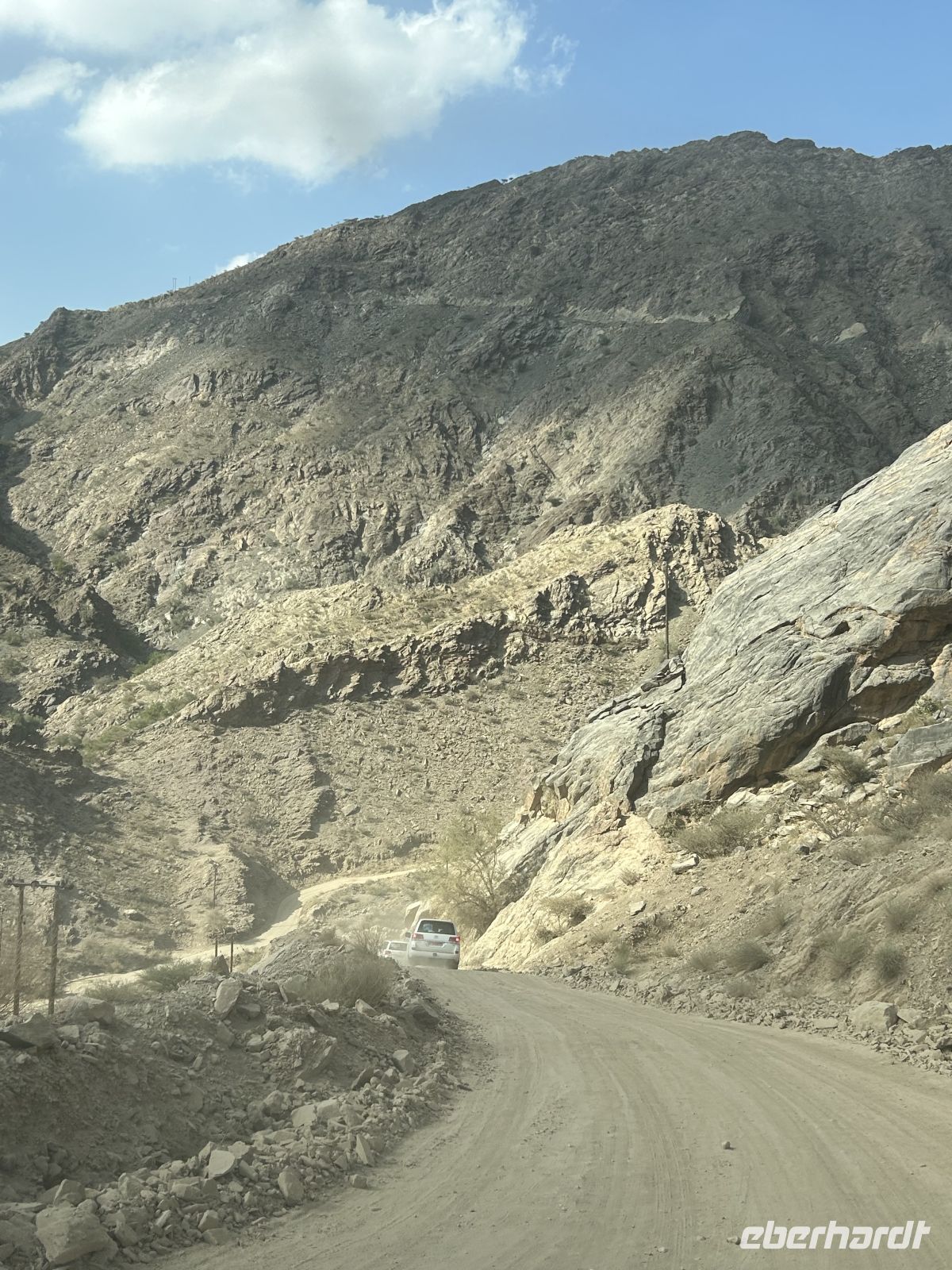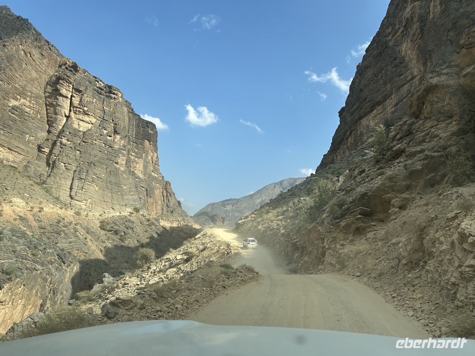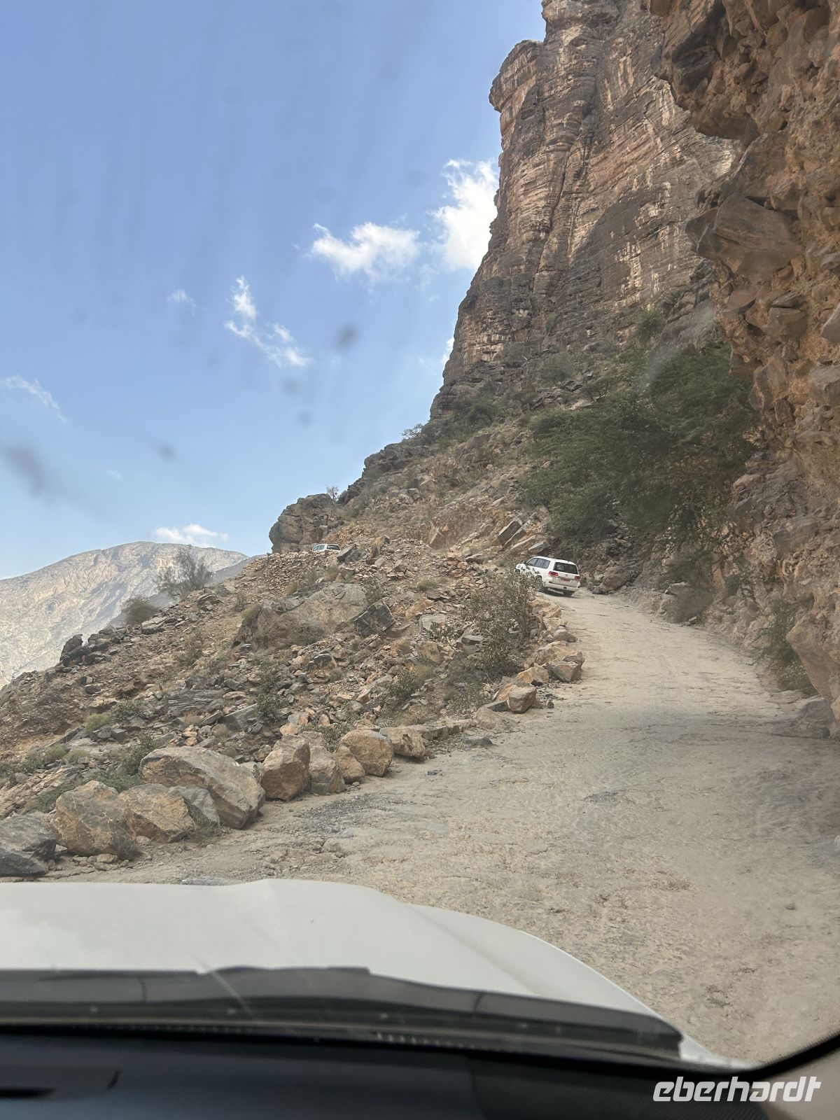 Dann beginnt unser Weg in die Berge. Die Straße wechselt von Asphalt zu Beton – und schließlich zu einer echten Abenteuerpiste. Wir fahren hinein ins spektakuläre Wadi Bani Awf, dessen schroffe Felswände und schmale Passagen uns immer wieder zum Staunen bringen.